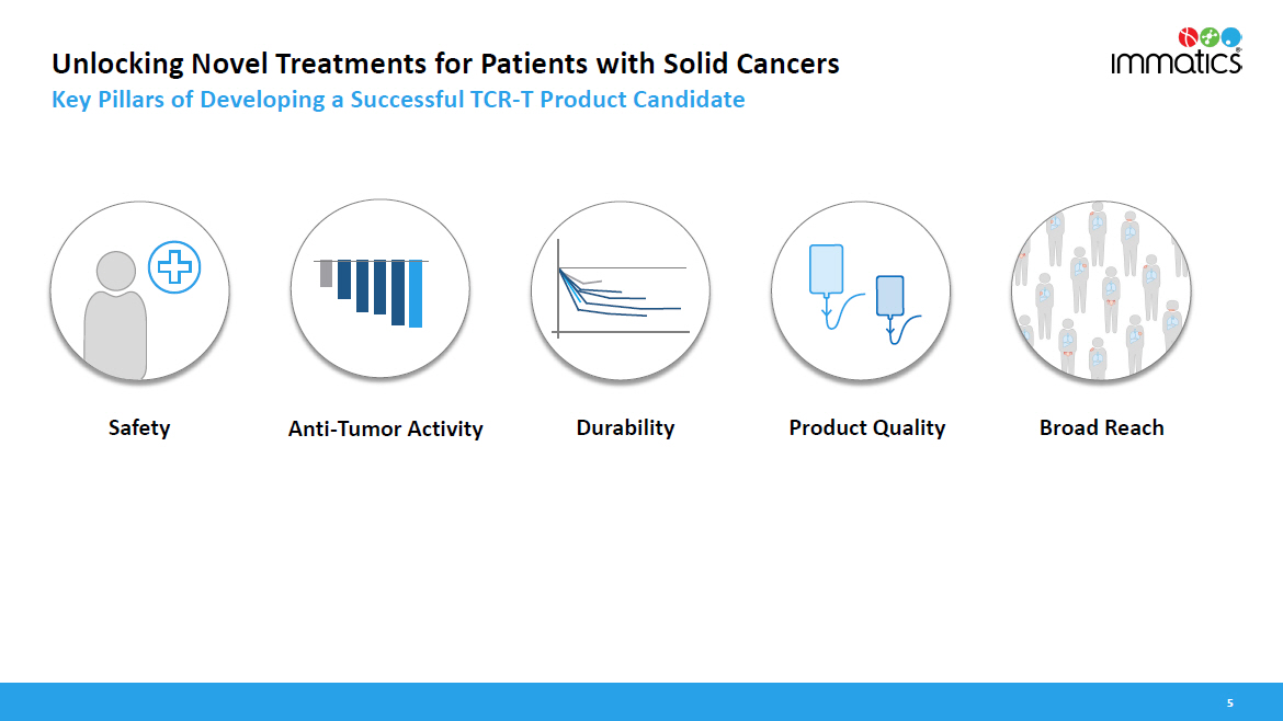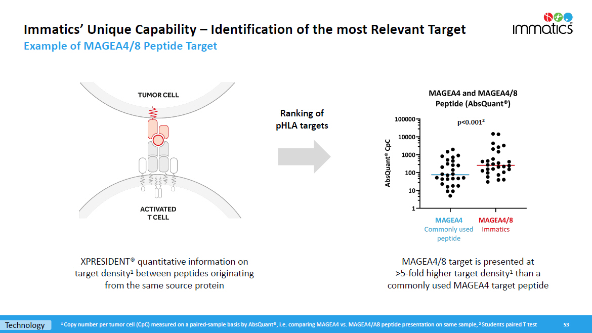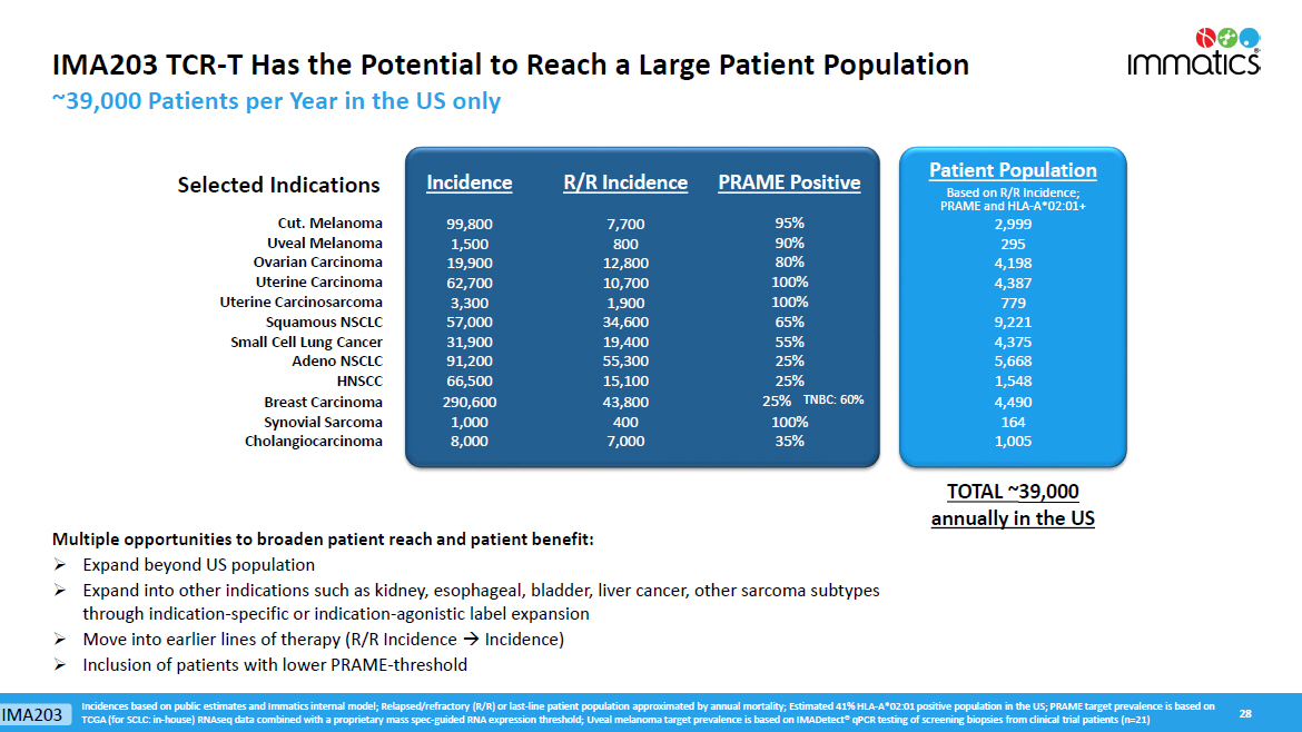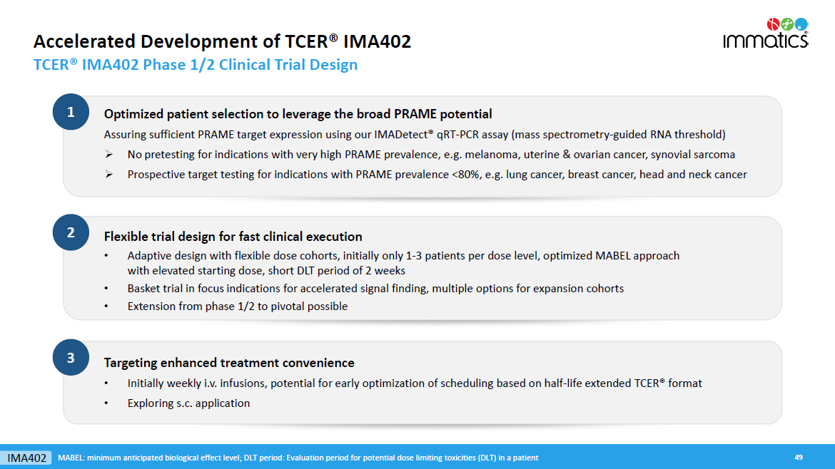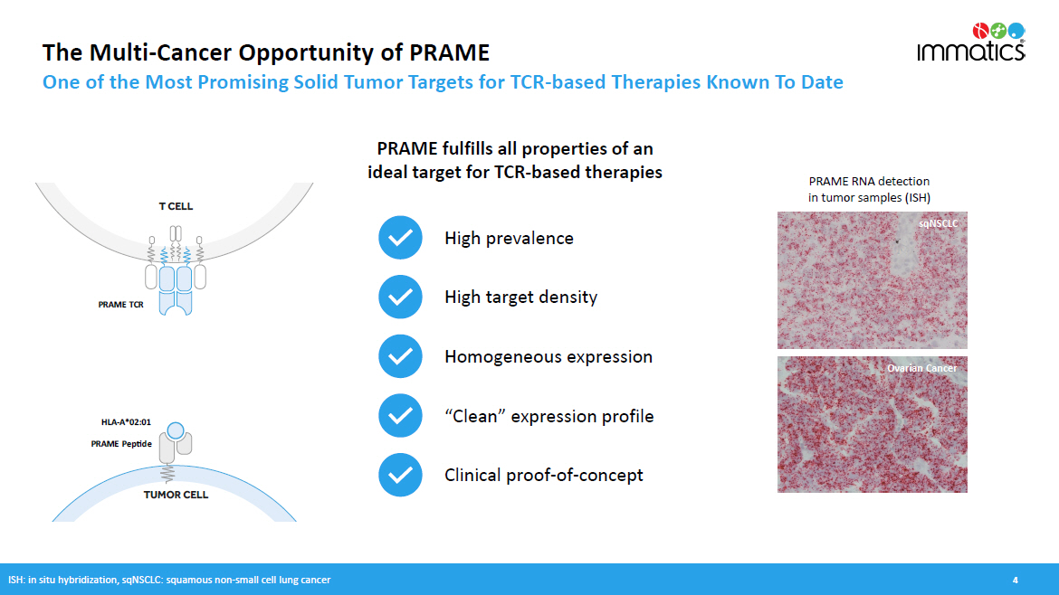 Immatics believes, the results presented today further validate PRAME as one of the most promising solid tumor targets for TCR-based therapies. Immatics’ IMA203 development strategy is based on two pillars aimed initially at a (1) fast-to-market approach and, later at a (2) broad development.