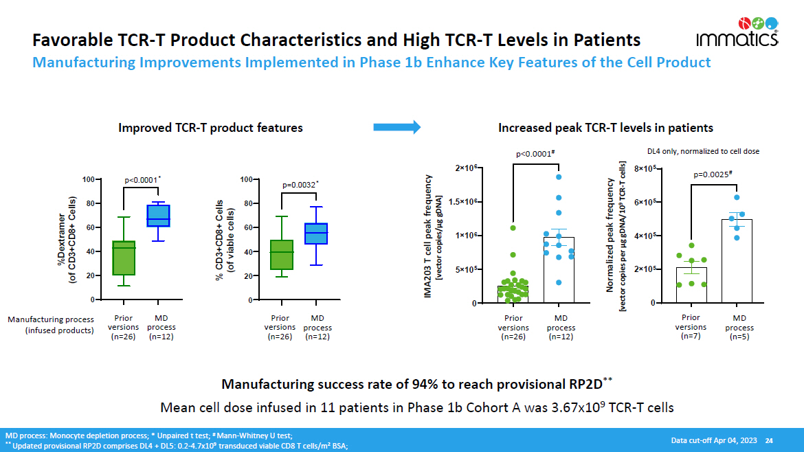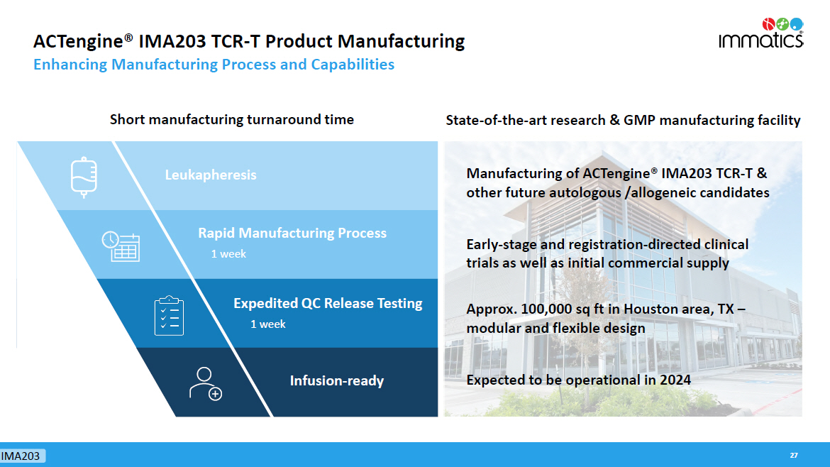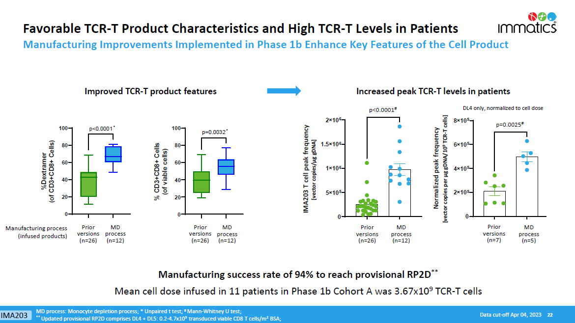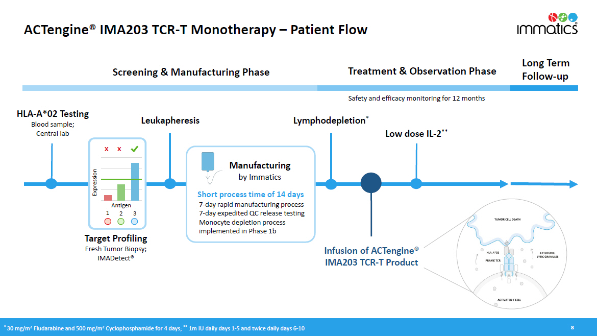 | · | Immatics’ proprietary manufacturing process has a manufacturing time of 7 days (+7-day expedited release testing), with a success rate of 94% in achieving the provisional RP2D. |