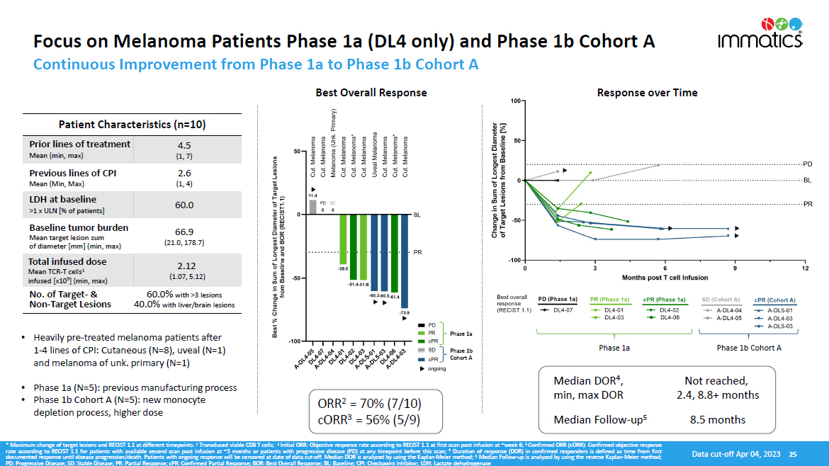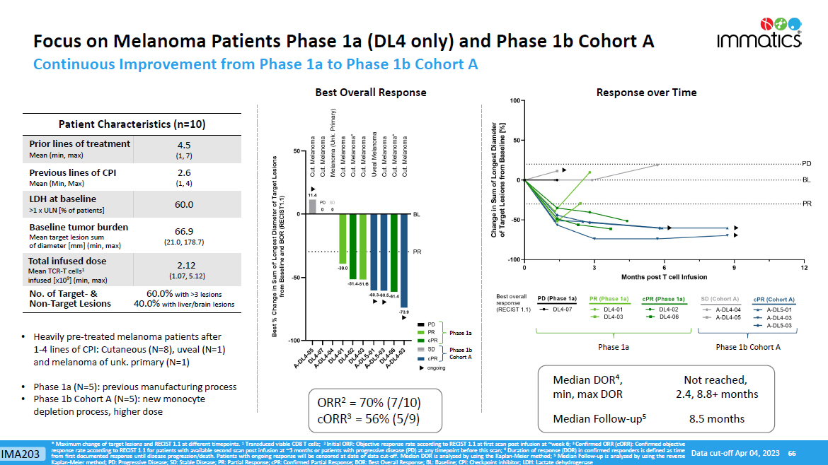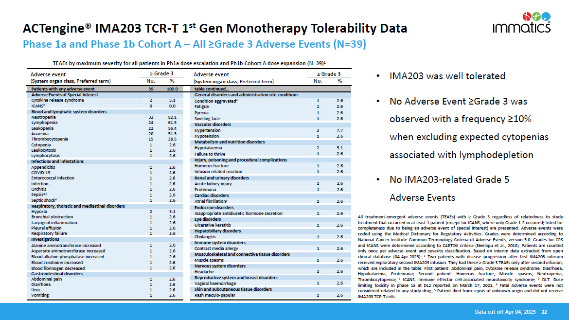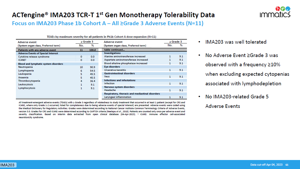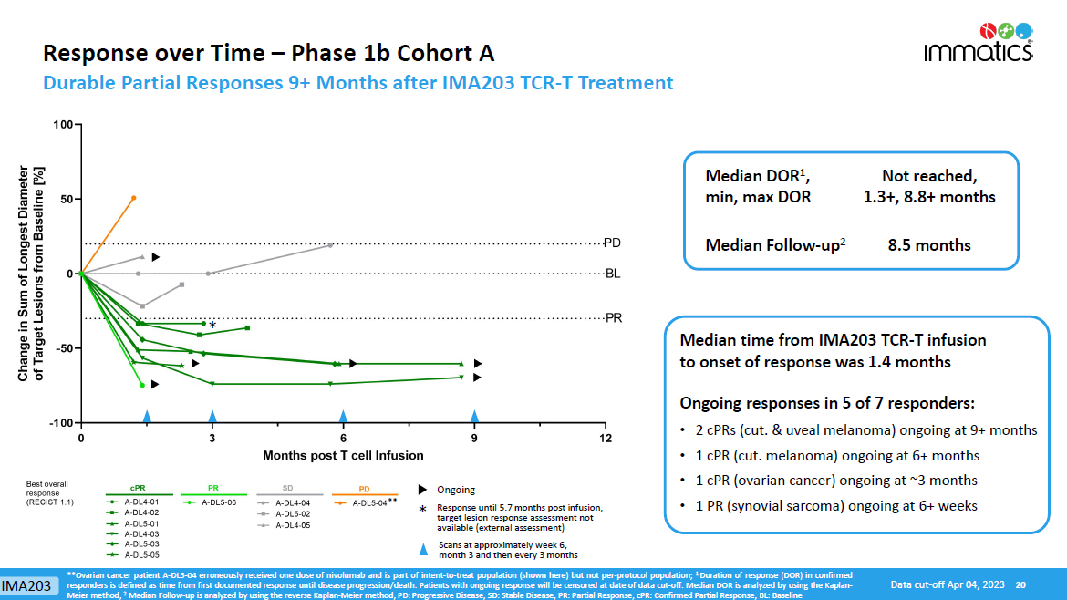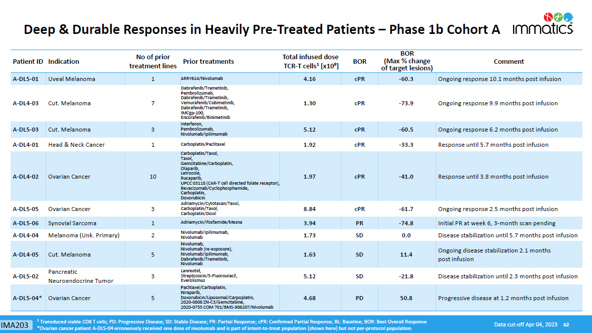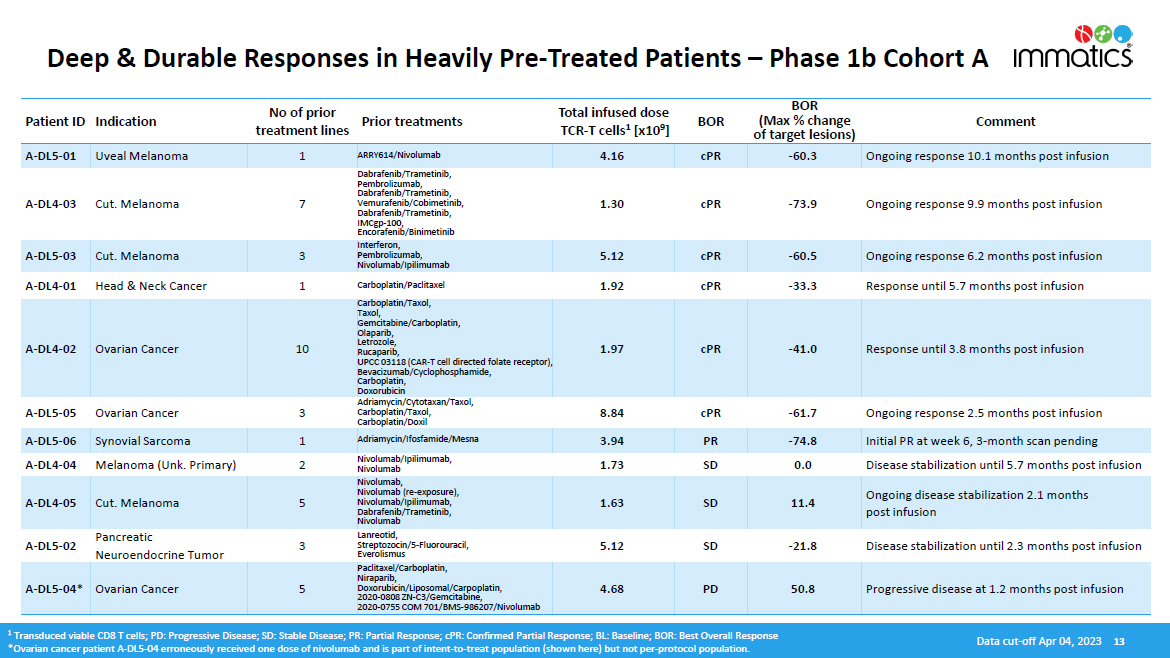 | · | At data cut-off on April 4, 2023, 11 patients were infused with IMA203 TCR-T cells and evaluable for at least one tumor response assessment post treatment. |