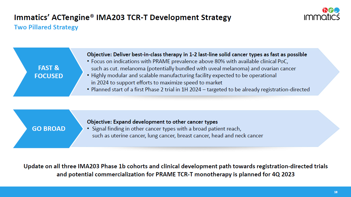 The first objective is to deliver the PRAME-targeted TCR-T cell therapy in 1-2 last-line solid cancer types as fast as possible with a focus on indications with PRAME prevalence above 80% and where clinical proof-of-concept has been demonstrated, such as cutaneous melanoma (potentially bundled with uveal melanoma) and/or ovarian cancer. The buildout of the manufacturing facility will support Immatics’ efforts to maximize speed to market. Immatics plans to start a first Phase 2 trial in 1H 2024, which is intended be to designed as a registration-directed trial.