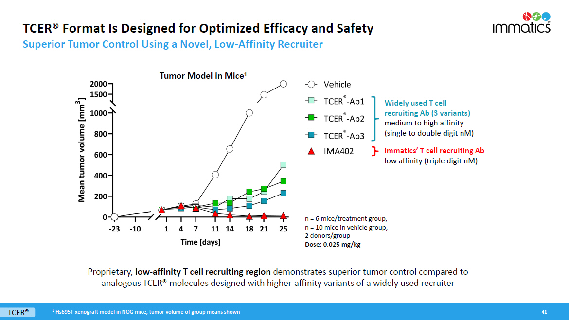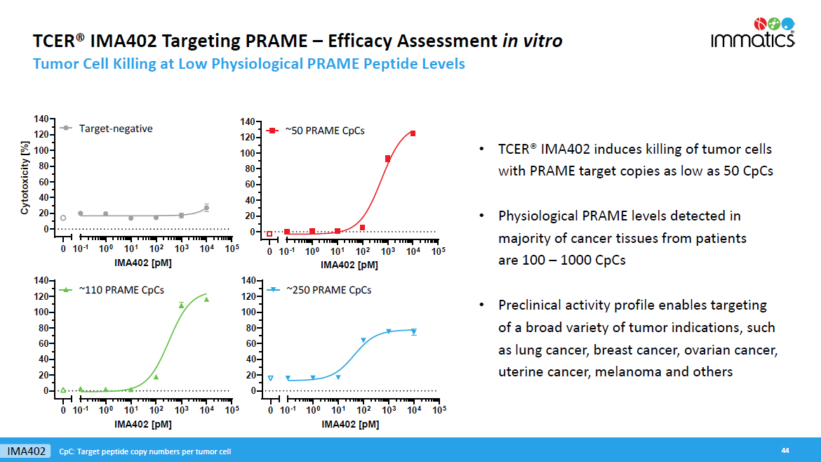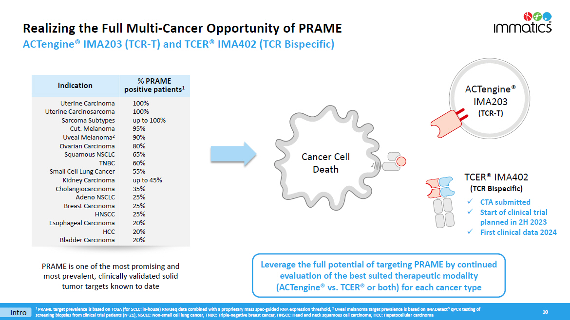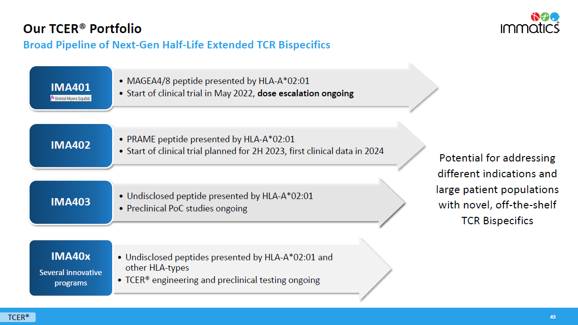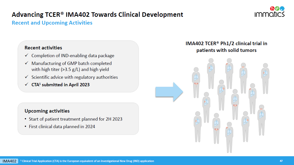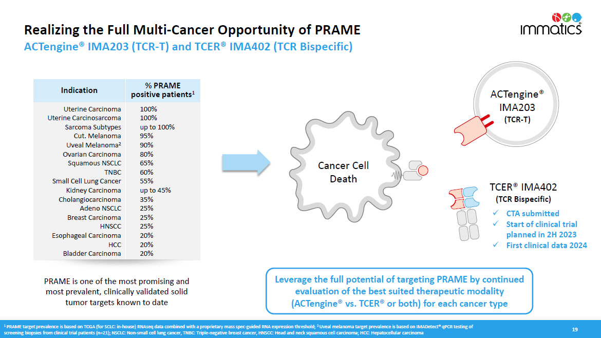 In addition to ACTengine® TCR-T, Immatics is addressing PRAME-positive cancers with a second therapeutic modality, TCR Bispecifics (TCER®), to leverage the full potential of the multi-cancer opportunity PRAME. Immatics’ TCER® IMA402 is a next-generation, half-life extended TCR Bispecific for which Immatics submitted a clinical trial application (CTA) to the Paul-Ehrlich-Institute (PEI) on April 14, 2023 to initiate the Phase 1/2 trial. The trial is expected to commence in 2H 2023 with first clinical data planned in 2024.