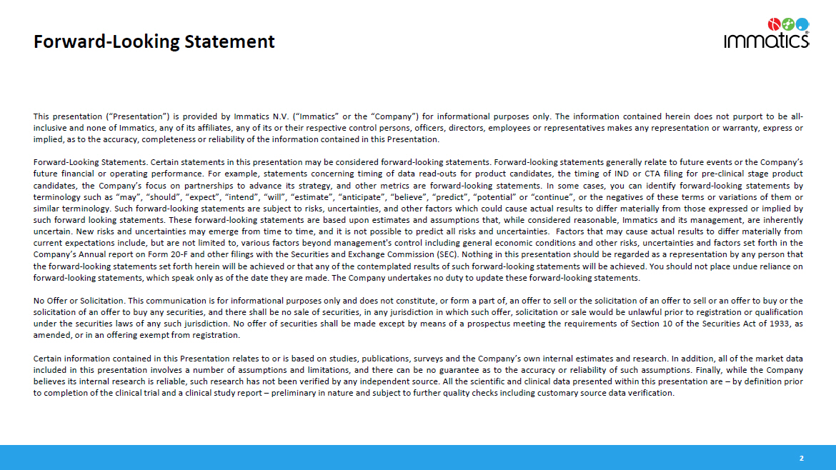 Certain statements in this Report on Form 6-K may be considered forward-looking statements. Forward-looking statements generally relate to future events or Immatics’ future financial or operating performance. For example, statements concerning the timing of product candidates and Immatics’ focus on partnerships to advance its strategy