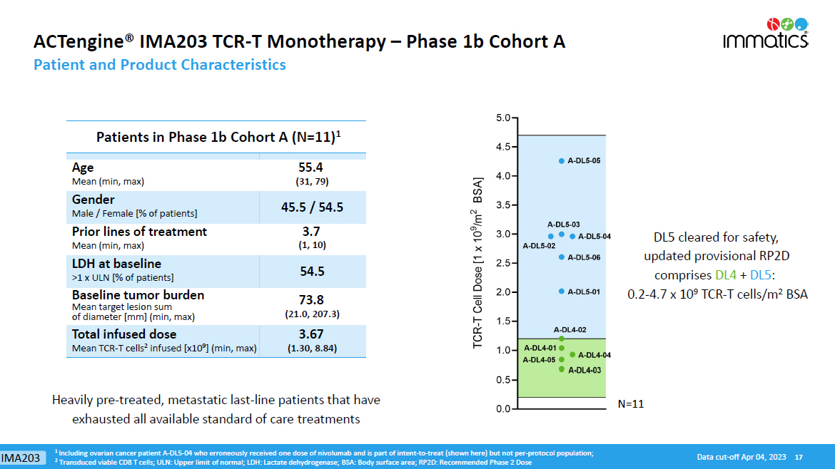 | · | At data cut-off on April 4, 2023, 11 PRAME-positive patients were infused with IMA203 TCR-T cells at dose level (DL) 4 or DL5 with a mean total infused dose of 3.67x109 TCR-T cells (range 1.30-8.84x109 TCR-T cells). |