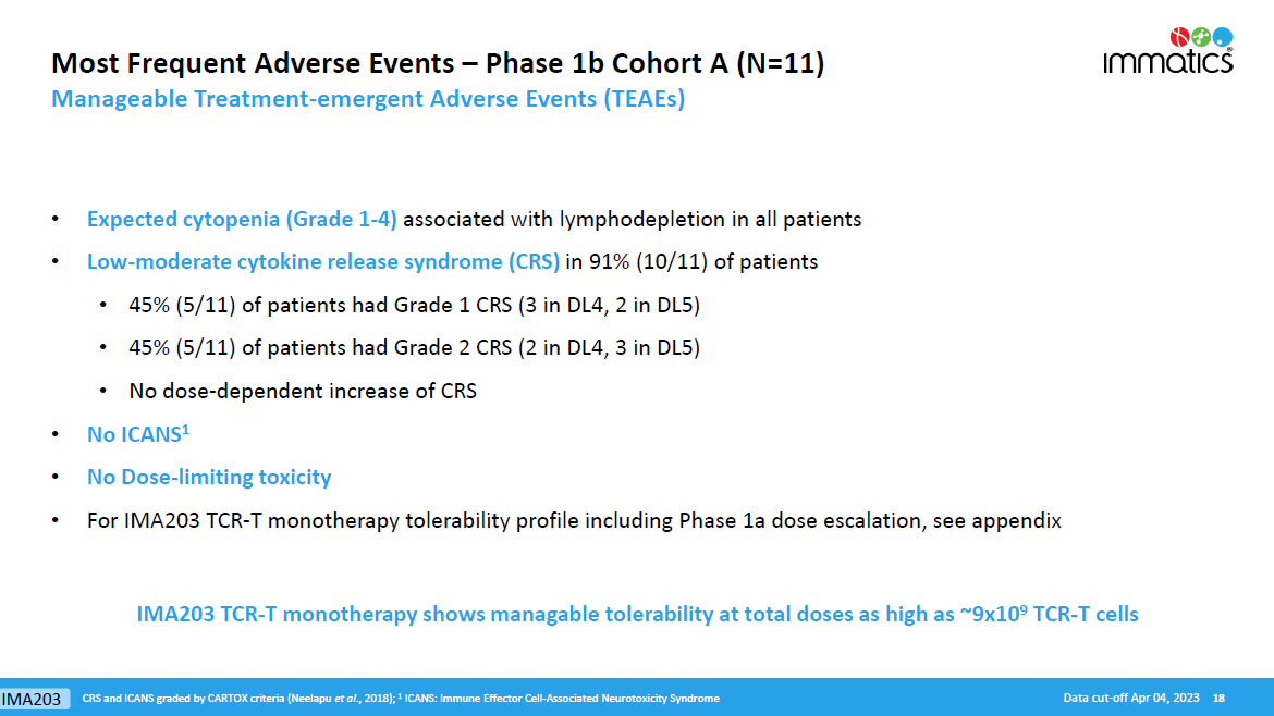 | · | All 11 patients experienced expected cytopenia (Grade 1-4) associated with lymphodepletion. 10 patients (91%) had a low to moderate (Grade 1-2) cytokine release syndrome (CRS), of which 5 patients (45%) had Grade 1, and 5 patients (45%) had Grade 2 CRS. No high-grade (Grade 3 or higher) CRS and no immune effector cell associated neurotoxicity syndrome (ICANS) were observed in any of these 11 patients. No dose-dependent increase of CRS was observed across Phase 1a and Phase 1b Cohort A (N=38 patients infused with IMA203 in total). |