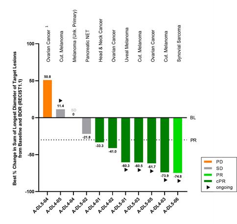 1 Ovarian cancer patient A-DL5-04 erroneously received one dose of nivolumab and is part of intent-to-treat population (shown here) but not per-protocol population; NET: Neuroendocrine Tumor; PD: Progressive disease; SD: Stable disease; PR: Partial response; cPR: Confirmed partial response; BL: Baseline; BOR: Best Overall Response