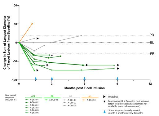 | · | Initial objective response rate (ORR) of 64% (7/11) was observed at ~week 6 (partial responses, PR, according to RECIST 1.1). |