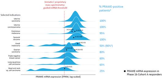 PRAME target expression distribution (blue histogram) based on TCGA RNAseq data, patient data (black dots) based on IMADetect® qPCR testing of screening biopsies; 1 PRAME target prevalence is based on TCGA RNAseq data combined with a proprietary MS-guided RNA expression threshold; 2 PRAME target prevalence in uveal melanoma based on IMADetect® qPCR testing of screening biopsies from clinical trial patients (n=21) demonstrates substantial higher prevalence of 90% compared to prevalence based on TCGA data of 50%, TCGA: early & late-stage primary tumor samples, Immatics clinical trials: late-stage/metastatic tumor samples, Role of PRAME in metastasis of uveal melanoma: Field et al. 2016 Clinical Cancer Research; MS: Mass spectrometry.