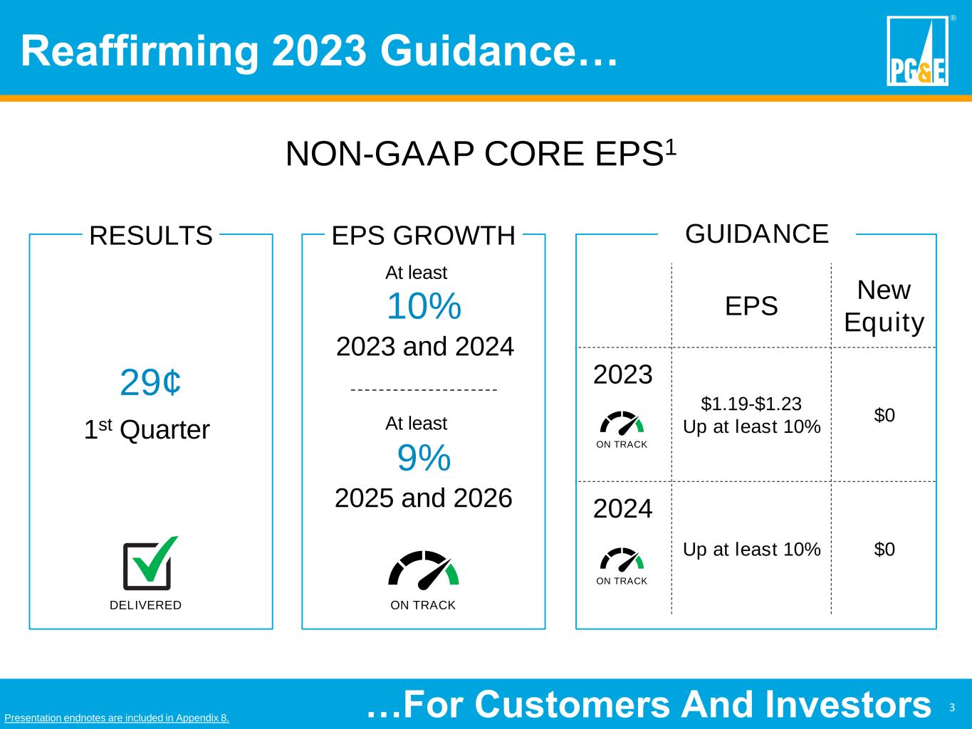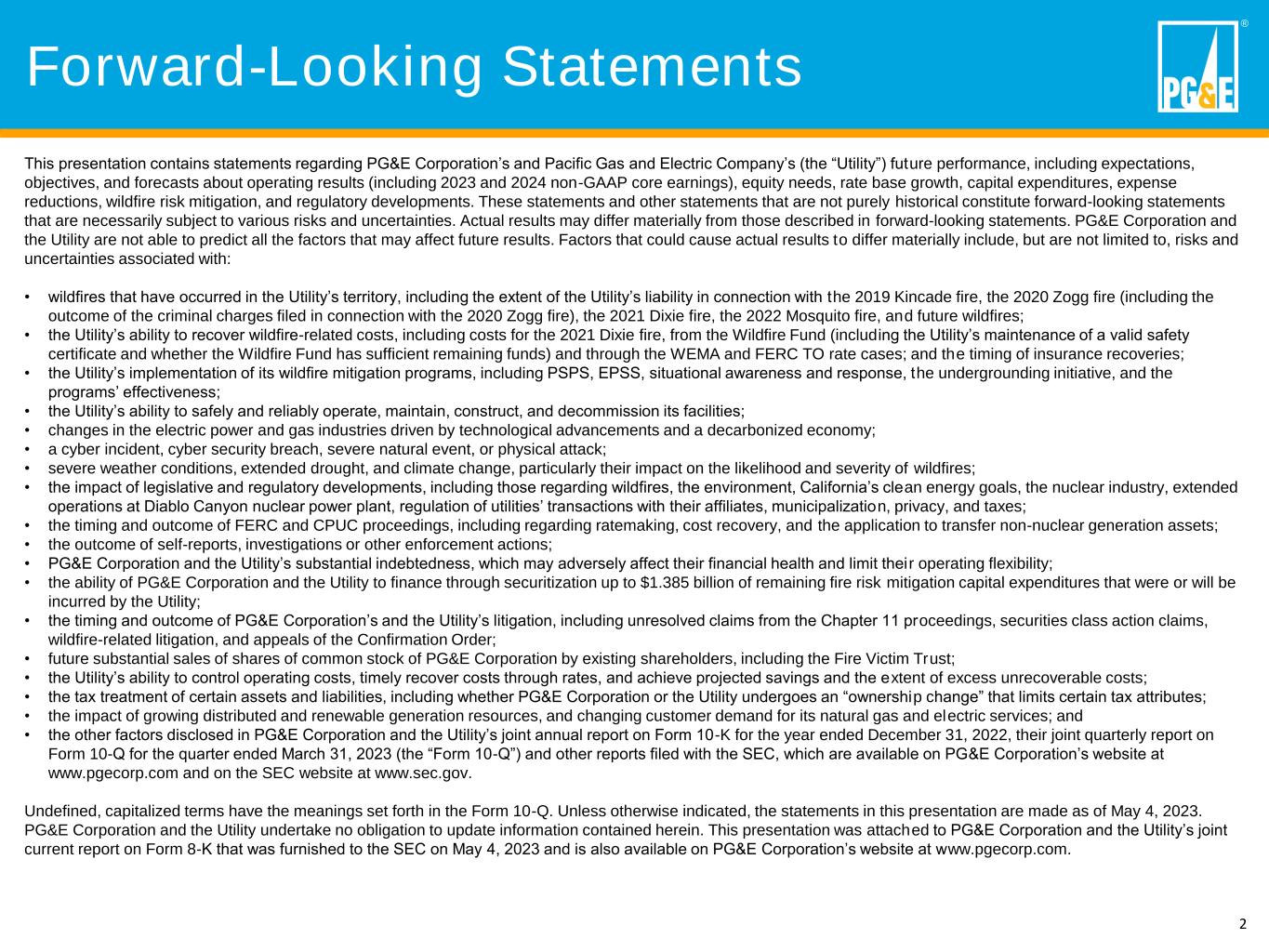 ® 2 This presentation contains statements regarding PG&E Corporation’s and Pacific Gas and Electric Company’s (the “Utility”) future performance, including expectations, objectives, and forecasts about operating results (including 2023 and 2024 non-GAAP core earnings), equity needs, rate base growth, capital expenditures, expense reductions, wildfire risk mitigation, and regulatory developments. These statements and other statements that are not purely historical constitute forward-looking statements that are necessarily subject to various risks and uncertainties. Actual results may differ materially from those described in forward-looking statements. PG&E Corporation and the Utility are not able to predict all the factors that may affect future results. Factors that could cause actual results to differ materially include, but are not limited to, risks and uncertainties associated with: • wildfires that have occurred in the Utility’s territory, including the extent of the Utility’s liability in connection with the 2019 Kincade fire, the 2020 Zogg fire (including the outcome of the criminal charges filed in connection with the 2020 Zogg fire), the 2021 Dixie fire, the 2022 Mosquito fire, and future wildfires; • the Utility’s ability to recover wildfire-related costs, including costs for the 2021 Dixie fire, from the Wildfire Fund (including the Utility’s maintenance of a valid safety certificate and whether the Wildfire Fund has sufficient remaining funds) and through the WEMA and FERC TO rate cases; and the timing of insurance recoveries; • the Utility’s implementation of its wildfire mitigation programs, including PSPS, EPSS, situational awareness and response, the undergrounding initiative, and the programs’ effectiveness; • the Utility’s ability to safely and reliably operate, maintain, construct, and decommission its facilities; • changes in the electric power and gas industries driven by technological advancements and a decarbonized economy; • a cyber incident, cyber security breach, severe natural event, or physical attack; • severe weather conditions, extended drought, and climate change, particularly their impact on the likelihood and severity of wildfires; • the impact of legislative and regulatory developments, including those regarding wildfires, the environment, California’s clean energy goals, the nuclear industry, extended operations at Diablo Canyon nuclear power plant, regulation of utilities’ transactions with their affiliates, municipalization, privacy, and taxes; • the timing and outcome of FERC and CPUC proceedings, including regarding ratemaking, cost recovery, and the application to transfer non-nuclear generation assets; • the outcome of self-reports, investigations or other enforcement actions; • PG&E Corporation and the Utility’s substantial indebtedness, which may adversely affect their financial health and limit their operating flexibility; • the ability of PG&E Corporation and the Utility to finance through securitization up to $1.385 billion of remaining fire risk mitigation capital expenditures that were or will be incurred by the Utility; • the timing and outcome of PG&E Corporation’s and the Utility’s litigation, including unresolved claims from the Chapter 11 proceedings, securities class action claims, wildfire-related litigation, and appeals of the Confirmation Order; • future substantial sales of shares of common stock of PG&E Corporation by existing shareholders, including the Fire Victim Trust; • the Utility’s ability to control operating costs, timely recover costs through rates, and achieve projected savings and the extent of excess unrecoverable costs; • the tax treatment of certain assets and liabilities, including whether PG&E Corporation or the Utility undergoes an “ownership change” that limits certain tax attributes; • the impact of growing distributed and renewable generation resources, and changing customer demand for its natural gas and electric services; and • the other factors disclosed in PG&E Corporation and the Utility’s joint annual report on Form 10-K for the year ended December 31, 2022, their joint quarterly report on Form 10-Q for the quarter ended March 31, 2023 (the “Form 10-Q”) and other reports filed with the SEC, which are available on PG&E Corporation’s website at www.pgecorp.com and on the SEC website at www.sec.gov. Undefined, capitalized terms have the meanings set forth in the Form 10-Q. Unless otherwise indicated, the statements in this presentation are made as of May 4, 2023. PG&E Corporation and the Utility undertake no obligation to update information contained herein. This presentation was attached to PG&E Corporation and the Utility’s joint current report on Form 8-K that was furnished to the SEC on May 4, 2023 and is also available on PG&E Corporation’s website at www.pgecorp.com. Forward-Looking Statements