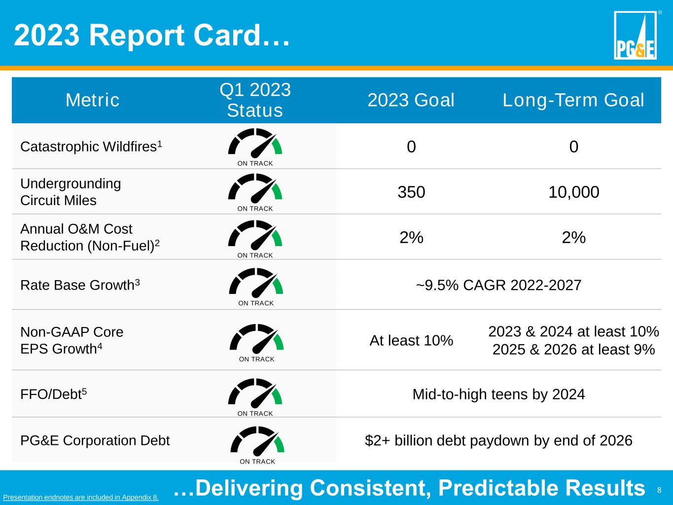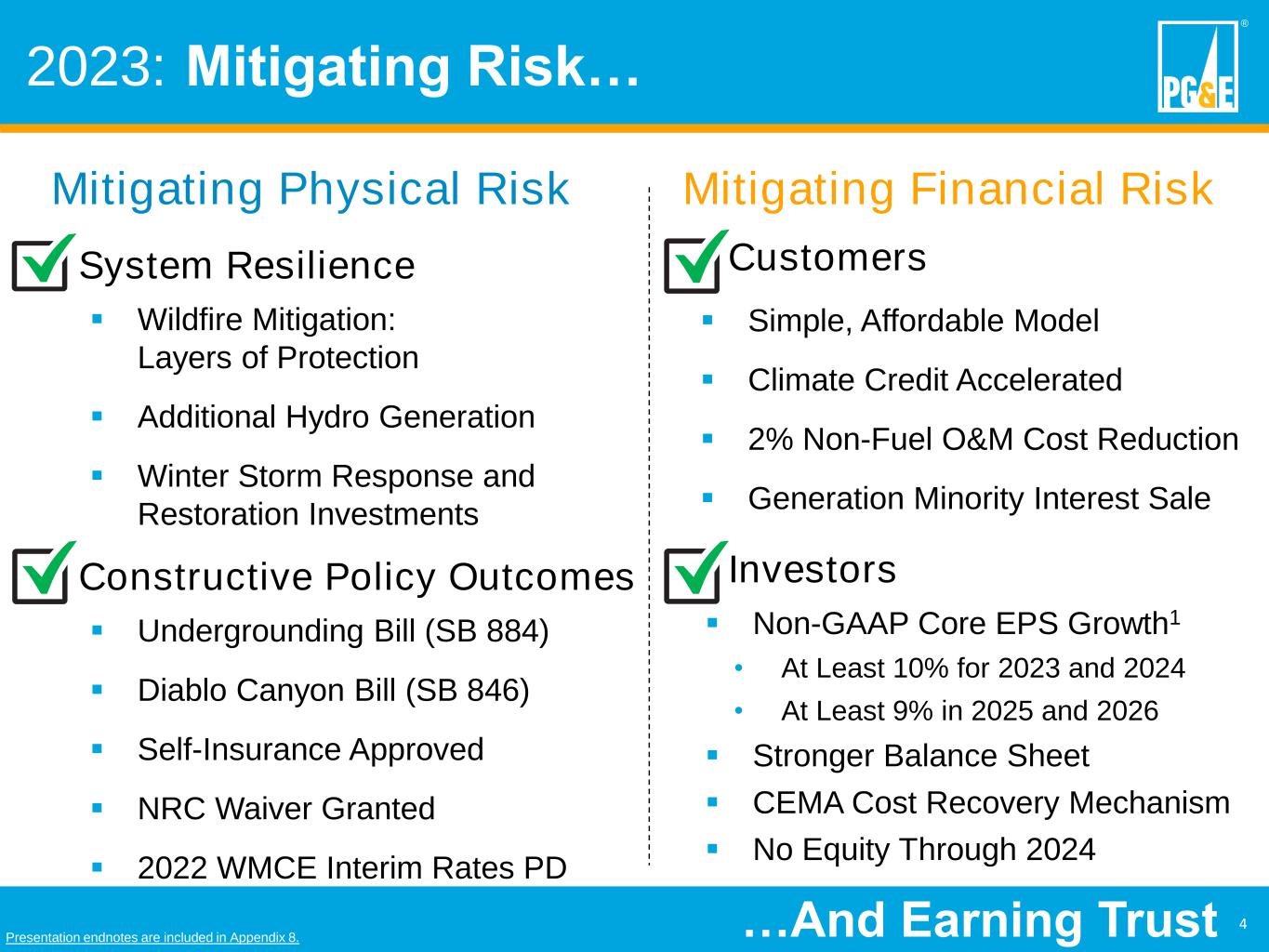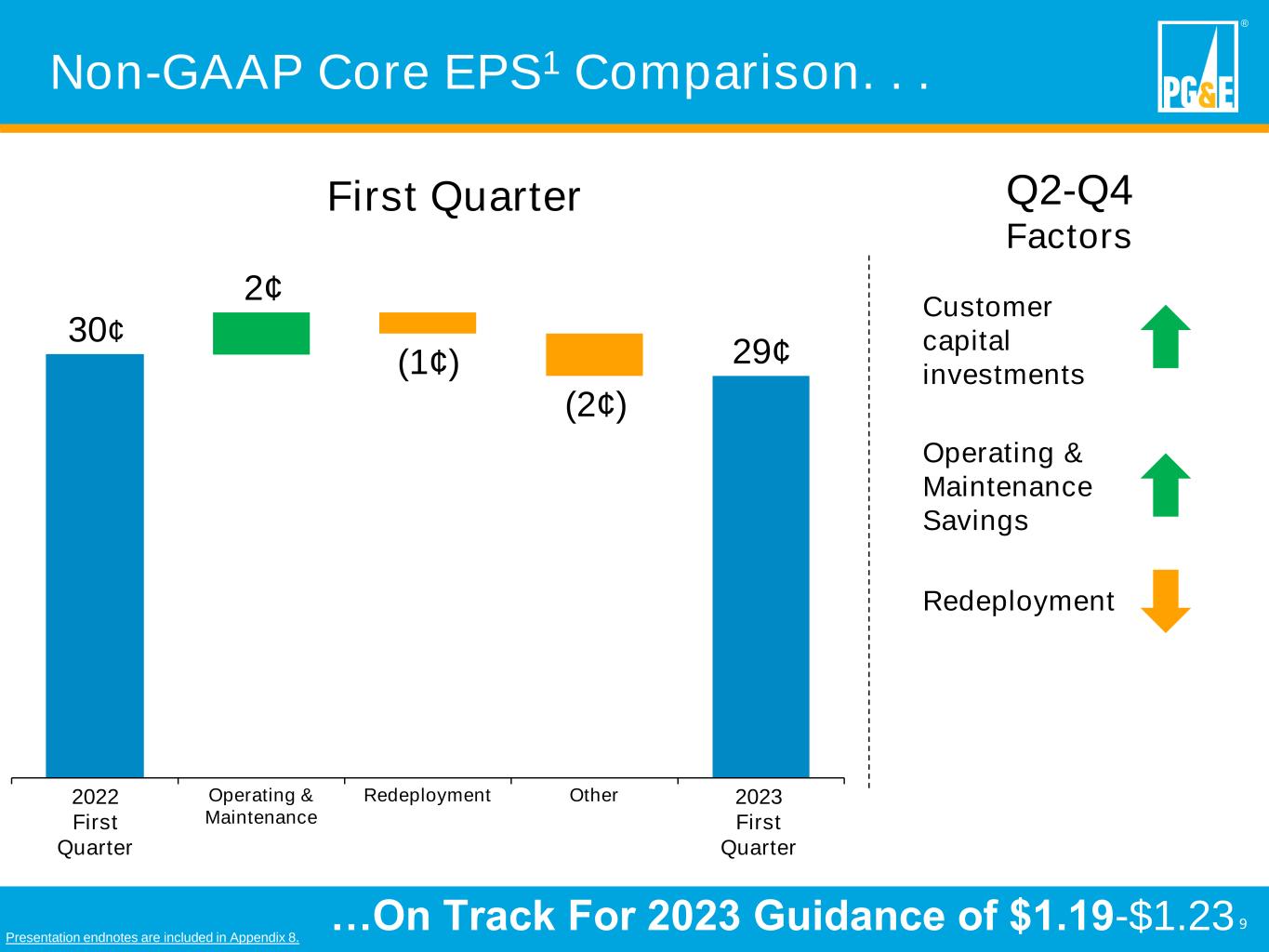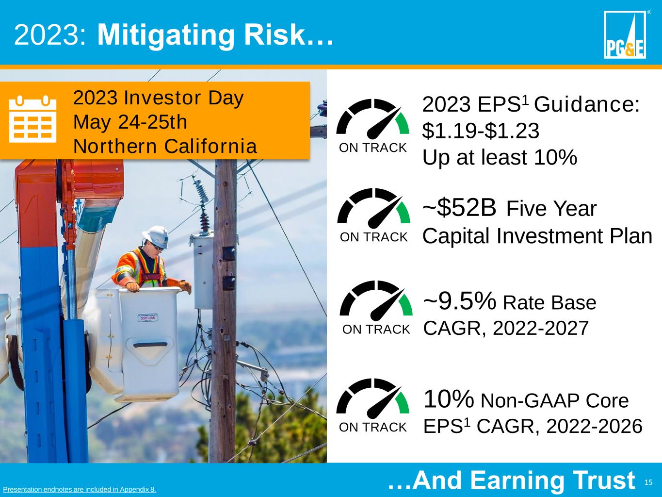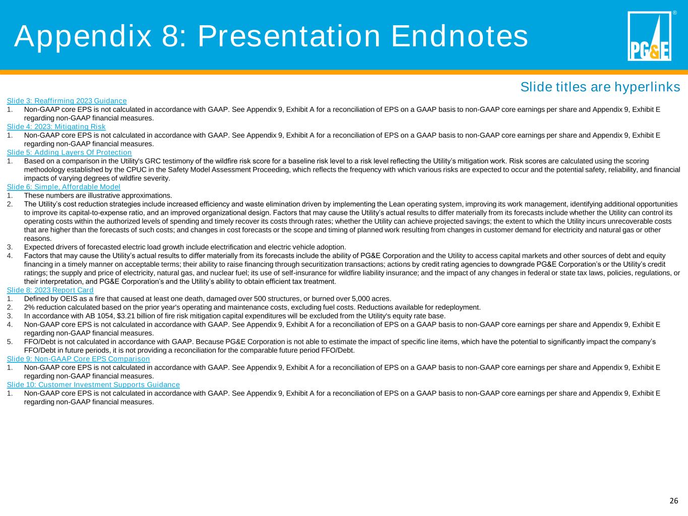 ® 26 Slide titles are hyperlinks Slide 3: Reaffirming 2023 Guidance 1. Non-GAAP core EPS is not calculated in accordance with GAAP. See Appendix 9, Exhibit A for a reconciliation of EPS on a GAAP basis to non-GAAP core earnings per share and Appendix 9, Exhibit E regarding non-GAAP financial measures. Slide 4: 2023: Mitigating Risk 1. Non-GAAP core EPS is not calculated in accordance with GAAP. See Appendix 9, Exhibit A for a reconciliation of EPS on a GAAP basis to non-GAAP core earnings per share and Appendix 9, Exhibit E regarding non-GAAP financial measures. Slide 5: Adding Layers Of Protection 1. Based on a comparison in the Utility's GRC testimony of the wildfire risk score for a baseline risk level to a risk level reflecting the Utility’s mitigation work. Risk scores are calculated using the scoring methodology established by the CPUC in the Safety Model Assessment Proceeding, which reflects the frequency with which various risks are expected to occur and the potential safety, reliability, and financial impacts of varying degrees of wildfire severity. Slide 6: Simple, Affordable Model 1. These numbers are illustrative approximations. 2. The Utility’s cost reduction strategies include increased efficiency and waste elimination driven by implementing the Lean operating system, improving its work management, identifying additional opportunities to improve its capital-to-expense ratio, and an improved organizational design. Factors that may cause the Utility’s actual results to differ materially from its forecasts include whether the Utility can control its operating costs within the authorized levels of spending and timely recover its costs through rates; whether the Utility can achieve projected savings; the extent to which the Utility incurs unrecoverable costs that are higher than the forecasts of such costs; and changes in cost forecasts or the scope and timing of planned work resulting from changes in customer demand for electricity and natural gas or other reasons. 3. Expected drivers of forecasted electric load growth include electrification and electric vehicle adoption. 4. Factors that may cause the Utility’s actual results to differ materially from its forecasts include the ability of PG&E Corporation and the Utility to access capital markets and other sources of debt and equity financing in a timely manner on acceptable terms; their ability to raise financing through securitization transactions; actions by credit rating agencies to downgrade PG&E Corporation’s or the Utility’s credit ratings; the supply and price of electricity, natural gas, and nuclear fuel; its use of self-insurance for wildfire liability insurance; and the impact of any changes in federal or state tax laws, policies, regulations, or their interpretation, and PG&E Corporation’s and the Utility’s ability to obtain efficient tax treatment. Slide 8: 2023 Report Card 1. Defined by OEIS as a fire that caused at least one death, damaged over 500 structures, or burned over 5,000 acres. 2. 2% reduction calculated based on the prior year's operating and maintenance costs, excluding fuel costs. Reductions available for redeployment. 3. In accordance with AB 1054, $3.21 billion of fire risk mitigation capital expenditures will be excluded from the Utility's equity rate base. 4. Non-GAAP core EPS is not calculated in accordance with GAAP. See Appendix 9, Exhibit A for a reconciliation of EPS on a GAAP basis to non-GAAP core earnings per share and Appendix 9, Exhibit E regarding non-GAAP financial measures. 5. FFO/Debt is not calculated in accordance with GAAP. Because PG&E Corporation is not able to estimate the impact of specific line items, which have the potential to significantly impact the company’s FFO/Debt in future periods, it is not providing a reconciliation for the comparable future period FFO/Debt. Slide 9: Non-GAAP Core EPS Comparison 1. Non-GAAP core EPS is not calculated in accordance with GAAP. See Appendix 9, Exhibit A for a reconciliation of EPS on a GAAP basis to non-GAAP core earnings per share and Appendix 9, Exhibit E regarding non-GAAP financial measures. Slide 10: Customer Investment Supports Guidance 1. Non-GAAP core EPS is not calculated in accordance with GAAP. See Appendix 9, Exhibit A for a reconciliation of EPS on a GAAP basis to non-GAAP core earnings per share and Appendix 9, Exhibit E regarding non-GAAP financial measures. Appendix 8: Presentation Endnotes