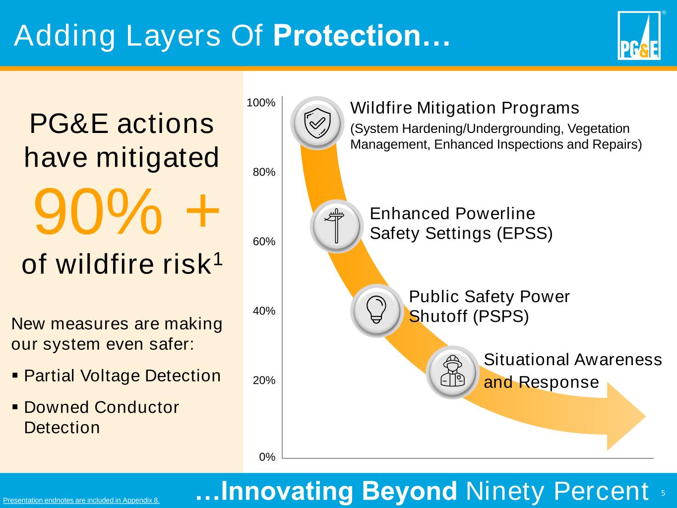 ® 4 Presentation endnotes are included in Appendix 8. Mitigating Financial RiskMitigating Physical Risk ▪ Wildfire Mitigation: Layers of Protection ▪ Additional Hydro Generation ▪ Winter Storm Response and Restoration Investments System Resilience ▪ Undergrounding Bill (SB 884) ▪ Diablo Canyon Bill (SB 846) ▪ Self-Insurance Approved ▪ NRC Waiver Granted ▪ 2022 WMCE Interim Rates PD Constructive Policy Outcomes ▪ Simple, Affordable Model ▪ Climate Credit Accelerated ▪ 2% Non-Fuel O&M Cost Reduction ▪ Generation Minority Interest Sale Customers ▪ Non-GAAP Core EPS Growth1 • At Least 10% for 2023 and 2024 • At Least 9% in 2025 and 2026 ▪ Stronger Balance Sheet ▪ CEMA Cost Recovery Mechanism ▪ No Equity Through 2024 Investors 2023: Mitigating Risk… …And Earning Trust