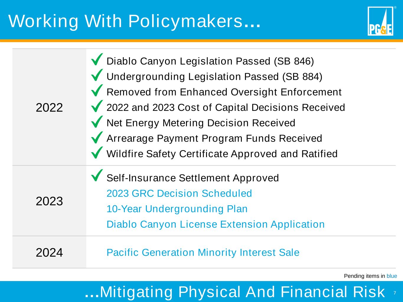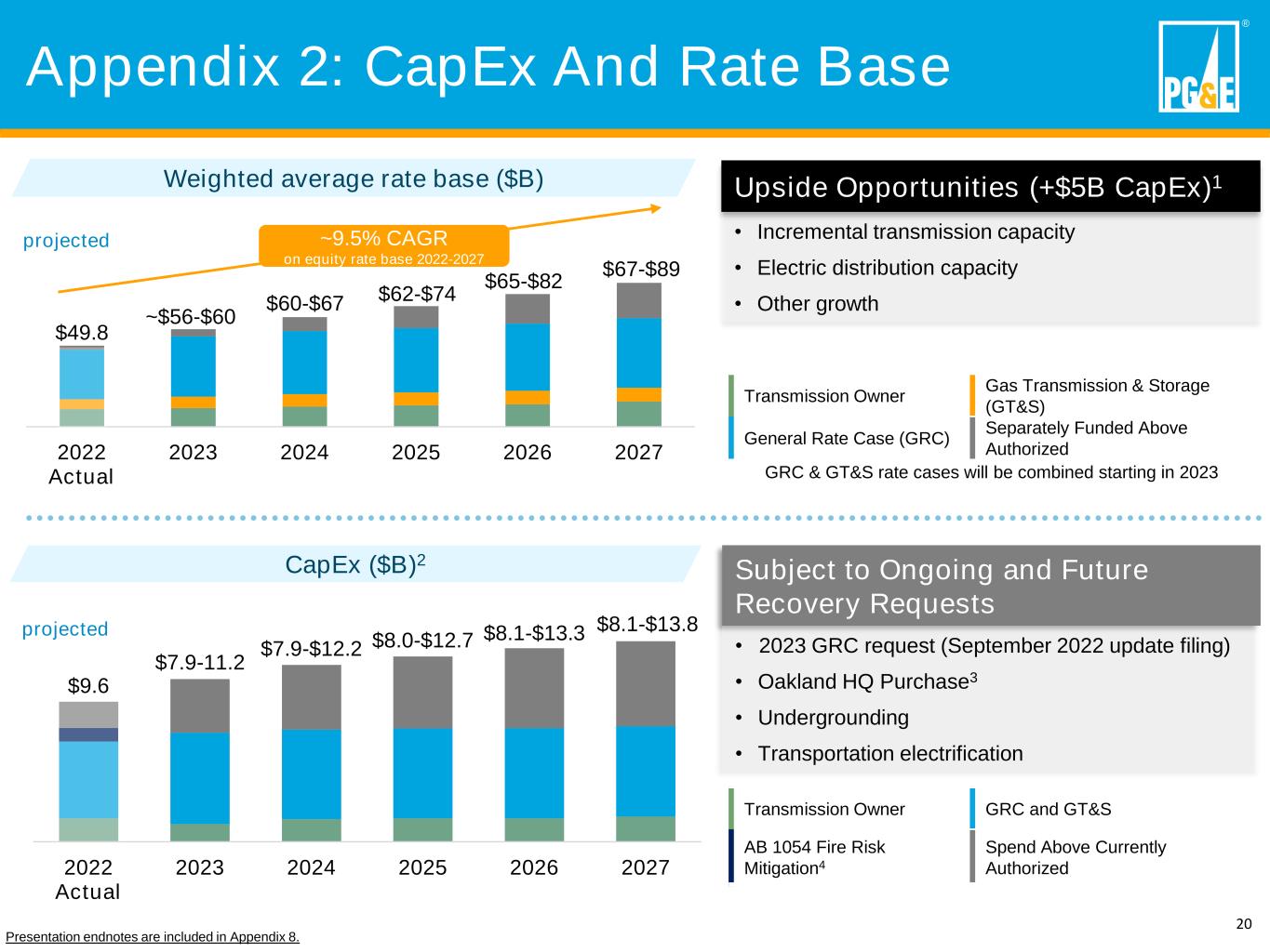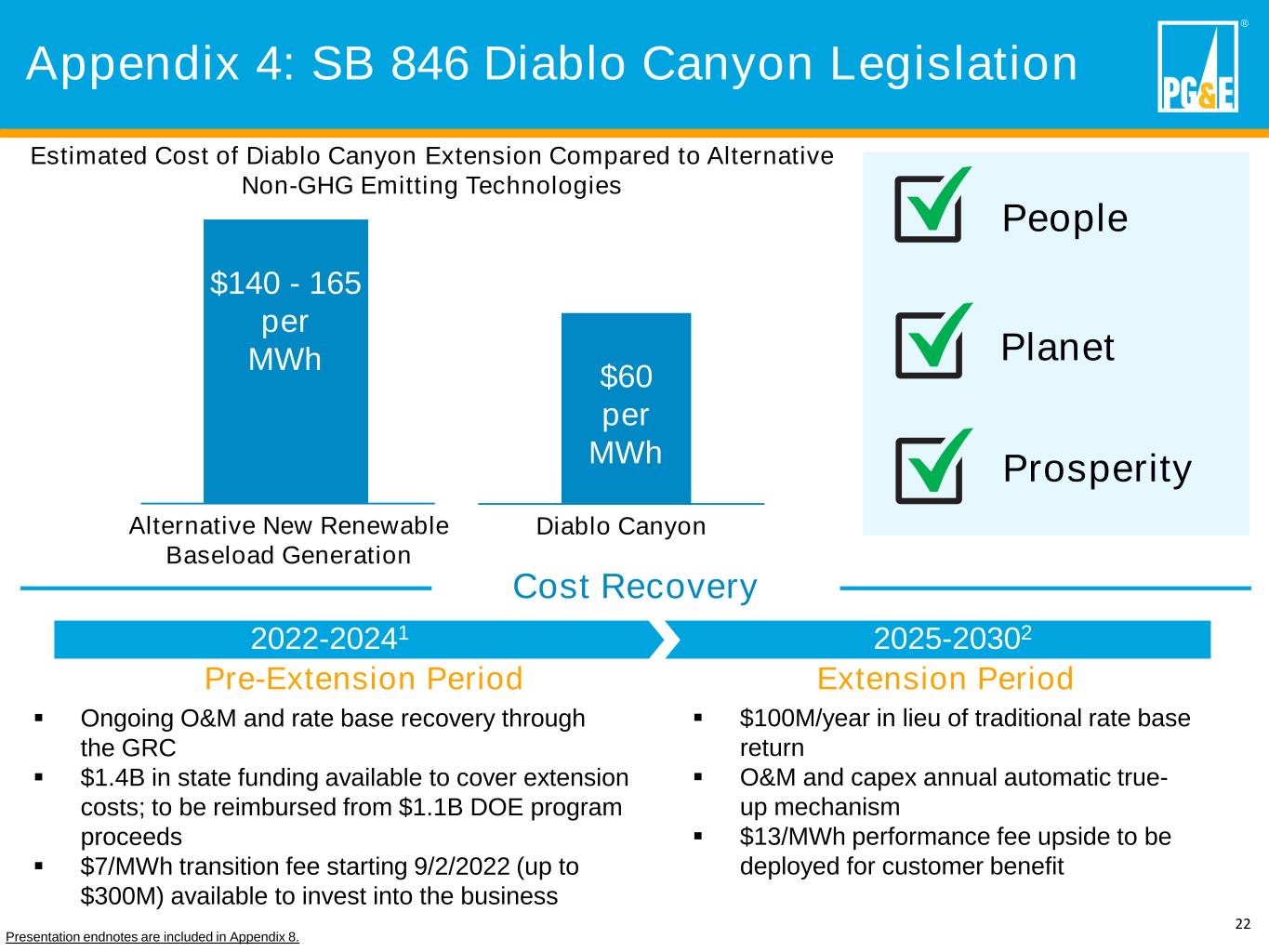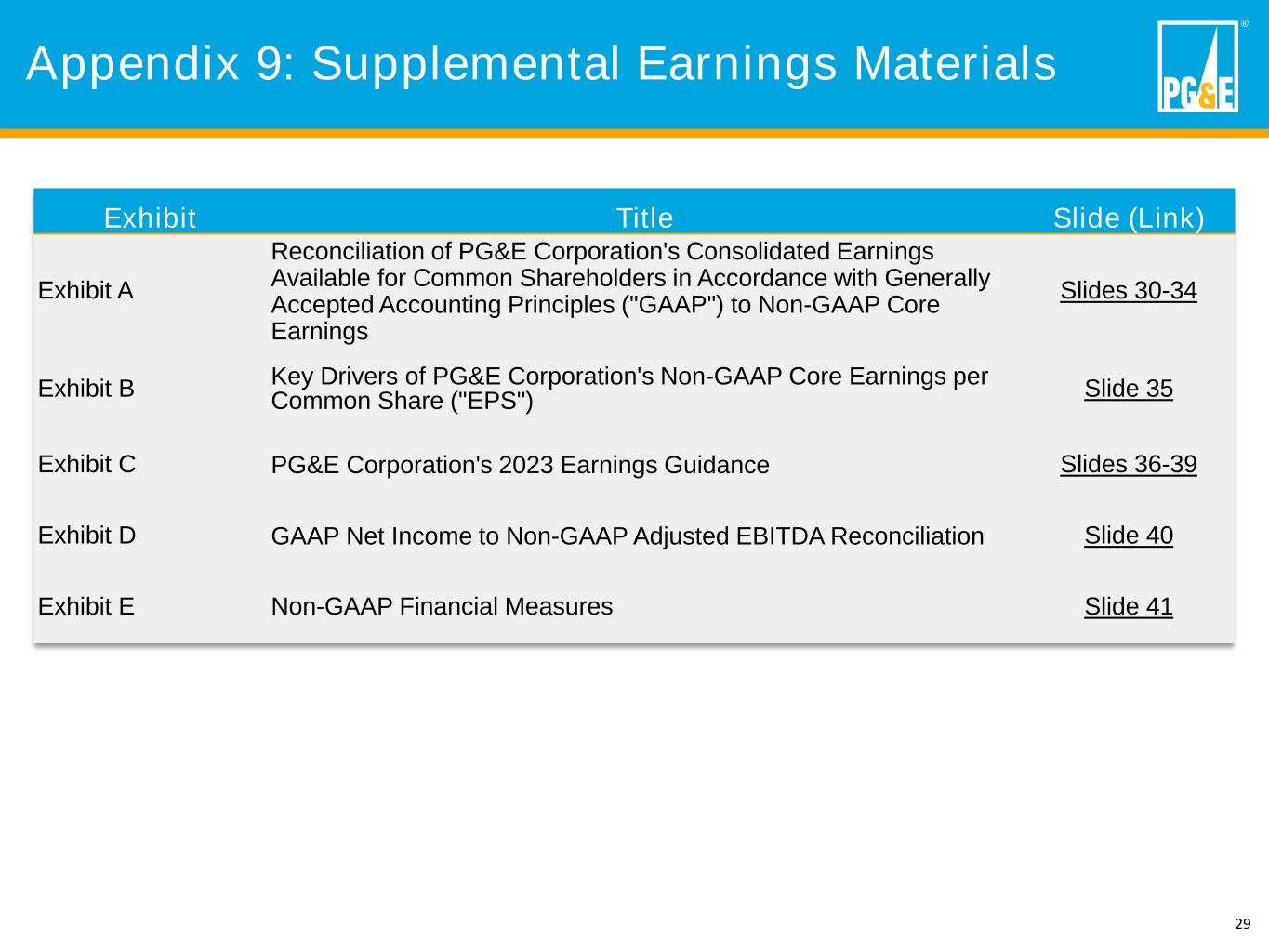 ® 28 Slide titles are hyperlinks Slide 20: Appendix 2: CapEx And Rate Base 1. Upside opportunities of +$5 billion are not reflected in the CapEx or rate base ranges. 2. Low end of the range reflects authorized capital expenditures, including the full amount recoverable through a balancing account where applicable. High end of the range includes capital spend above authorized and reflects the spending forecast from the 2023 GRC application including the September 2022 inflation update. 3. The Utility entered into a lease for the Lakeside Building in Oakland, California, with an option to purchase in 2023, in accordance with its application to sell its San Francisco General Office headquarters complex and as requested in the 2023 GRC. 4. Includes $3.21 billion of fire risk mitigation capital expenditures that will be excluded from the Utility's equity rate base. Slide 21: Appendix 3: Expected Recovery Of Wildfire-Related Costs 1. Balance represents wildfire-related costs approved in the 2020 GRC and recorded in the RTBA, WMBA, and VMBA, and amounts approved through subsequent advice letters. 2. Timing of cost recovery is based on the Utility's motion for interim rate relief. The request asks for 85% of the total revenue requirement, plus interest, to be recovered from June 2023 to May 2024. Slide 22: Appendix 4: SB 846 Diablo Canyon Legislation 1. The pre-extension period extends through the scheduled retirement dates of November 2024 and August 2025 for Units 1 and 2, respectively. 2. The extension period covers the additional 5-year life for each Unit. Slide 23: Appendix 5: Wildfire Mitigation Plan Progress 1. Actual data is from January 1, 2019 through December 31, 2022. 2. Using a risk-informed approach and incorporating lessons learned, enhanced vegetation management has been integrated into the distribution vegetation management program. Slide 25: Appendix 7: Regulatory Progress 1. Regulatory proceeding timelines reflect expected filing and decision time frames; actual timing may differ. Appendix 8: Presentation Endnotes