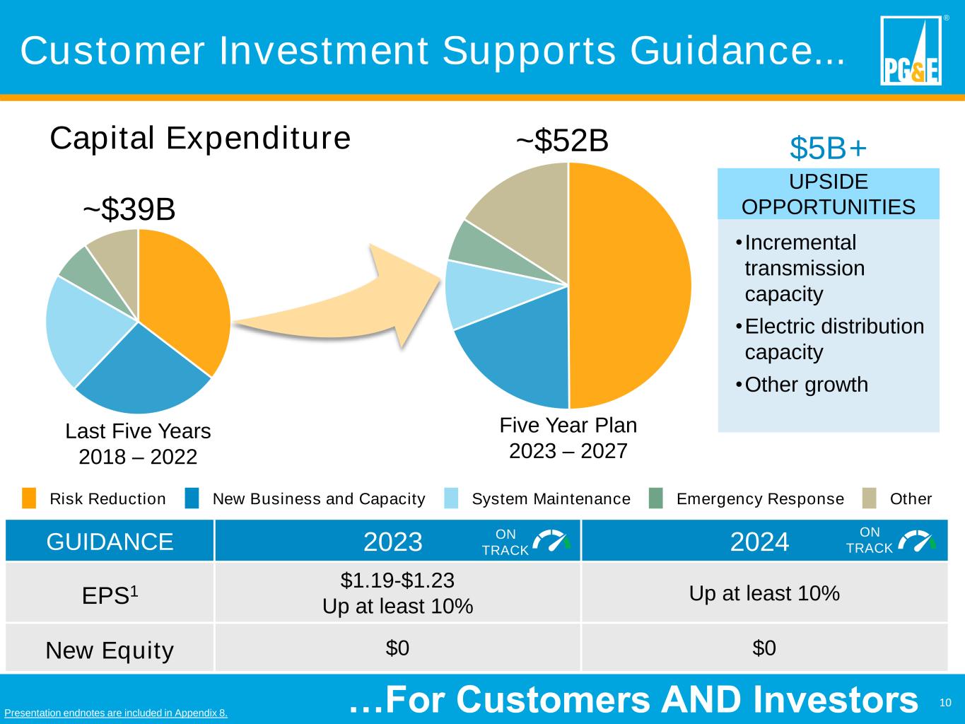 (4) “Fire Victim Trust tax benefit net of securitization” includes the impact of rate neutral (SB 901) securitization and tax benefits related to the Fire Victim Trust. Impacts of the SB 901 securitization include the establishment of the SB 901 securitization regulatory asset and the SB 901 regulatory liability associated with revenue credits funded by Net Operating Loss monetization. Fire Victim Trust tax benefits include tax benefits recognized upon the sale of shares of PG&E Corporation common stock by the Fire Victim Trust, which PG&E Corporation and the Utility have elected to treat as a grantor trust. Also included are the earnings-impacting investment losses, net of gains, associated with investments related to the upfront contributions to the Customer Credit Trust. The low case includes tax benefits for the 120,000,000 shares of PG&E Corporation common stock sold in the aggregate by the Fire Victim Trust as of April 26, 2023, whereas the high case reflects an assumption that the Fire Victim Trust sells the remaining 127,743,590 shares during 2023.