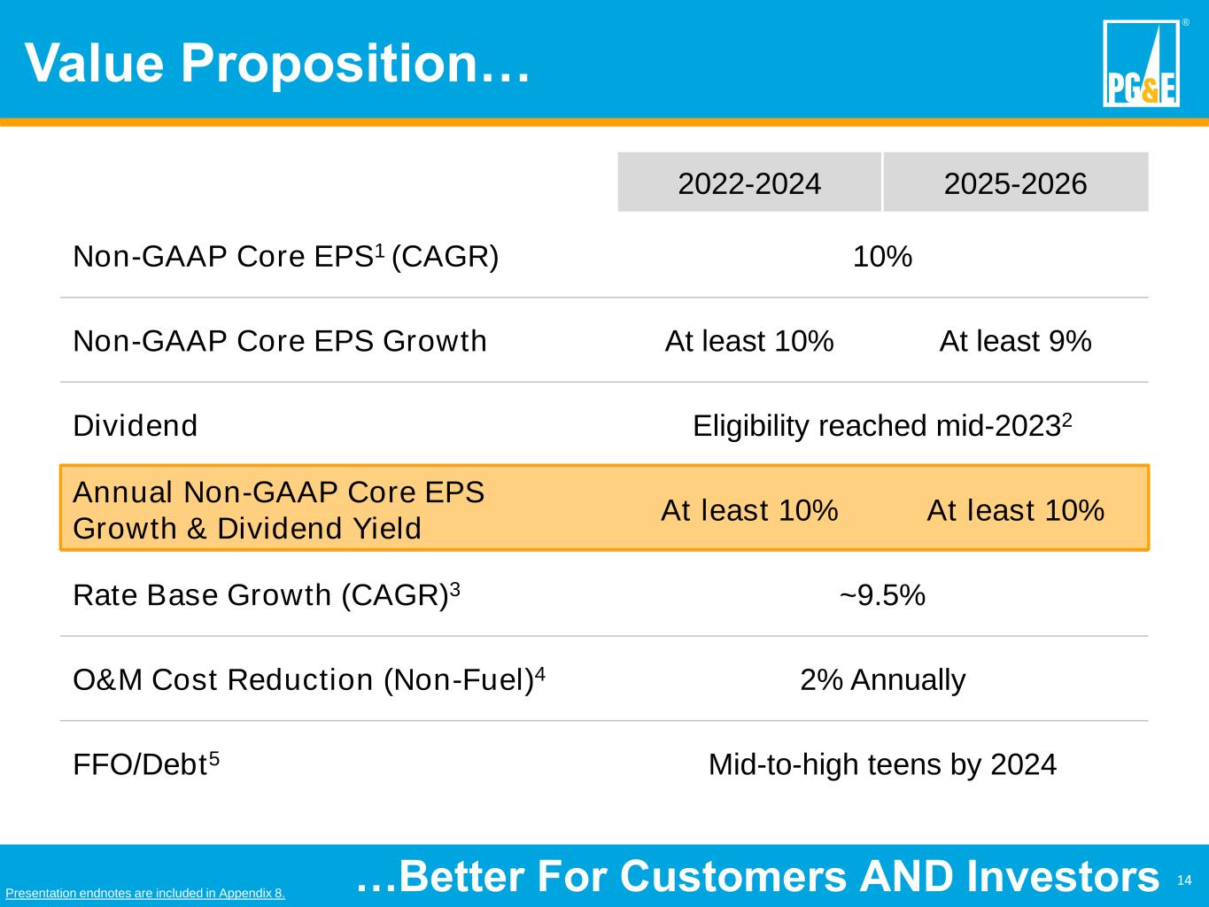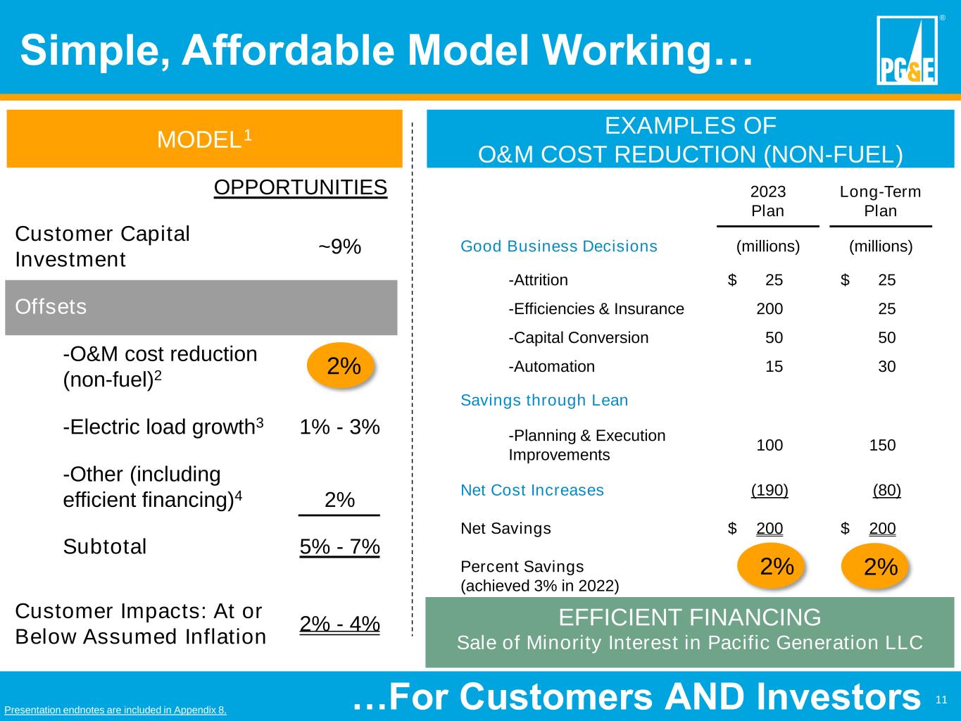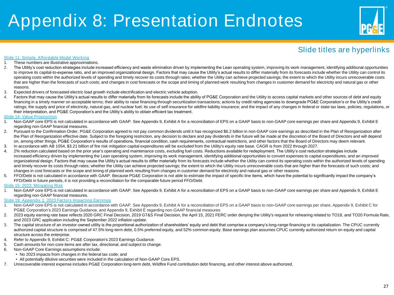 ® 27 Slide titles are hyperlinks Slide 11: Simple, Affordable Model Working 1. These numbers are illustrative approximations. 2. The Utility’s cost reduction strategies include increased efficiency and waste elimination driven by implementing the Lean operating system, improving its work management, identifying additional opportunities to improve its capital-to-expense ratio, and an improved organizational design. Factors that may cause the Utility’s actual results to differ materially from its forecasts include whether the Utility can control its operating costs within the authorized levels of spending and timely recover its costs through rates; whether the Utility can achieve projected savings; the extent to which the Utility incurs unrecoverable costs that are higher than the forecasts of such costs; and changes in cost forecasts or the scope and timing of planned work resulting from changes in customer demand for electricity and natural gas or other reasons. 3. Expected drivers of forecasted electric load growth include electrification and electric vehicle adoption. 4. Factors that may cause the Utility’s actual results to differ materially from its forecasts include the ability of PG&E Corporation and the Utility to access capital markets and other sources of debt and equity financing in a timely manner on acceptable terms; their ability to raise financing through securitization transactions; actions by credit rating agencies to downgrade PG&E Corporation’s or the Utility’s credit ratings; the supply and price of electricity, natural gas, and nuclear fuel; its use of self-insurance for wildfire liability insurance; and the impact of any changes in federal or state tax laws, policies, regulations, or their interpretation, and PG&E Corporation’s and the Utility’s ability to obtain efficient tax treatment. Slide 14: Value Proposition 1. Non-GAAP core EPS is not calculated in accordance with GAAP. See Appendix 9, Exhibit A for a reconciliation of EPS on a GAAP basis to non-GAAP core earnings per share and Appendix 9, Exhibit E regarding non-GAAP financial measures. 2. Pursuant to the Confirmation Order, PG&E Corporation agreed to not pay common dividends until it has recognized $6.2 billion in non-GAAP core earnings as described in the Plan of Reorganization after the Plan of Reorganization effective date. Subject to the foregoing restriction, any decision to declare and pay dividends in the future will be made at the discretion of the Board of Directors and will depend on, among other things, PG&E Corporation’s results of operations, financial condition, cash requirements, contractual restrictions, and other factors that the Board of Directors may deem relevant. 3. In accordance with AB 1054, $3.21 billion of fire risk mitigation capital expenditures will be excluded from the Utility's equity rate base. CAGR is from 2022 through 2027. 4. 2% reduction calculated based on the prior year's operating and maintenance costs, excluding fuel costs. Reductions available for redeployment. The Utility’s cost reduction strategies include increased efficiency driven by implementing the Lean operating system, improving its work management, identifying additional opportunities to convert expenses to capital expenditures, and an improved organizational design. Factors that may cause the Utility’s actual results to differ materially from its forecasts include whether the Utility can control its operating costs within the authorized levels of spending and timely recover its costs through rates; whether the Utility can achieve projected savings; the extent to which the Utility incurs unrecoverable costs that are higher than the forecasts of such costs; and changes in cost forecasts or the scope and timing of planned work resulting from changes in customer demand for electricity and natural gas or other reasons. 5. FFO/Debt is not calculated in accordance with GAAP. Because PG&E Corporation is not able to estimate the impact of specific line items, which have the potential to significantly impact the company’s FFO/Debt in future periods, it is not providing a reconciliation for the comparable future period FFO/Debt. Slide 15: 2023: Mitigating Risk 1. Non-GAAP core EPS is not calculated in accordance with GAAP. See Appendix 9, Exhibit A for a reconciliation of EPS on a GAAP basis to non-GAAP core earnings per share and Appendix 9, Exhibit E regarding non-GAAP financial measures. Slide 19: Appendix 1: 2023 Factors Impacting Earnings 1. Non-GAAP core EPS is not calculated in accordance with GAAP. See Appendix 9, Exhibit A for a reconciliation of EPS on a GAAP basis to non-GAAP core earnings per share, Appendix 9, Exhibit C for PG&E Corporation’s 2023 Earnings Guidance, and Appendix 9, Exhibit E regarding non-GAAP financial measures. 2. 2023 equity earning rate base reflects 2020 GRC Final Decision, 2019 GT&S Final Decision, the April 15, 2021 FERC order denying the Utility's request for rehearing related to TO18, and TO20 Formula Rate, and 2023 GRC application including the September 2022 inflation update. 3. The capital structure of an investor-owned utility is the proportional authorization of shareholders’ equity and debt that comprise a company’s long-range financing or its capitalization. The CPUC currently authorized capital structure is comprised of 47.5% long-term debt, 0.5% preferred equity, and 52% common equity. Base earnings plan assumes CPUC currently authorized return on equity and capital structure across the enterprise. 4. Refer to Appendix 9, Exhibit C: PG&E Corporation's 2023 Earnings Guidance. 5. Cash amounts for non-core items are after tax, directional, and subject to change. 6. Non-GAAP Core Earnings assumptions include: • No 2023 impacts from changes in the federal tax code; and • All potentially dilutive securities were included in the calculation of Non-GAAP Core EPS. 7. Unrecoverable interest expense includes PG&E Corporation long-term debt, Wildfire