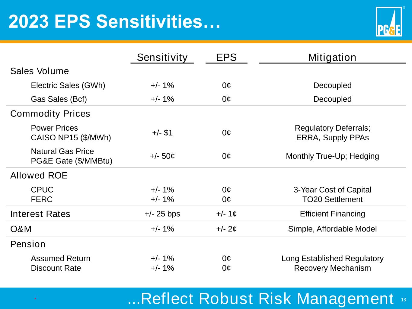 ® 12 Cost of Capital ▪ 2023: Timely final decision received; phase 2 pending 2023 GRC ▪ Self-insurance settlement approved ▪ Final decision scheduled for Q3 2023 Pacific Generation ▪ PD within 90 days of Oct 5 (revised schedule) Wildfire-Related Cost Recovery ▪ 2020 WMCE settlement approved ▪ 2021 WMCE proposed settlement pending at the CPUC ▪ 2022 WMCE and interim rate relief; IRR PD Apr 28 Diablo Canyon and Undergrounding Legislation ▪ Diablo Canyon Extension: Loan from DWR & DOE funding ▪ Diablo Canyon Extension: NRC waiver granted ▪ Diablo Canyon Extension: NRC and state filings ▪ Undergrounding: 10-year plan to be filed Regulatory And Legislative Support… ...Helps Us Deliver For Customers