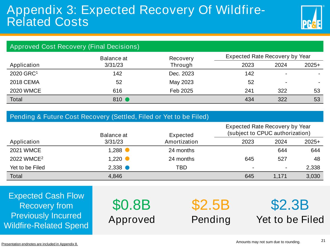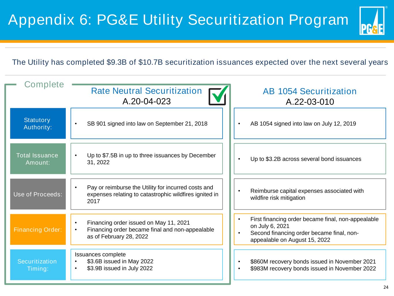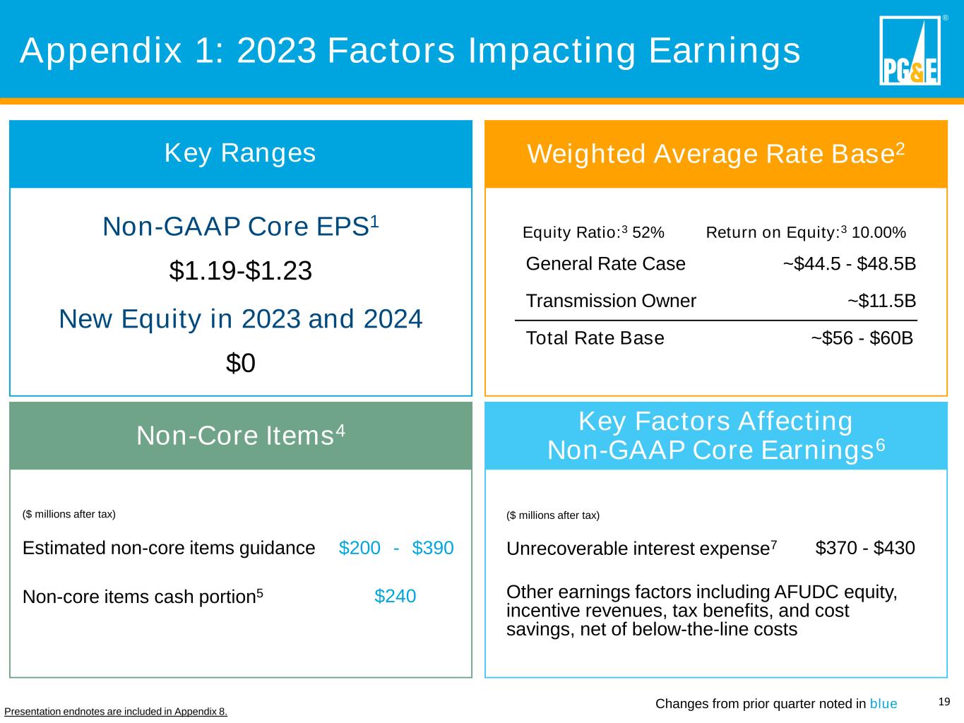 ® 18 Appendix Title Slide (Link) Appendix 1 2023 Factors Impacting Earnings Slide 19 Appendix 2 CapEx and Rate Base Slide 20 Appendix 3 Expected Recovery of Wildfire-Related Costs Slide 21 Appendix 4 SB 846 Diablo Canyon Legislation Slide 22 Appendix 5 Wildfire Mitigation Plan Progress Slide 23 Appendix 6 PG&E Utility Securitization Program Slide 24 Appendix 7 Regulatory Progress Slide 25 Appendix 8 Presentation Endnotes Slide 26-28 Appendix 9 Supplemental Earnings Materials Slide 29-41 Table of Contents