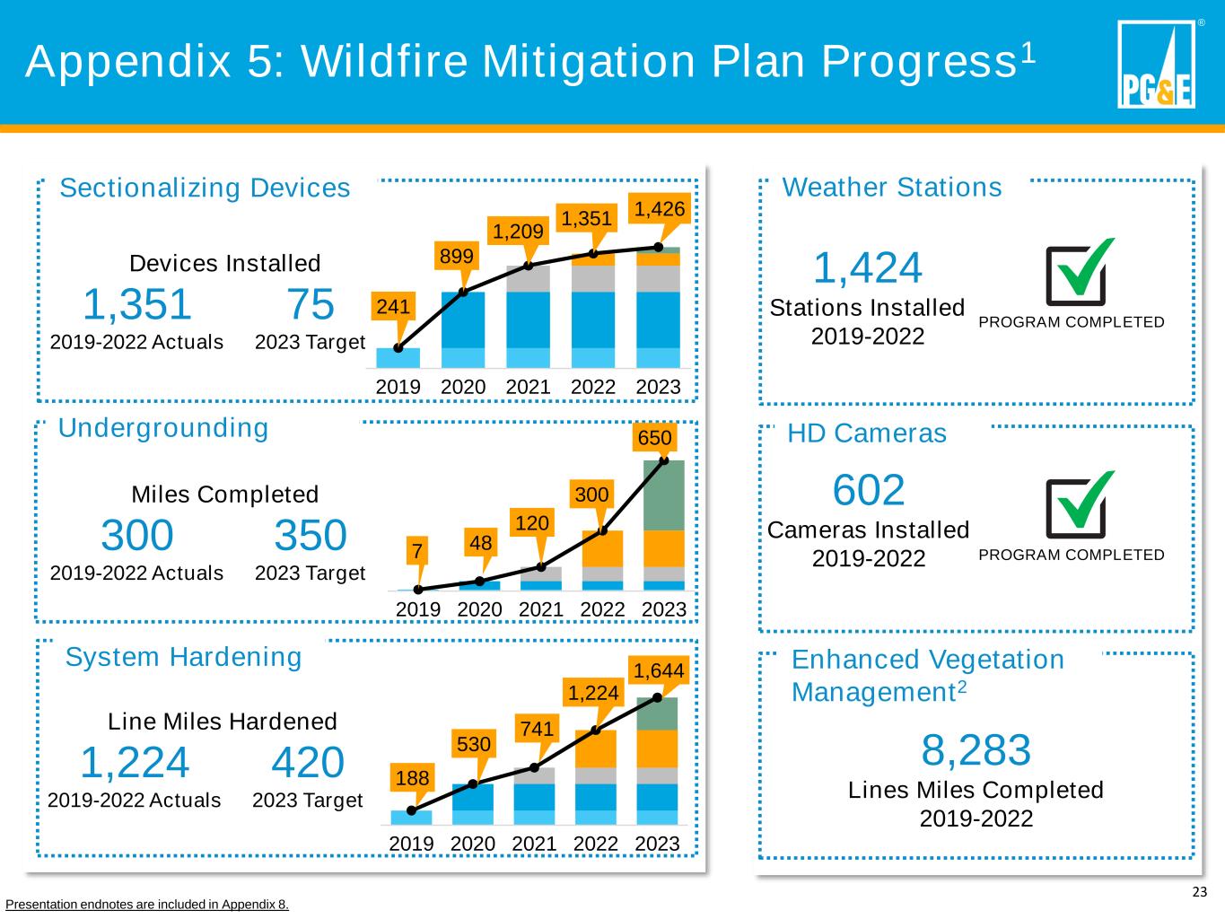 ® 23 Presentation endnotes are included in Appendix 8. 2023 TargetSectionalizing Devices 241 899 1,209 1,351 1,426 2019 2020 2021 2022 2023 System Hardening 188 530 741 1,224 1,644 2019 2020 2021 2022 2023 1,224 2019-2022 Actuals Weather Stations HD Cameras 1,424 Stations Installed 2019-2022 602 Cameras Installed 2019-2022 Undergrounding 7 48 120 300 650 2019 2020 2021 2022 2023 Appendix 5: Wildfire Mitigation Plan Progress1 PROGRAM COMPLETED PROGRAM COMPLETED Enhanced Vegetation Management2 8,283 Lines Miles Completed 2019-2022 420 2023 Target Line Miles Hardened 300 2019-2022 Actuals 350 2023 Target Miles Completed 1,351 2019-2022 Actuals 75 2023 Target Devices Installed