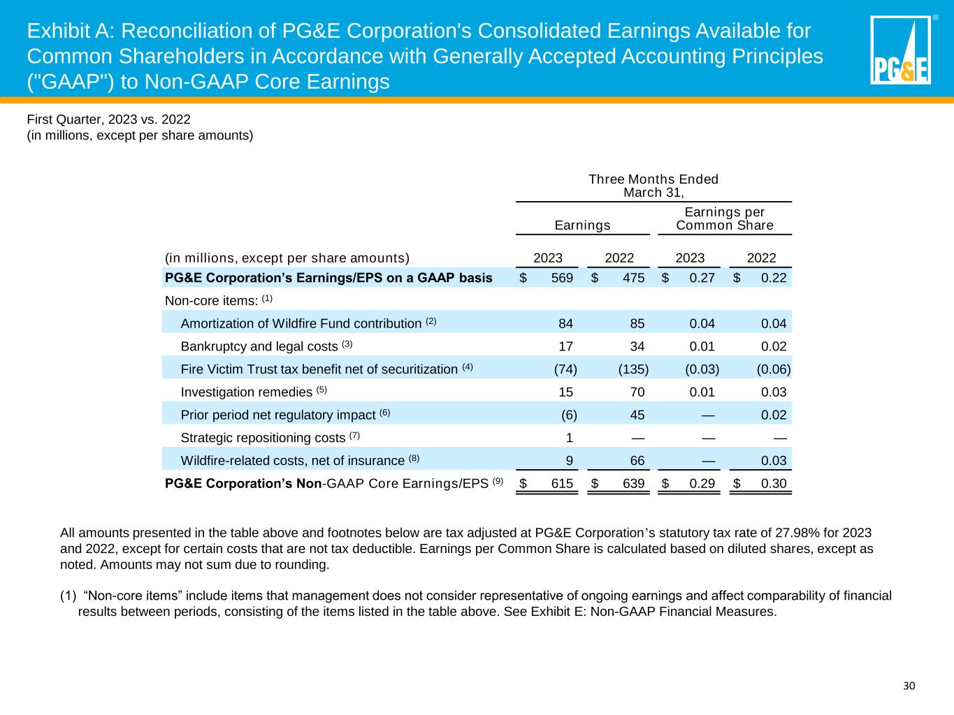 ® 30 Exhibit A: Reconciliation of PG&E Corporation's Consolidated Earnings Available for Common Shareholders in Accordance with Generally Accepted Accounting Principles ("GAAP") to Non-GAAP Core Earnings Three Months Ended March 31, Earnings Earnings per Common Share (in millions, except per share amounts) 2023 2022 2023 2022 PG&E Corporation’s Earnings/EPS on a GAAP basis $ 569 $ 475 $ 0.27 $ 0.22 Non-core items: (1) Amortization of Wildfire Fund contribution (2) 84 85 0.04 0.04 Bankruptcy and legal costs (3) 17 34 0.01 0.02 Fire Victim Trust tax benefit net of securitization (4) (74) (135) (0.03) (0.06) Investigation remedies (5) 15 70 0.01 0.03 Prior period net regulatory impact (6) (6) 45 — 0.02 Strategic repositioning costs (7) 1 — — — Wildfire-related costs, net of insurance (8) 9 66 — 0.03 PG&E Corporation’s Non-GAAP Core Earnings/EPS (9) $ 615 $ 639 $ 0.29 $ 0.30 All amounts presented in the table above and footnotes below are tax adjusted at PG&E Corporation’s statutory tax rate of 27.98% for 2023 and 2022, except for certain costs that are not tax deductible. Earnings per Common Share is calculated based on diluted shares, except as noted. Amounts may not sum due to rounding. First Quarter, 2023 vs. 2022 (in millions, except per share amounts) (1) “Non-core items” include items that management does not consider representative of ongoing earnings and affect comparability of financial results between periods, consisting of the items listed in the table above. See Exhibit E: Non-GAAP Financial Measures.