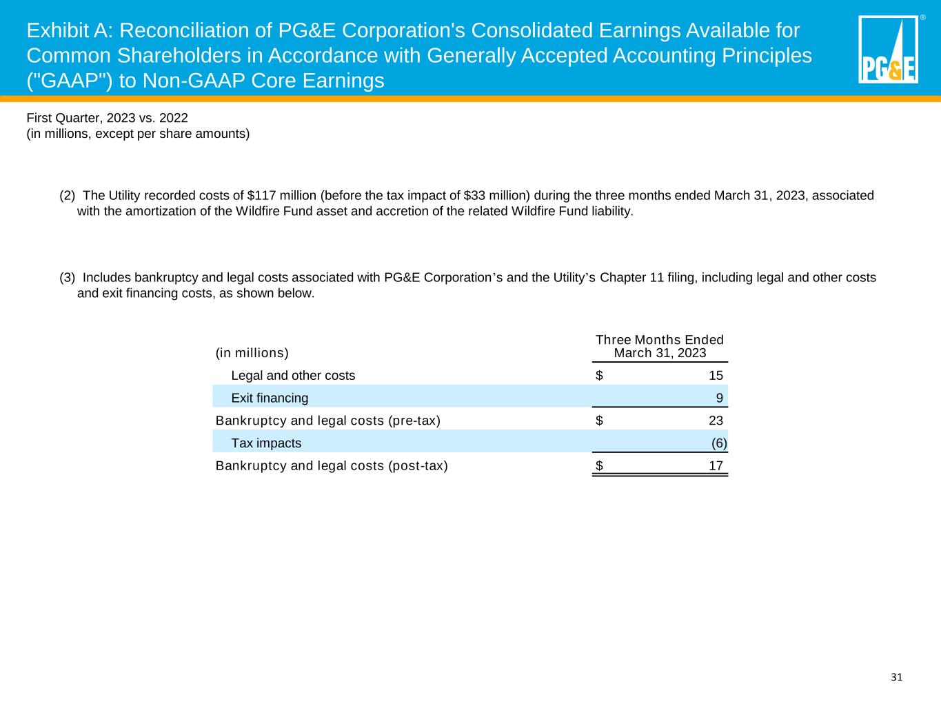 ® 31 First Quarter, 2023 vs. 2022 (in millions, except per share amounts) (3) Includes bankruptcy and legal costs associated with PG&E Corporation’s and the Utility’s Chapter 11 filing, including legal and other costs and exit financing costs, as shown below. (2) The Utility recorded costs of $117 million (before the tax impact of $33 million) during the three months ended March 31, 2023, associated with the amortization of the Wildfire Fund asset and accretion of the related Wildfire Fund liability. (in millions) Three Months Ended March 31, 2023 Legal and other costs $ 15 Exit financing 9 Bankruptcy and legal costs (pre-tax) $ 23 Tax impacts (6) Bankruptcy and legal costs (post-tax) $ 17 Exhibit A: Reconciliation of PG&E Corporation's Consolidated Earnings Available for Common Shareholders in Accordance with Generally Accepted Accounting Principles ("GAAP") to Non-GAAP Core Earnings