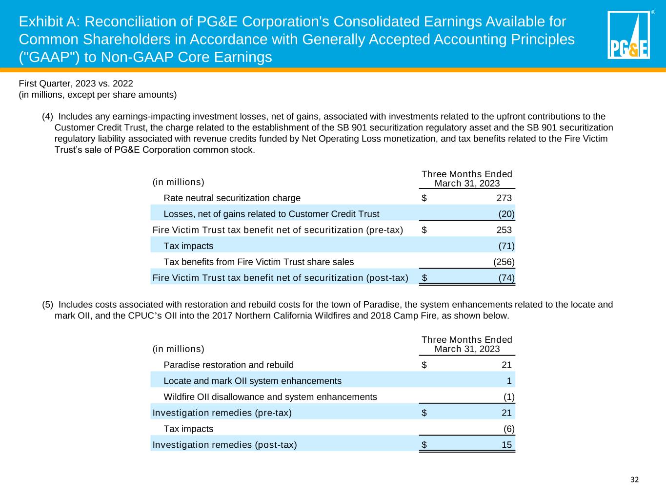 ® 32 First Quarter, 2023 vs. 2022 (in millions, except per share amounts) (4) Includes any earnings-impacting investment losses, net of gains, associated with investments related to the upfront contributions to the Customer Credit Trust, the charge related to the establishment of the SB 901 securitization regulatory asset and the SB 901 securitization regulatory liability associated with revenue credits funded by Net Operating Loss monetization, and tax benefits related to the Fire Victim Trust’s sale of PG&E Corporation common stock. (in millions) Three Months Ended March 31, 2023 Paradise restoration and rebuild $ 21 Locate and mark OII system enhancements 1 Wildfire OII disallowance and system enhancements (1) Investigation remedies (pre-tax) $ 21 Tax impacts (6) Investigation remedies (post-tax) $ 15 (5) Includes costs associated with restoration and rebuild costs for the town of Paradise, the system enhancements related to the locate and mark OII, and the CPUC’s OII into the 2017 Northern California Wildfires and 2018 Camp Fire, as shown below. (in millions) Three Months Ended March 31, 2023 Rate neutral securitization charge $ 273 Losses, net of gains related to Customer Credit Trust (20) Fire Victim Trust tax benefit net of securitization (pre-tax) $ 253 Tax impacts (71) Tax benefits from Fire Victim Trust share sales (256) Fire Victim Trust tax benefit net of securitization (post-tax) $ (74) Exhibit A: Reconciliation of PG&E Corporation's Consolidated Earnings Available for Common Shareholders in Accordance with Generally Accepted Accounting Principles ("GAAP") to Non-GAAP Core Earnings