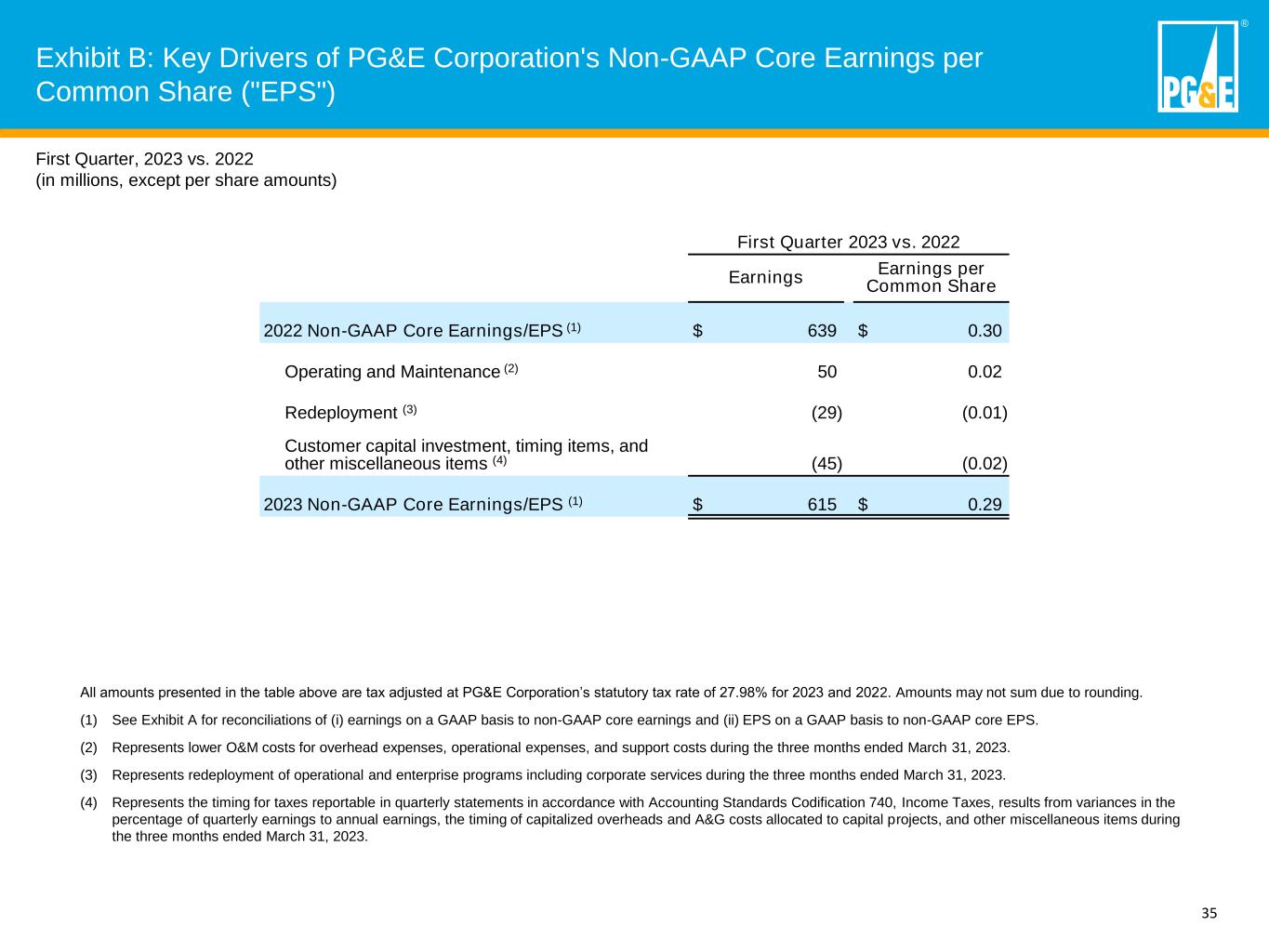 ® 35 All amounts presented in the table above are tax adjusted at PG&E Corporation’s statutory tax rate of 27.98% for 2023 and 2022. Amounts may not sum due to rounding. (1) See Exhibit A for reconciliations of (i) earnings on a GAAP basis to non-GAAP core earnings and (ii) EPS on a GAAP basis to non-GAAP core EPS. (2) Represents lower O&M costs for overhead expenses, operational expenses, and support costs during the three months ended March 31, 2023. (3) Represents redeployment of operational and enterprise programs including corporate services during the three months ended March 31, 2023. (4) Represents the timing for taxes reportable in quarterly statements in accordance with Accounting Standards Codification 740, Income Taxes, results from variances in the percentage of quarterly earnings to annual earnings, the timing of capitalized overheads and A&G costs allocated to capital projects, and other miscellaneous items during the three months ended March 31, 2023. Exhibit B: Key Drivers of PG&E Corporation's Non-GAAP Core Earnings per Common Share ("EPS") First Quarter 2023 vs. 2022 Earnings Earnings per Common Share 2022 Non-GAAP Core Earnings/EPS (1) $ 639 $ 0.30 Operating and Maintenance (2) 50 0.02 Redeployment (3) (29) (0.01) Customer capital investment, timing items, and other miscellaneous items (4) (45) (0.02) 2023 Non-GAAP Core Earnings/EPS (1) $ 615 $ 0.29 First Quarter, 2023 vs. 2022 (in millions, except per share amounts)