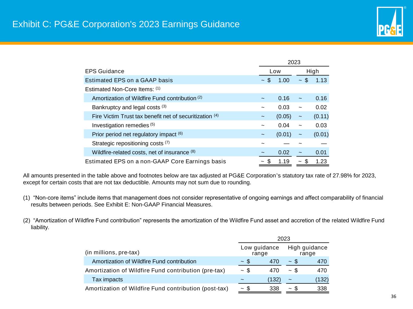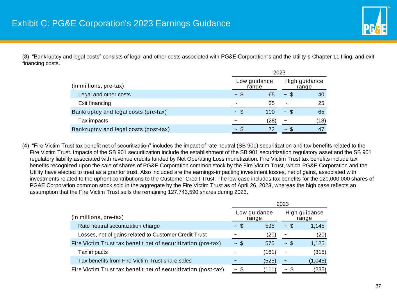 ® 36 Exhibit C: PG&E Corporation's 2023 Earnings Guidance 2023 EPS Guidance Low High Estimated EPS on a GAAP basis ~ $ 1.00 ~ $ 1.13 Estimated Non-Core Items: (1) Amortization of Wildfire Fund contribution (2) ~ 0.16 ~ 0.16 Bankruptcy and legal costs (3) ~ 0.03 ~ 0.02 Fire Victim Trust tax benefit net of securitization (4) ~ (0.05) ~ (0.11) Investigation remedies (5) ~ 0.04 ~ 0.03 Prior period net regulatory impact (6) ~ (0.01) ~ (0.01) Strategic repositioning costs (7) ~ — ~ — Wildfire-related costs, net of insurance (8) ~ 0.02 ~ 0.01 Estimated EPS on a non-GAAP Core Earnings basis ~ $ 1.19 ~ $ 1.23 All amounts presented in the table above and footnotes below are tax adjusted at PG&E Corporation’s statutory tax rate of 27.98% for 2023, except for certain costs that are not tax deductible. Amounts may not sum due to rounding. (1) “Non-core items” include items that management does not consider representative of ongoing earnings and affect comparability of financial results between periods. See Exhibit E: Non-GAAP Financial Measures. 2023 (in millions, pre-tax) Low guidance range High guidance range Amortization of Wildfire Fund contribution ~ $ 470 ~ $ 470 Amortization of Wildfire Fund contribution (pre-tax) ~ $ 470 ~ $ 470 Tax impacts ~ (132) ~ (132) Amortization of Wildfire Fund contribution (post-tax) ~ $ 338 ~ $ 338 (2) “Amortization of Wildfire Fund contribution” represents the amortization of the Wildfire Fund asset and accretion of the related Wildfire Fund liability.