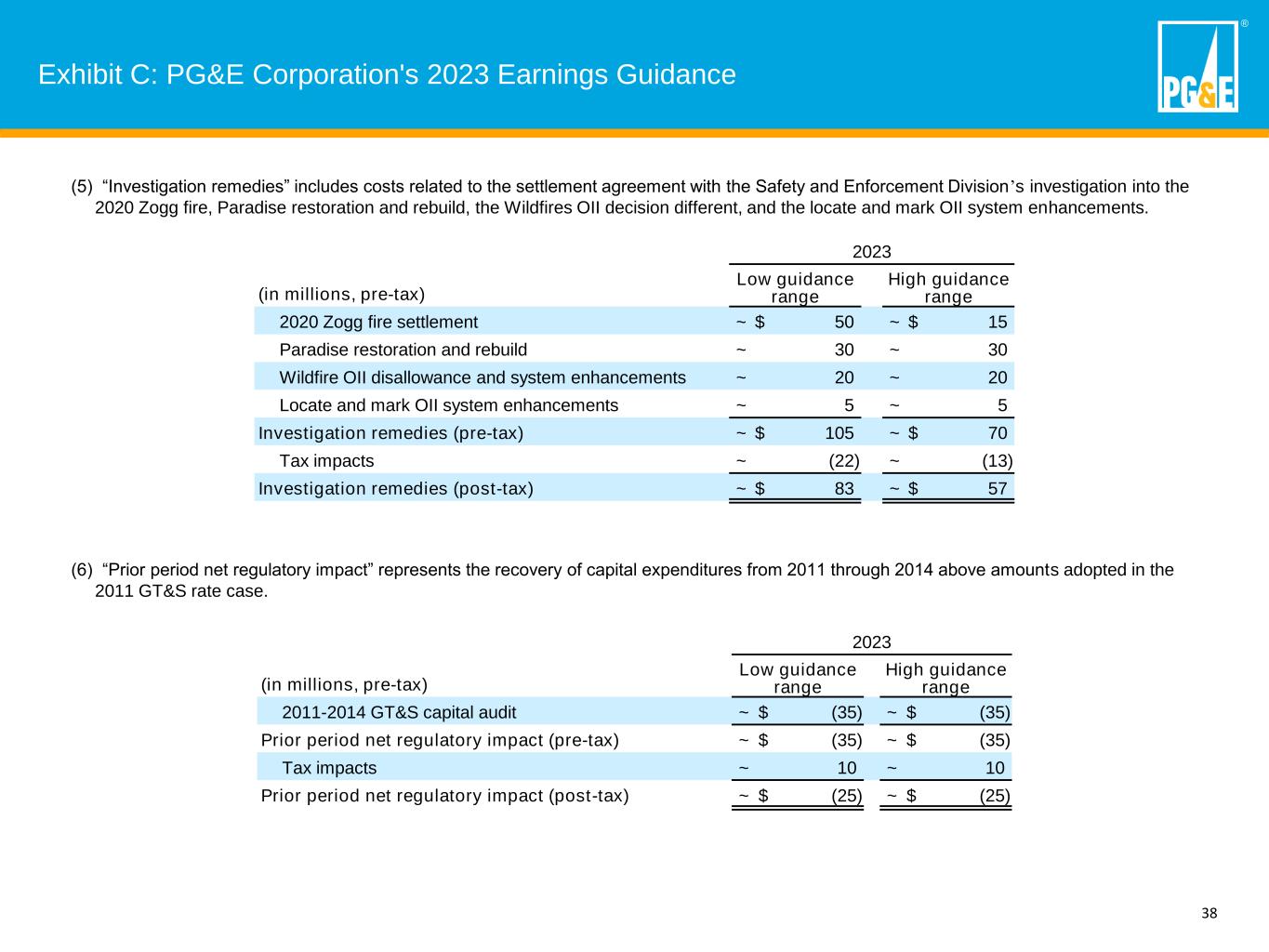 ® 37 Exhibit E: PG&E Corporation's 2020 and 2021 Earnings Guidance Exhibit C: PG&E Corporation's 2023 Earnings Guidance (4) “Fire Victim Trust tax benefit net of securitization” includes the impact of rate neutral (SB 901) securitization and tax benefits related to the Fire Victim Trust. Impacts of the SB 901 securitization include the establishment of the SB 901 securitization regulatory asset and the SB 901 regulatory liability associated with revenue credits funded by Net Operating Loss monetization. Fire Victim Trust tax benefits include tax benefits recognized upon the sale of shares of PG&E Corporation common stock by the Fire Victim Trust, which PG&E Corporation and the Utility have elected to treat as a grantor trust. Also included are the earnings-impacting investment losses, net of gains, associated with investments related to the upfront contributions to the Customer Credit Trust. The low case includes tax benefits for the 120,000,000 shares of PG&E Corporation common stock sold in the aggregate by the Fire Victim Trust as of April 26, 2023, whereas the high case reflects an assumption that the Fire Victim Trust sells the remaining 127,743,590 shares during 2023. (3) “Bankruptcy and legal costs” consists of legal and other costs associated with PG&E Corporation’s and the Utility’s Chapter 11 filing, and exit financing costs. 2023 (in millions, pre-tax) Low guidance range High guidance range Legal and other costs ~ $ 65 ~ $ 40 Exit financing ~ 35 ~ 25 Bankruptcy and legal costs (pre-tax) ~ $ 100 ~ $ 65 Tax impacts ~ (28) ~ (18) Bankruptcy and legal costs (post-tax) ~ $ 72 ~ $ 47 2023 (in millions, pre-tax) Low guidance range High guidance range Rate neutral securitization charge ~ $ 595 ~ $ 1,145 Losses, net of gains related to Customer Credit Trust ~ (20) ~ (20) Fire Victim Trust tax benefit net of securitization (pre-tax) ~ $ 575 ~ $ 1,125 Tax impacts ~ (161) ~ (315) Tax benefits from Fire Victim Trust share sales ~ (525) ~ (1,045) Fire Victim Trust tax benefit net of securitization (post-tax) ~ $ (111) ~ $ (235)