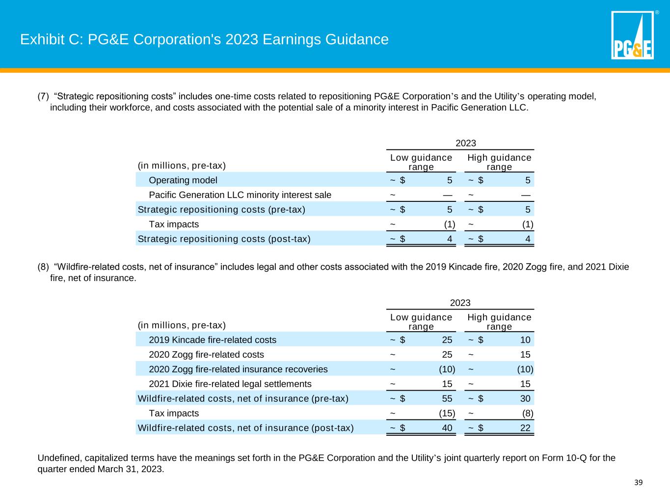 ® 39 Exhibit C: PG&E Corporation's 2023 Earnings Guidance (7) “Strategic repositioning costs” includes one-time costs related to repositioning PG&E Corporation’s and the Utility’s operating model, including their workforce, and costs associated with the potential sale of a minority interest in Pacific Generation LLC. Undefined, capitalized terms have the meanings set forth in the PG&E Corporation and the Utility’s joint quarterly report on Form 10-Q for the quarter ended March 31, 2023. (8) “Wildfire-related costs, net of insurance” includes legal and other costs associated with the 2019 Kincade fire, 2020 Zogg fire, and 2021 Dixie fire, net of insurance. 2023 (in millions, pre-tax) Low guidance range High guidance range Operating model ~ $ 5 ~ $ 5 Pacific Generation LLC minority interest sale ~ — ~ — Strategic repositioning costs (pre-tax) ~ $ 5 ~ $ 5 Tax impacts ~ (1) ~ (1) Strategic repositioning costs (post-tax) ~ $ 4 ~ $ 4 2023 (in millions, pre-tax) Low guidance range High guidance range 2019 Kincade fire-related costs ~ $ 25 ~ $ 10 2020 Zogg fire-related costs ~ 25 ~ 15 2020 Zogg fire-related insurance recoveries ~ (10) ~ (10) 2021 Dixie fire-related legal settlements ~ 15 ~ 15 Wildfire-related costs, net of insurance (pre-tax) ~ $ 55 ~ $ 30 Tax impacts ~ (15) ~ (8) Wildfire-related costs, net of insurance (post-tax) ~ $ 40 ~ $ 22