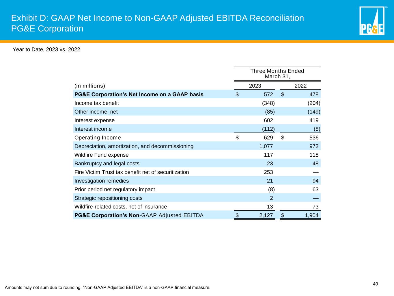 ® 40 Three Months Ended March 31, (in millions) 2023 2022 PG&E Corporation’s Net Income on a GAAP basis $ 572 $ 478 Income tax benefit (348) (204) Other income, net (85) (149) Interest expense 602 419 Interest income (112) (8) Operating Income $ 629 $ 536 Depreciation, amortization, and decommissioning 1,077 972 Wildfire Fund expense 117 118 Bankruptcy and legal costs 23 48 Fire Victim Trust tax benefit net of securitization 253 — Investigation remedies 21 94 Prior period net regulatory impact (8) 63 Strategic repositioning costs 2 — Wildfire-related costs, net of insurance 13 73 PG&E Corporation’s Non-GAAP Adjusted EBITDA $ 2,127 $ 1,904 Exhibit D: GAAP Net Income to Non-GAAP Adjusted EBITDA Reconciliation PG&E Corporation Year to Date, 2023 vs. 2022 Amounts may not sum due to rounding. “Non-GAAP Adjusted EBITDA” is a non-GAAP financial measure.