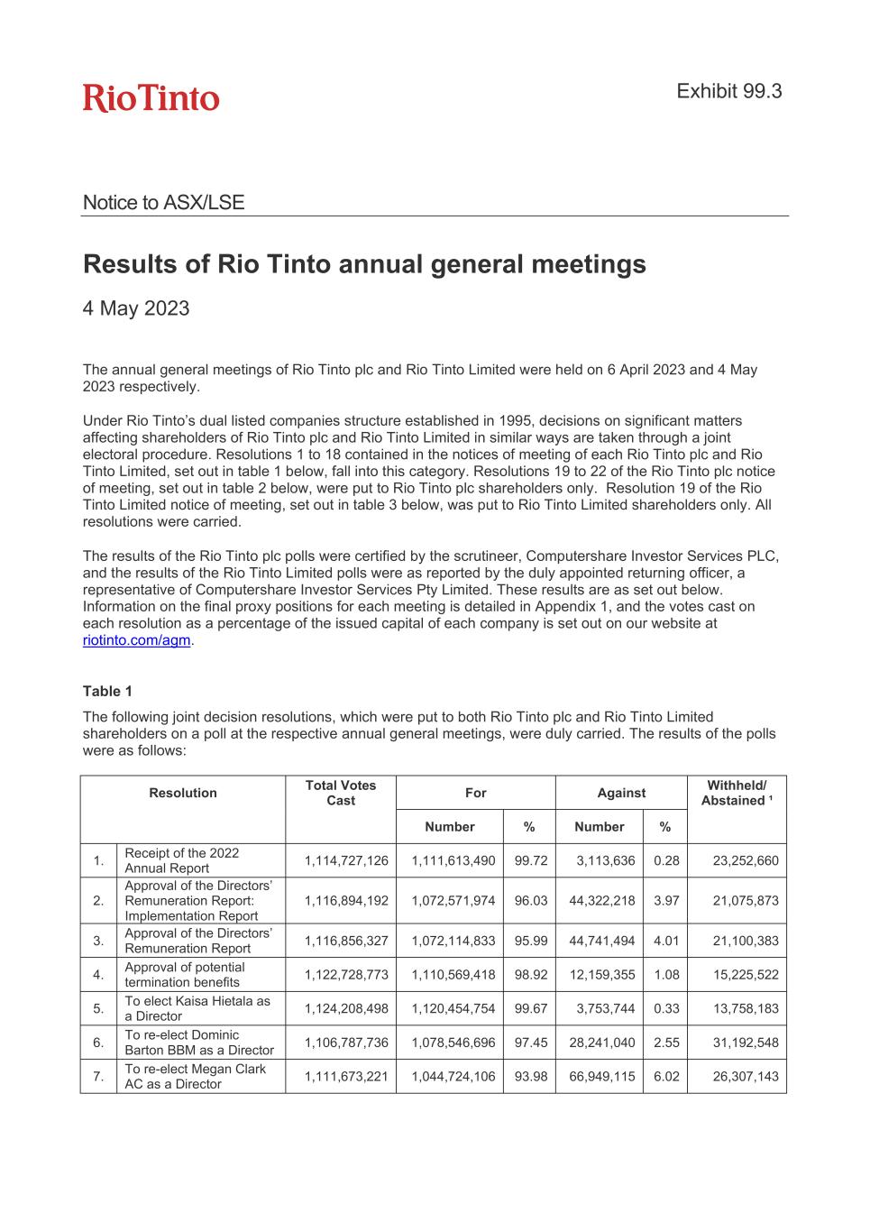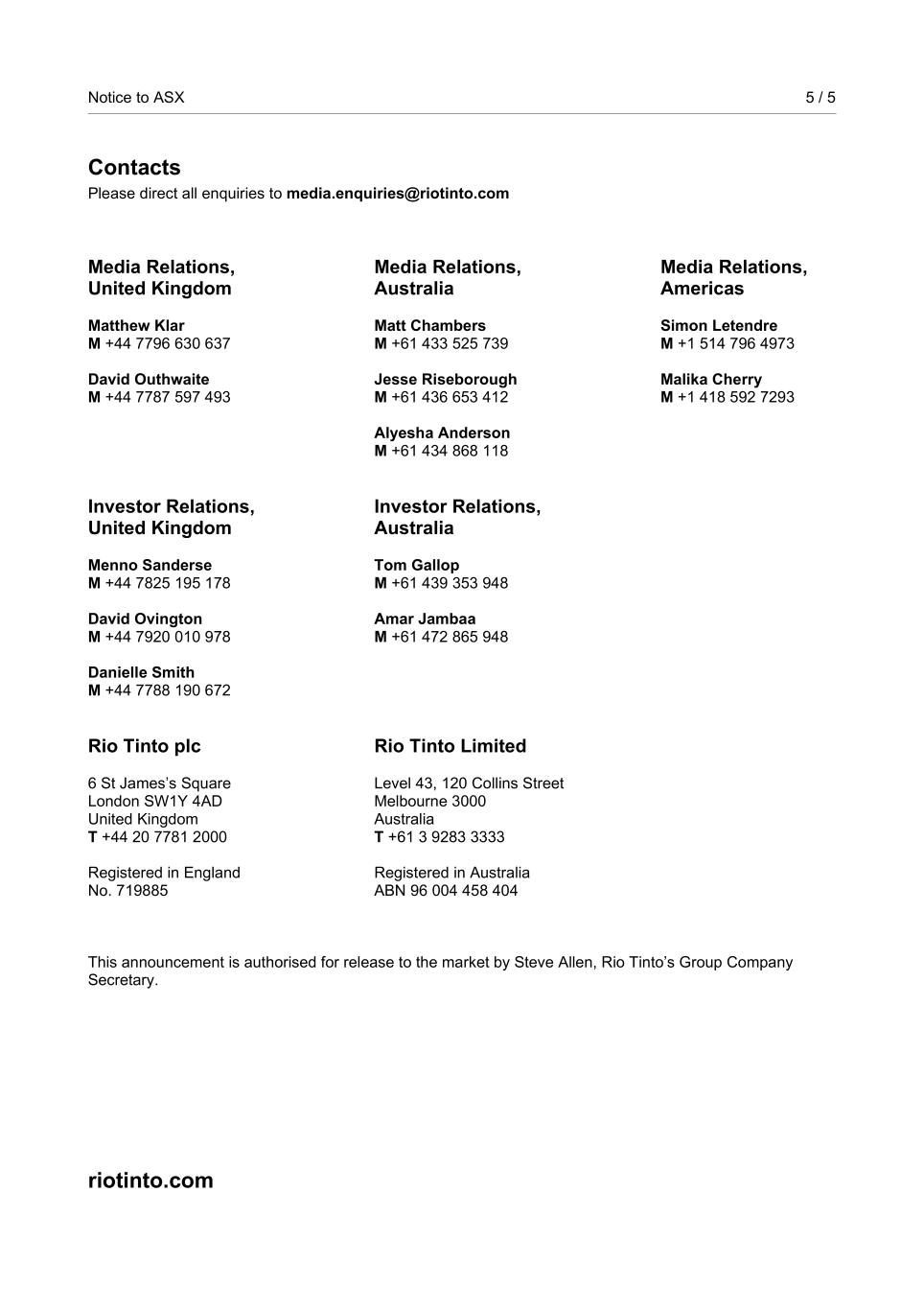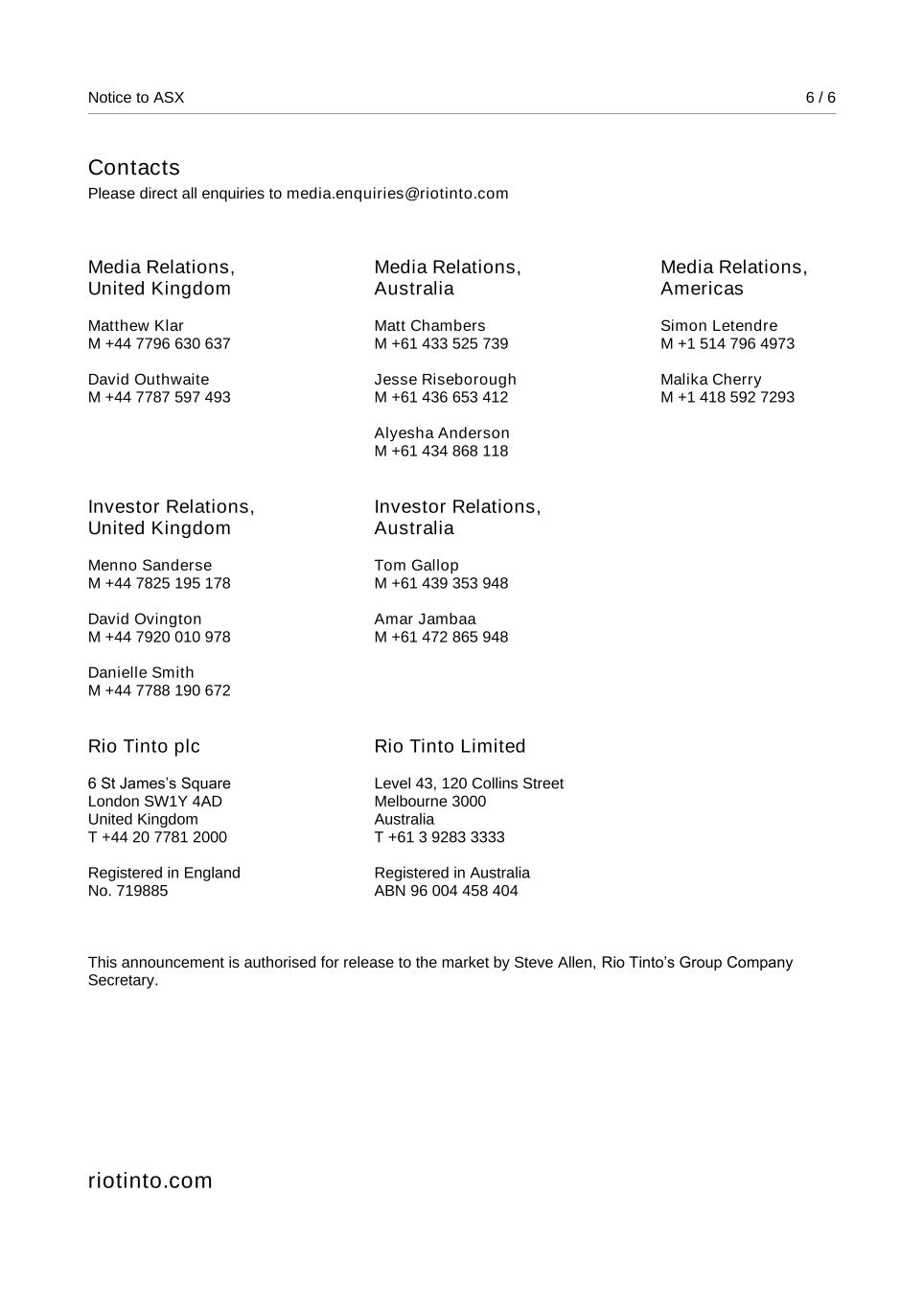 | Rio Tinto plc | Rio Tinto Limited |