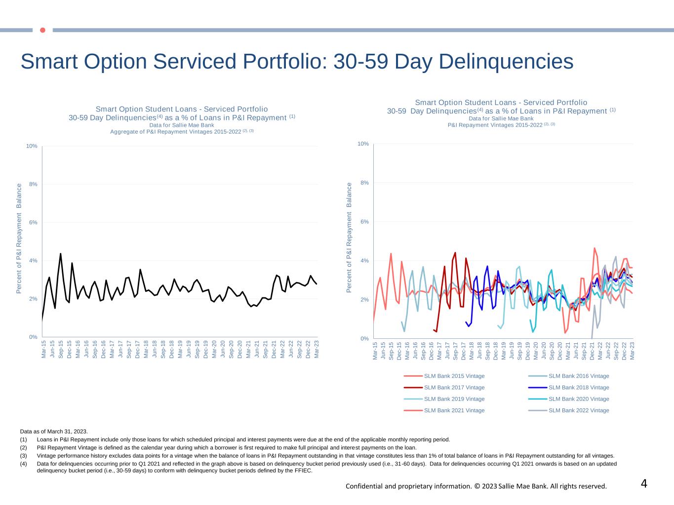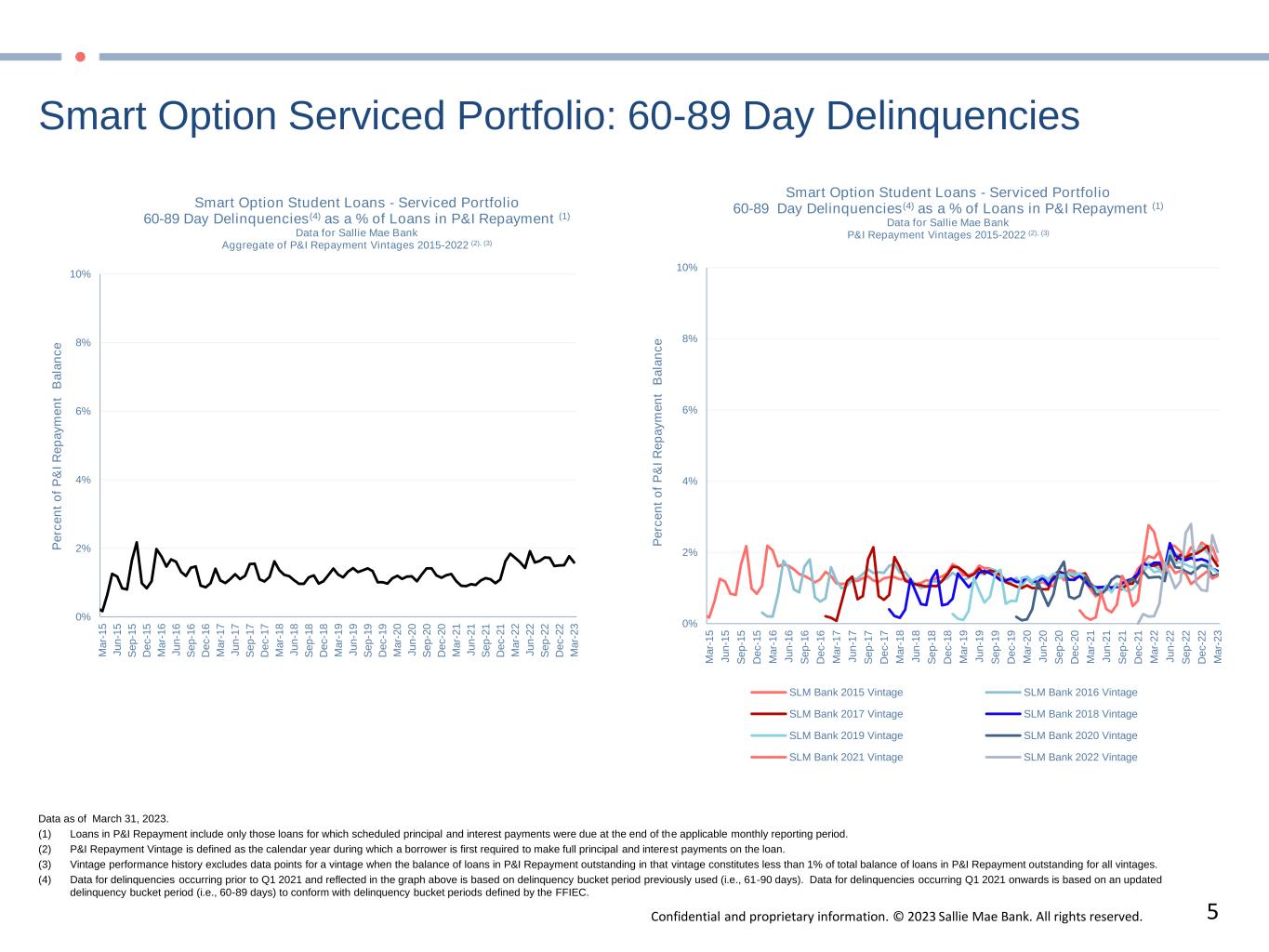 Confidential and proprietary information. © 2023 Sallie Mae Bank. All rights reserved. 4 Smart Option Serviced Portfolio: 30-59 Day Delinquencies 0% 2% 4% 6% 8% 10% M a r- 1 5 J u n -1 5 S e p -1 5 D e c -1 5 M a r- 1 6 J u n -1 6 S e p -1 6 D e c -1 6 M a r- 1 7 J u n -1 7 S e p -1 7 D e c -1 7 M a r- 1 8 J u n -1 8 S e p -1 8 D e c -1 8 M a r- 1 9 J u n -1 9 S e p -1 9 D e c -1 9 M a r- 2 0 J u n -2 0 S e p -2 0 D e c -2 0 M a r- 2 1 J u n -2 1 S e p -2 1 D e c -2 1 M a r- 2 2 J u n -2 2 S e p -2 2 D e c -2 2 M a r- 2 3 P e rc e n t  o f  P & I  R e p a y m e n t   B a la n c e Smart Option Student Loans - Serviced Portfolio 30-59 Day Delinquencies(4) as a % of Loans in P&I Repayment (1) Data for Sallie Mae Bank Aggregate of P&I Repayment Vintages 2015-2022 (2), (3) Data as of March 31, 2023. (1) Loans in P&I Repayment include only those loans for which scheduled principal and interest payments were due at the end of the applicable monthly reporting period. (2) P&I Repayment Vintage is defined as the calendar year during which a borrower is first required to make full principal and interest payments on the loan. (3) Vintage performance history excludes data points for a vintage when the balance of loans in P&I Repayment outstanding in that vintage constitutes less than 1% of total balance of loans in P&I Repayment outstanding for all vintages. (4) Data for delinquencies occurring prior to Q1 2021 and reflected in the graph above is based on delinquency bucket period previously used (i.e., 31-60 days). Data for delinquencies occurring Q1 2021 onwards is based on an updated  delinquency bucket period (i.e., 30-59 days) to conform with delinquency bucket periods defined by the FFIEC.  0% 2% 4% 6% 8% 10% M a r- 1 5 J u n -1 5 S e p -1 5 D e c -1 5 M a r- 1 6 J u n -1 6 S e p -1 6 D e c -1 6 M a r- 1 7 J u n -1 7 S e p -1 7 D e c -1 7 M a r- 1 8 J u n -1 8 S e p -1 8 D e c -1 8 M a r- 1 9 J u n -1 9 S e p -1 9 D e c -1 9 M a r- 2 0 J u n -2 0 S e p -2 0 D e c -2 0 M a r- 2 1 J u n -2 1 S e p -2 1 D e c -2 1 M a r- 2 2 J u n -2 2 S e p -2 2 D e c -2 2 M a r- 2 3 P e rc e n t  o f  P & I  R e p a y m e n t   B a la n c e Smart Option Student Loans - Serviced Portfolio 30-59  Day Delinquencies(4) as a % of Loans in P&I Repayment (1) Data for Sallie Mae Bank P&I Repayment Vintages 2015-2022 (2), (3) SLM Bank 2015 Vintage SLM Bank 2016 Vintage SLM Bank 2017 Vintage SLM Bank 2018 Vintage SLM Bank 2019 Vintage SLM Bank 2020 Vintage SLM Bank 2021 Vintage SLM Bank 2022 Vintage