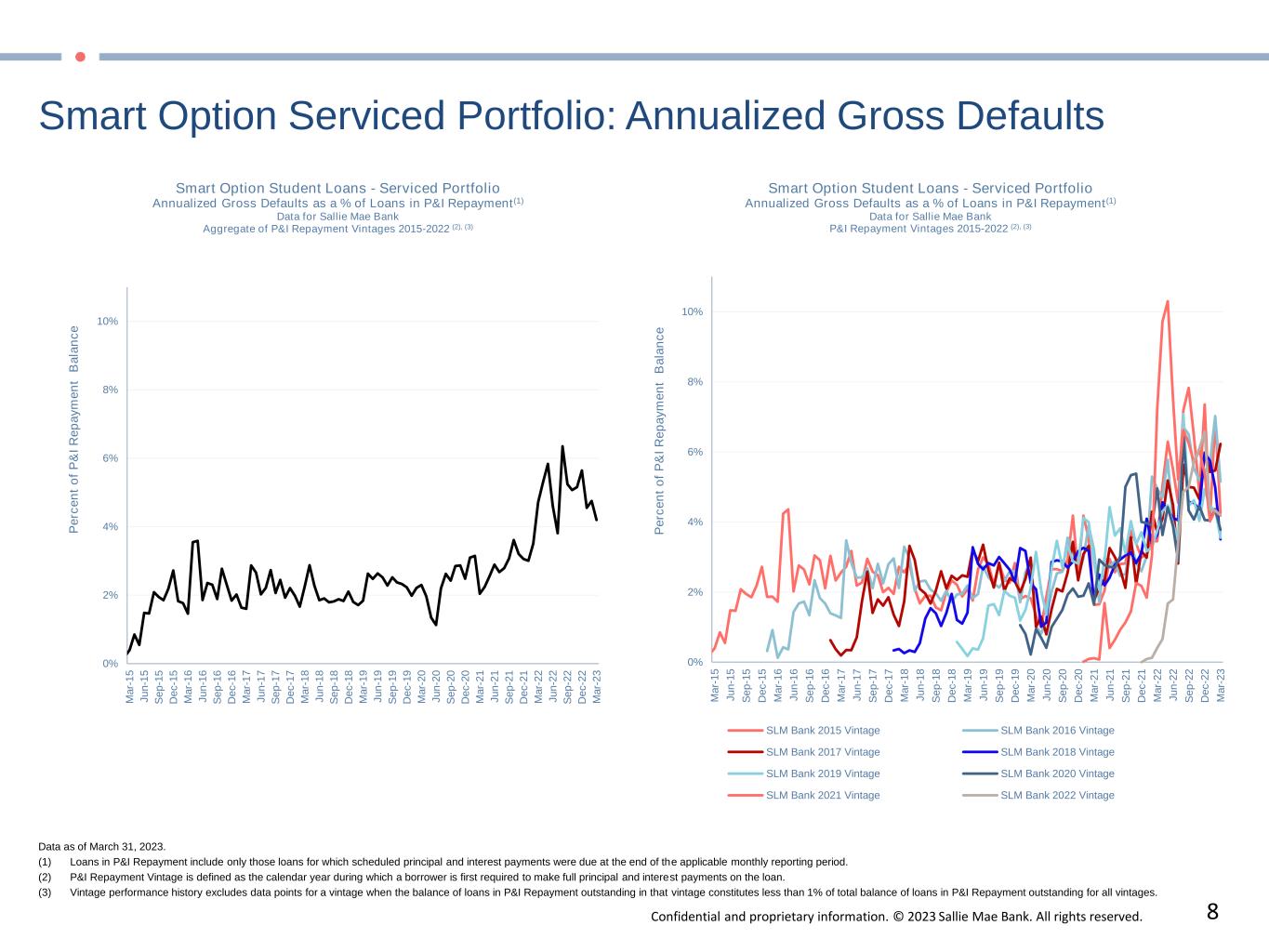 Confidential and proprietary information. © 2023 Sallie Mae Bank. All rights reserved. 7 Smart Option Serviced Portfolio: Forbearance 0% 5% 10% 15% 20% 25% 30% 35% 40% 45% M a r- 1 5 J u n -1 5 S e p -1 5 D e c -1 5 M a r- 1 6 J u n -1 6 S e p -1 6 D e c -1 6 M a r- 1 7 J u n -1 7 S e p -1 7 D e c -1 7 M a r- 1 8 J u n -1 8 S e p -1 8 D e c -1 8 M a r- 1 9 J u n -1 9 S e p -1 9 D e c -1 9 M a r- 2 0 J u n -2 0 S e p -2 0 D e c -2 0 M a r- 2 1 J u n -2 1 S e p -2 1 D e c -2 1 M a r- 2 2 J u n -2 2 S e p -2 2 D e c -2 2 M a r- 2 3 P e rc e n t  o f  P & I  R e p a y m e n t  a n d  F o rb e a ra n c e    B a la n c e Smart Option Student Loans - Serviced Portfolio Forbearance as a % of Loans in P&I Repayment and Forbearance (1), (2) Data for Sallie Mae Bank Aggregate of P&I Repayment Vintages 2015-2022 (3),(4) 0% 5% 10% 15% 20% 25% 30% 35% 40% 45% M a r- 1 5 J u n -1 5 S e p -1 5 D e c -1 5 M a r- 1 6 J u n -1 6 S e p -1 6 D e c -1 6 M a r- 1 7 J u n -1 7 S e p -1 7 D e c -1 7 M a r- 1 8 J u n -1 8 S e p -1 8 D e c -1 8 M a r- 1 9 J u n -1 9 S e p -1 9 D e c -1 9 M a r- 2 0 J u n -2 0 S e p -2 0 D e c -2 0 M a r- 2 1 J u n -2 1 S e p -2 1 D e c -2 1 M a r- 2 2 J u n -2 2 S e p -2 2 D e c -2 2 M a r- 2 3 P e rc e n t  o f  P & I  R e p a y m e n t  a n d  F o rb e a ra n c e    B a la n c e Smart Option Student Loans - Serviced Portfolio Forbearance as a % of Loans in P&I Repayment and Forbearance (1),(2) Data for Sallie Mae Bank P&I Repayment Vintages 2015-2022(3),(4) SLM Bank 2015 Vintage SLM Bank 2016 Vintage SLM Bank 2017 Vintage SLM Bank 2018 Vintage SLM Bank 2019 Vintage SLM Bank 2020 Vintage SLM Bank 2021 Vintage SLM Bank 2022 Vintage Data as of March 31, 2023. (1) Loans in P&I Repayment include only those loans for which scheduled principal and interest payments were due at the end of the applicable monthly reporting period. (2) COVID-related disaster forbearance includes activity of current as well as delinquent accounts. (3) P&I Repayment Vintage is defined as the calendar year during which a borrower is first required to make full principal and interest payments on the loan. (4) Vintage performance history excludes data points for a vintage when the balance of loans in P&I Repayment outstanding in that vintage constitutes less than 1% of total balance of loans in P&I Repayment outstanding for all vintages.