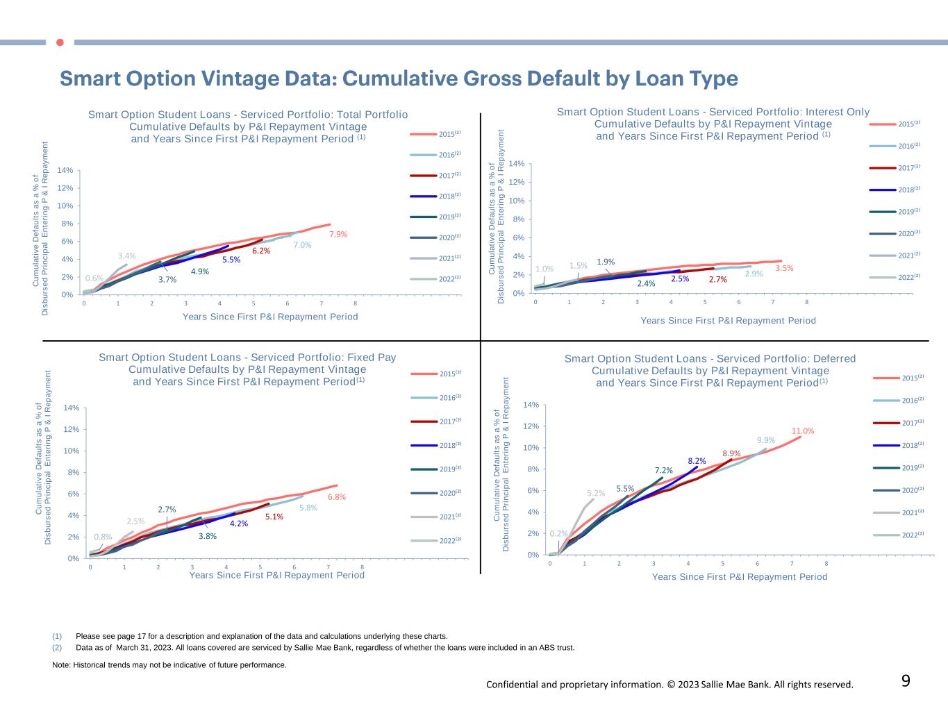 Confidential and proprietary information. © 2023 Sallie Mae Bank. All rights reserved. 8 Data as of March 31, 2023. (1) Loans in P&I Repayment include only those loans for which scheduled principal and interest payments were due at the end of the applicable monthly reporting period. (2) P&I Repayment Vintage is defined as the calendar year during which a borrower is first required to make full principal and interest payments on the loan. (3) Vintage performance history excludes data points for a vintage when the balance of loans in P&I Repayment outstanding in that vintage constitutes less than 1% of total balance of loans in P&I Repayment outstanding for all vintages. Smart Option Serviced Portfolio: Annualized Gross Defaults 0% 2% 4% 6% 8% 10% M a r- 1 5 J u n -1 5 S e p -1 5 D e c -1 5 M a r- 1 6 J u n -1 6 S e p -1 6 D e c -1 6 M a r- 1 7 J u n -1 7 S e p -1 7 D e c -1 7 M a r- 1 8 J u n -1 8 S e p -1 8 D e c -1 8 M a r- 1 9 J u n -1 9 S e p -1 9 D e c -1 9 M a r- 2 0 J u n -2 0 S e p -2 0 D e c -2 0 M a r- 2 1 J u n -2 1 S e p -2 1 D e c -2 1 M a r- 2 2 J u n -2 2 S e p -2 2 D e c -2 2 M a r- 2 3 P e rc e n t  o f  P & I  R e p a y m e n t   B a la n c e Smart Option Student Loans - Serviced Portfolio Annualized Gross Defaults as a % of Loans in P&I Repayment(1) Data for Sallie Mae Bank Aggregate of P&I Repayment Vintages 2015-2022 (2), (3) 0% 2% 4% 6% 8% 10% M a r- 1 5 J u n -1 5 S e p -1 5 D e c -1 5 M a r- 1 6 J u n -1 6 S e p -1 6 D e c -1 6 M a r- 1 7 J u n -1 7 S e p -1 7 D e c -1 7 M a r- 1 8 J u n -1 8 S e p -1 8 D e c -1 8 M a r- 1 9 J u n -1 9 S e p -1 9 D e c -1 9 M a r- 2 0 J u n -2 0 S e p -2 0 D e c -2 0 M a r- 2 1 J u n -2 1 S e p -2 1 D e c -2 1 M a r- 2 2 J u n -2 2 S e p -2 2 D e c -2 2 M a r- 2 3 P e rc e n t  o f  P & I  R e p a y m e n t   B a la n c e Smart Option Student Loans - Serviced Portfolio Annualized Gross Defaults as a % of Loans in P&I Repayment(1) Data for Sallie Mae Bank P&I Repayment Vintages 2015-2022 (2), (3) SLM Bank 2015 Vintage SLM Bank 2016 Vintage SLM Bank 2017 Vintage SLM Bank 2018 Vintage SLM Bank 2019 Vintage SLM Bank 2020 Vintage SLM Bank 2021 Vintage SLM Bank 2022 Vintage