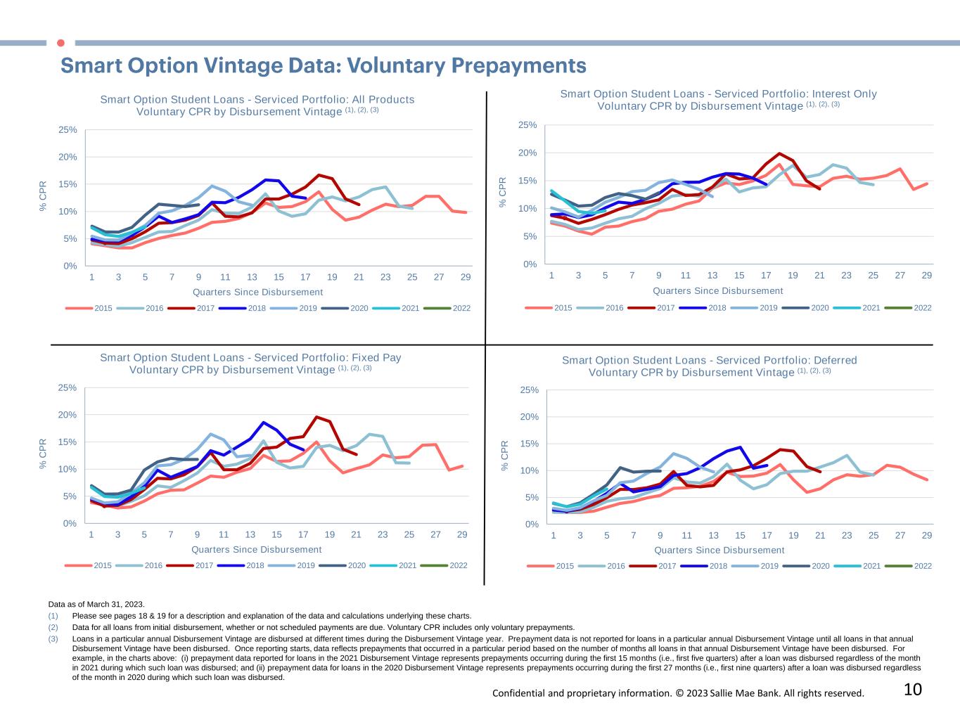 Confidential and proprietary information. © 2023 Sallie Mae Bank. All rights reserved. 9 3.5%  2.9%  2.7% 2.5%  2.4%  1.9% 1.5% 1.0% 0% 2% 4% 6% 8% 10% 12% 14% 0 1 2 3 4 5 6 7 8 C u m u la ti v e  D e fa u lt s  a s  a  %  o f D is b u rs e d  P ri n c ip a l   E n te ri n g  P  &  I  R e p a y m e n t Years Since First P&I Repayment Period Smart Option Student Loans - Serviced Portfolio: Interest Only Cumulative Defaults by P&I Repayment Vintage  and Years Since First P&I Repayment Period (1)  2015⁽²⁾ 2016⁽²⁾ 2017⁽²⁾ 2018⁽²⁾ 2019⁽²⁾ 2020⁽²⁾ 2021⁽²⁾ 2022⁽²⁾ 6.8% 5.8%  5.1%  4.2%  3.8%  2.7%  2.5%  0.8% 0% 2% 4% 6% 8% 10% 12% 14% 0 1 2 3 4 5 6 7 8 C u m u la ti v e  D e fa u lt s  a s  a  %  o f D is b u rs e d  P ri n c ip a l   E n te ri n g  P  &  I  R e p a y m e n t Years Since First P&I Repayment Period Smart Option Student Loans - Serviced Portfolio: Fixed Pay Cumulative Defaults by P&I Repayment Vintage and Years Since First P&I Repayment Period(1)  2015⁽²⁾ 2016⁽²⁾ 2017⁽²⁾ 2018⁽²⁾ 2019⁽²⁾ 2020⁽²⁾ 2021⁽²⁾ 2022⁽²⁾ 11.0% 9.9%  8.9%  8.2%  7.2%  5.5% 5.2%  0.2% 0% 2% 4% 6% 8% 10% 12% 14% 0 1 2 3 4 5 6 7 8 C u m u la ti v e  D e fa u lt s  a s  a  %  o f D is b u rs e d  P ri n c ip a l   E n te ri n g  P  &  I  R e p a y m e n t Years Since First P&I Repayment Period Smart Option Student Loans - Serviced Portfolio: Deferred Cumulative Defaults by P&I Repayment Vintage and Years Since First P&I Repayment Period(1) 2015⁽²⁾ 2016⁽²⁾ 2017⁽²⁾ 2018⁽²⁾ 2019⁽²⁾ 2020⁽²⁾ 2021⁽²⁾ 2022⁽²⁾ (1) Please see page 17 for a description and explanation of the data and calculations underlying these charts. (2) Data as of March 31, 2023. All loans covered are serviced by Sallie Mae Bank, regardless of whether the loans were included in an ABS trust.  Note: Historical trends may not be indicative of future performance.  7.9%  7.0%  6.2%  5.5%  4.9%  3.7%  3.4%  0.6% 0% 2% 4% 6% 8% 10% 12% 14% 0 1 2 3 4 5 6 7 8 C u m u la ti v e  D e fa u lt s  a s  a  %  o f D is b u rs e d  P ri n c ip a l   E n te ri n g  P  &  I  R e p a y m e n t Years Since First P&I Repayment Period Smart Option Student Loans - Serviced Portfolio: Total Portfolio Cumulative Defaults by P&I Repayment Vintage  and Years Since First P&I Repayment Period (1) 2015⁽²⁾ 2016⁽²⁾ 2017⁽²⁾ 2018⁽²⁾ 2019⁽²⁾ 2020⁽²⁾ 2021⁽²⁾ 2022⁽²⁾
