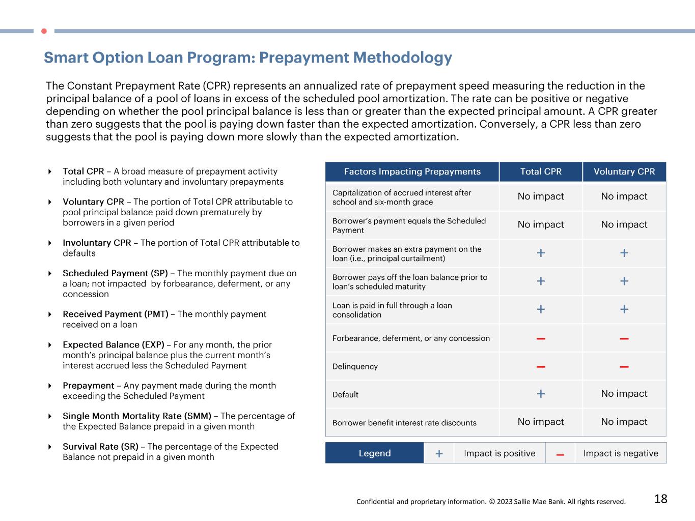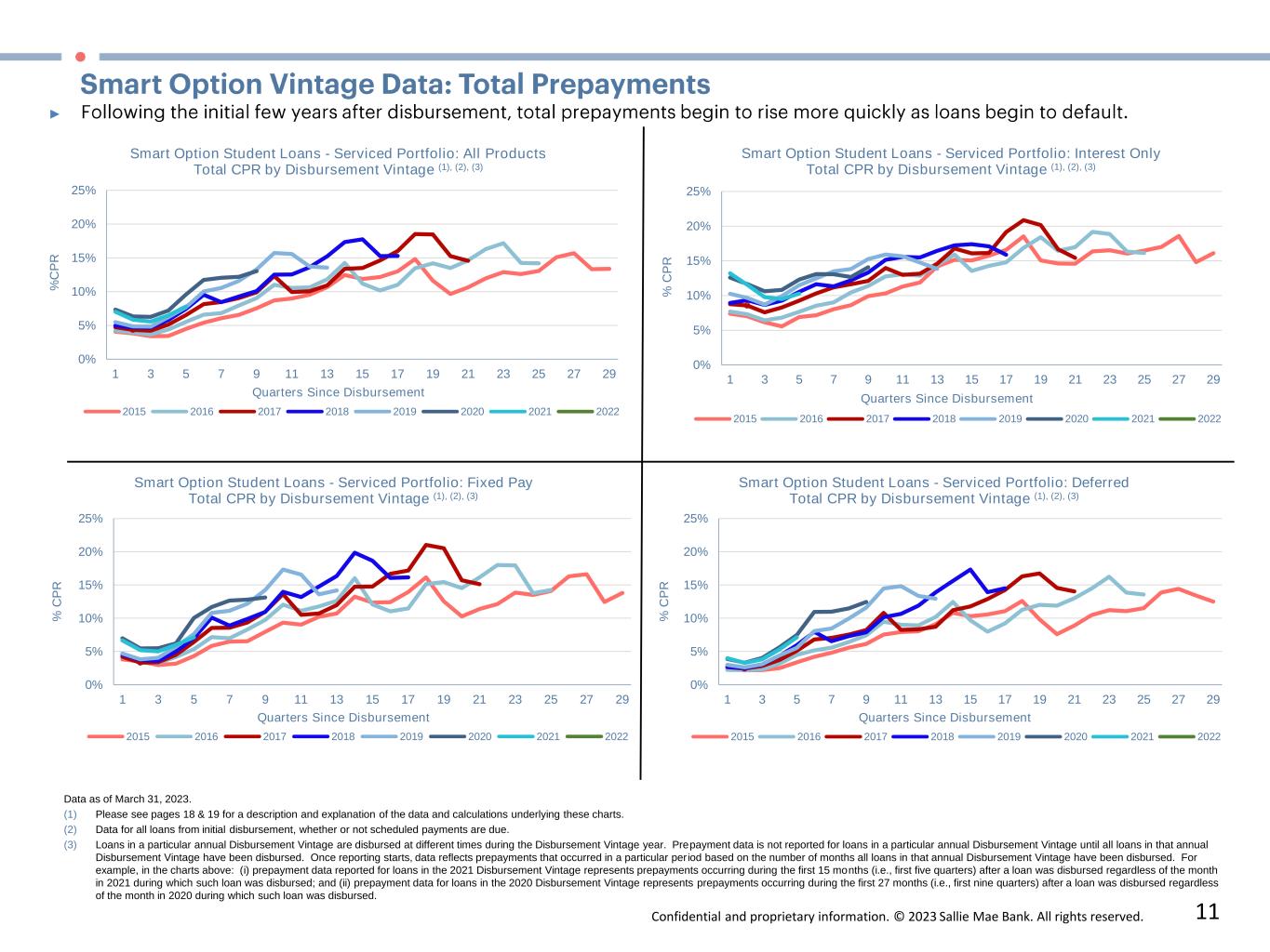 Confidential and proprietary information. © 2023 Sallie Mae Bank. All rights reserved. 10 Data as of March 31, 2023. (1) Please see pages 18 & 19 for a description and explanation of the data and calculations underlying these charts. (2) Data for all loans from initial disbursement, whether or not scheduled payments are due. Voluntary CPR includes only voluntary prepayments. (3) Loans in a particular annual Disbursement Vintage are disbursed at different times during the Disbursement Vintage year.  Prepayment data is not reported for loans in a particular annual Disbursement Vintage until all loans in that annual  Disbursement Vintage have been disbursed.  Once reporting starts, data reflects prepayments that occurred in a particular period based on the number of months all loans in that annual Disbursement Vintage have been disbursed.  For  example, in the charts above:  (i) prepayment data reported for loans in the 2021 Disbursement Vintage represents prepayments occurring during the first 15 months (i.e., first five quarters) after a loan was disbursed regardless of the month  in 2021 during which such loan was disbursed; and (ii) prepayment data for loans in the 2020 Disbursement Vintage represents prepayments occurring during the first 27 months (i.e., first nine quarters) after a loan was disbursed regardless  of the month in 2020 during which such loan was disbursed. 0% 5% 10% 15% 20% 25% 1 3 5 7 9 11 13 15 17 19 21 23 25 27 29 %  C P R Quarters Since Disbursement Smart Option Student Loans - Serviced Portfolio: All Products Voluntary CPR by Disbursement Vintage (1), (2), (3) 2015 2016 2017 2018 2019 2020 2021 2022 0% 5% 10% 15% 20% 25% 1 3 5 7 9 11 13 15 17 19 21 23 25 27 29 %  C P R Quarters Since Disbursement Smart Option Student Loans - Serviced Portfolio: Interest Only Voluntary CPR by Disbursement Vintage (1), (2), (3) 2015 2016 2017 2018 2019 2020 2021 2022 0% 5% 10% 15% 20% 25% 1 3 5 7 9 11 13 15 17 19 21 23 25 27 29 %  C P R Quarters Since Disbursement Smart Option Student Loans - Serviced Portfolio: Fixed Pay Voluntary CPR by Disbursement Vintage (1), (2), (3) 2015 2016 2017 2018 2019 2020 2021 2022 0% 5% 10% 15% 20% 25% 1 3 5 7 9 11 13 15 17 19 21 23 25 27 29 %  C P R Quarters Since Disbursement Smart Option Student Loans - Serviced Portfolio: Deferred Voluntary CPR by Disbursement Vintage (1), (2), (3) 2015 2016 2017 2018 2019 2020 2021 2022