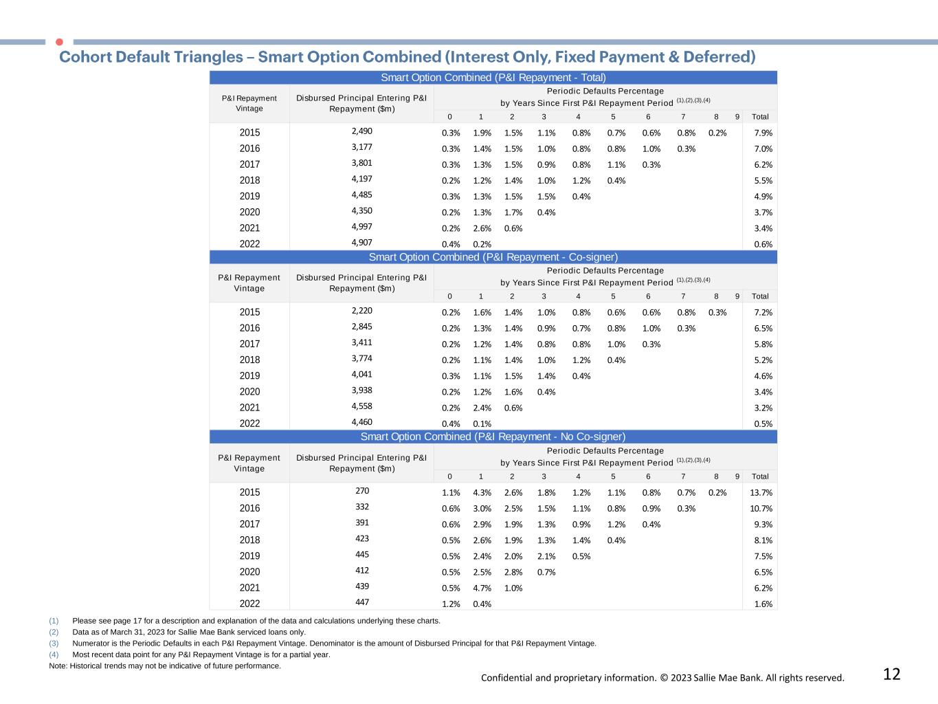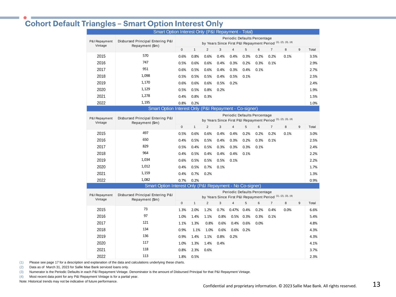 Confidential and proprietary information. © 2023 Sallie Mae Bank. All rights reserved. 12 (1) Please see page 17 for a description and explanation of the data and calculations underlying these charts. (2) Data as of March 31, 2023 for Sallie Mae Bank serviced loans only. (3) Numerator is the Periodic Defaults in each P&I Repayment Vintage. Denominator is the amount of Disbursed Principal for that P&I Repayment Vintage. (4) Most recent data point for any P&I Repayment Vintage is for a partial year. Note: Historical trends may not be indicative of future performance.  0 1 2 3 4 5 6 7 8 9 Total 2015 2,490 0.3% 1.9% 1.5% 1.1% 0.8% 0.7% 0.6% 0.8% 0.2% 7.9% 2016 3,177 0.3% 1.4% 1.5% 1.0% 0.8% 0.8% 1.0% 0.3% 7.0% 2017 3,801 0.3% 1.3% 1.5% 0.9% 0.8% 1.1% 0.3% 6.2% 2018 4,197 0.2% 1.2% 1.4% 1.0% 1.2% 0.4% 5.5% 2019 4,485 0.3% 1.3% 1.5% 1.5% 0.4% 4.9% 2020 4,350 0.2% 1.3% 1.7% 0.4% 3.7% 2021 4,997 0.2% 2.6% 0.6% 3.4% 2022 4,907 0.4% 0.2% 0.6% 0 1 2 3 4 5 6 7 8 9 Total 2015 2,220 0.2% 1.6% 1.4% 1.0% 0.8% 0.6% 0.6% 0.8% 0.3% 7.2% 2016 2,845 0.2% 1.3% 1.4% 0.9% 0.7% 0.8% 1.0% 0.3% 6.5% 2017 3,411 0.2% 1.2% 1.4% 0.8% 0.8% 1.0% 0.3% 5.8% 2018 3,774 0.2% 1.1% 1.4% 1.0% 1.2% 0.4% 5.2% 2019 4,041 0.3% 1.1% 1.5% 1.4% 0.4% 4.6% 2020 3,938 0.2% 1.2% 1.6% 0.4% 3.4% 2021 4,558 0.2% 2.4% 0.6% 3.2% 2022 4,460 0.4% 0.1% 0.5% 0 1 2 3 4 5 6 7 8 9 Total 2015 270 1.1% 4.3% 2.6% 1.8% 1.2% 1.1% 0.8% 0.7% 0.2% 13.7% 2016 332 0.6% 3.0% 2.5% 1.5% 1.1% 0.8% 0.9% 0.3% 10.7% 2017 391 0.6% 2.9% 1.9% 1.3% 0.9% 1.2% 0.4% 9.3% 2018 423 0.5% 2.6% 1.9% 1.3% 1.4% 0.4% 8.1% 2019 445 0.5% 2.4% 2.0% 2.1% 0.5% 7.5% 2020 412 0.5% 2.5% 2.8% 0.7% 6.5% 2021 439 0.5% 4.7% 1.0% 6.2% 2022 447 1.2% 0.4% 1.6% Smart Option Combined (P&I Repayment - No Co-signer) P&I Repayment  Vintage Disbursed Principal Entering P&I  Repayment ($m) Smart Option Combined (P&I Repayment - Total) P&I Repayment  Vintage Disbursed Principal Entering P&I  Repayment ($m) Periodic Defaults Percentage by Years Since First P&I Repayment Period (1),(2),(3),(4) Smart Option Combined (P&I Repayment - Co-signer) P&I Repayment  Vintage Disbursed Principal Entering P&I  Repayment ($m) Periodic Defaults Percentage by Years Since First P&I Repayment Period (1),(2),(3),(4) Periodic Defaults Percentage by Years Since First P&I Repayment Period (1),(2),(3),(4)