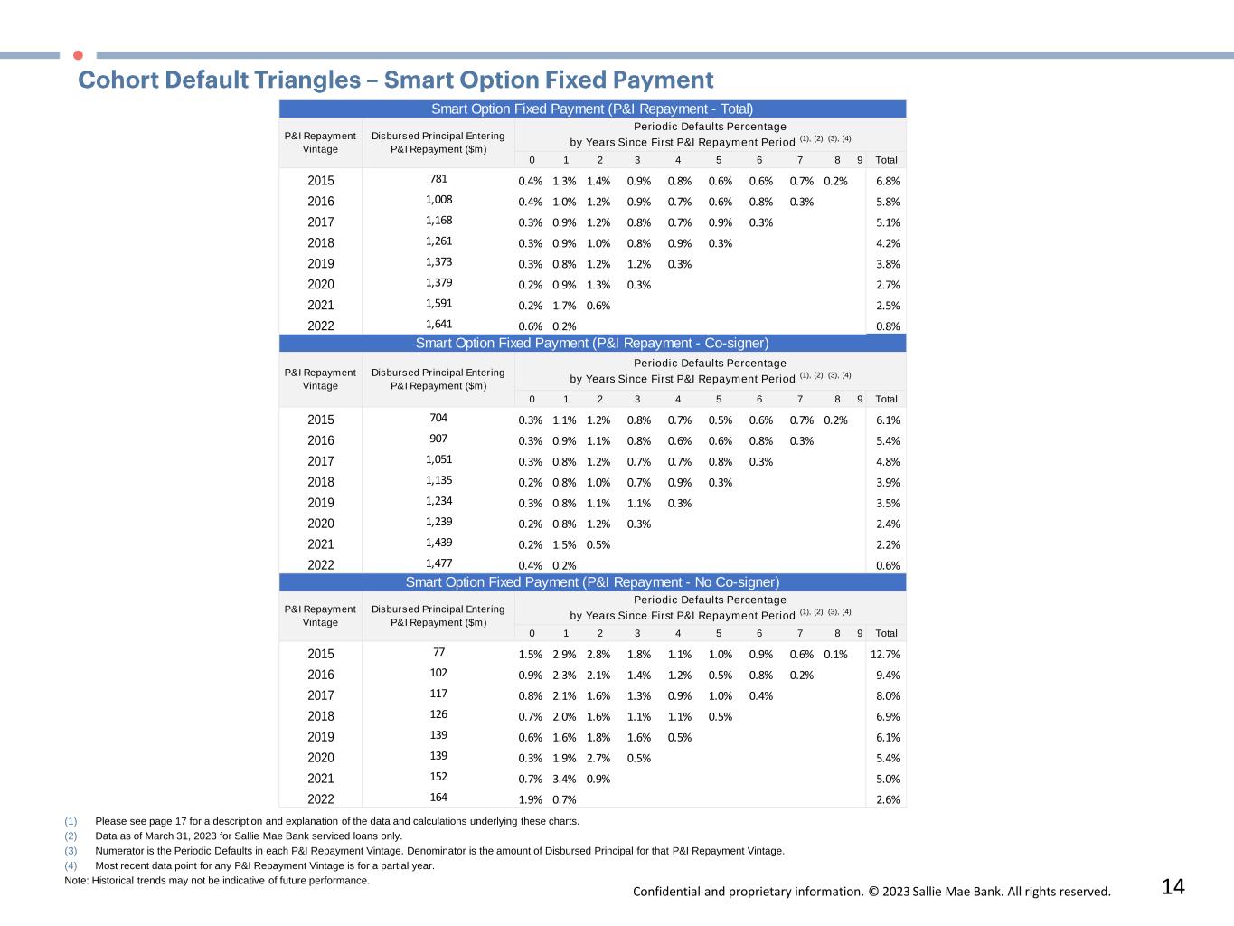 Confidential and proprietary information. © 2023 Sallie Mae Bank. All rights reserved. 13 (1) Please see page 17 for a description and explanation of the data and calculations underlying these charts. (2) Data as of  March 31, 2023 for Sallie Mae Bank serviced loans only. (3) Numerator is the Periodic Defaults in each P&I Repayment Vintage. Denominator is the amount of Disbursed Principal for that P&I Repayment Vintage. (4) Most recent data point for any P&I Repayment Vintage is for a partial year. Note: Historical trends may not be indicative of future performance.  0 1 2 3 4 5 6 7 8 9 Total 2015 570 0.6% 0.8% 0.6% 0.4% 0.4% 0.3% 0.2% 0.2% 0.1% 3.5% 2016 747 0.5% 0.6% 0.6% 0.4% 0.3% 0.2% 0.3% 0.1% 2.9% 2017 951 0.6% 0.5% 0.6% 0.4% 0.3% 0.4% 0.1% 2.7% 2018 1,098 0.5% 0.5% 0.5% 0.4% 0.5% 0.1% 2.5% 2019 1,170 0.6% 0.6% 0.6% 0.5% 0.2% 2.4% 2020 1,129 0.5% 0.5% 0.8% 0.2% 1.9% 2021 1,278 0.4% 0.8% 0.3% 1.5% 2022 1,195 0.8% 0.2% 1.0% 0 1 2 3 4 5 6 7 8 9 Total 2015 497 0.5% 0.6% 0.6% 0.4% 0.4% 0.2% 0.2% 0.2% 0.1% 3.0% 2016 650 0.4% 0.5% 0.5% 0.4% 0.3% 0.2% 0.3% 0.1% 2.5% 2017 829 0.5% 0.4% 0.5% 0.3% 0.3% 0.3% 0.1% 2.4% 2018 964 0.4% 0.5% 0.4% 0.4% 0.4% 0.1% 2.2% 2019 1,034 0.6% 0.5% 0.5% 0.5% 0.1% 2.2% 2020 1,012 0.4% 0.5% 0.7% 0.1% 1.7% 2021 1,159 0.4% 0.7% 0.2% 1.3% 2022 1,082 0.7% 0.2% 0.9% 0 1 2 3 4 5 6 7 8 9 Total 2015 73 1.3% 2.0% 1.2% 0.7% 0.47% 0.4% 0.2% 0.4% 0.0% 6.6% 2016 97 1.0% 1.4% 1.1% 0.8% 0.5% 0.3% 0.3% 0.1% 5.4% 2017 121 1.1% 1.3% 0.8% 0.6% 0.4% 0.6% 0.0% 4.8% 2018 134 0.9% 1.1% 1.0% 0.6% 0.6% 0.2% 4.3% 2019 136 0.9% 1.4% 1.1% 0.8% 0.2% 4.3% 2020 117 1.0% 1.3% 1.4% 0.4% 4.1% 2021 118 0.8% 2.3% 0.6% 3.7% 2022 113 1.8% 0.5% 2.3% Smart Option Interest Only (P&I Repayment - No Co-signer) P&I Repayment  Vintage Disbursed Principal Entering P&I  Repayment ($m) Periodic Defaults Percentage by Years Since First P&I Repayment Period (1), (2), (3), (4) Smart Option Interest Only (P&I Repayment - Total) P&I Repayment  Vintage Disbursed Principal Entering P&I  Repayment ($m) Periodic Defaults Percentage by Years Since First P&I Repayment Period (1), (2), (3), (4) Smart Option Interest Only (P&I Repayment - Co-signer) P&I Repayment  Vintage Disbursed Principal Entering P&I  Repayment ($m) Periodic Defaults Percentage by Years Since First P&I Repayment Period (1), (2), (3), (4)