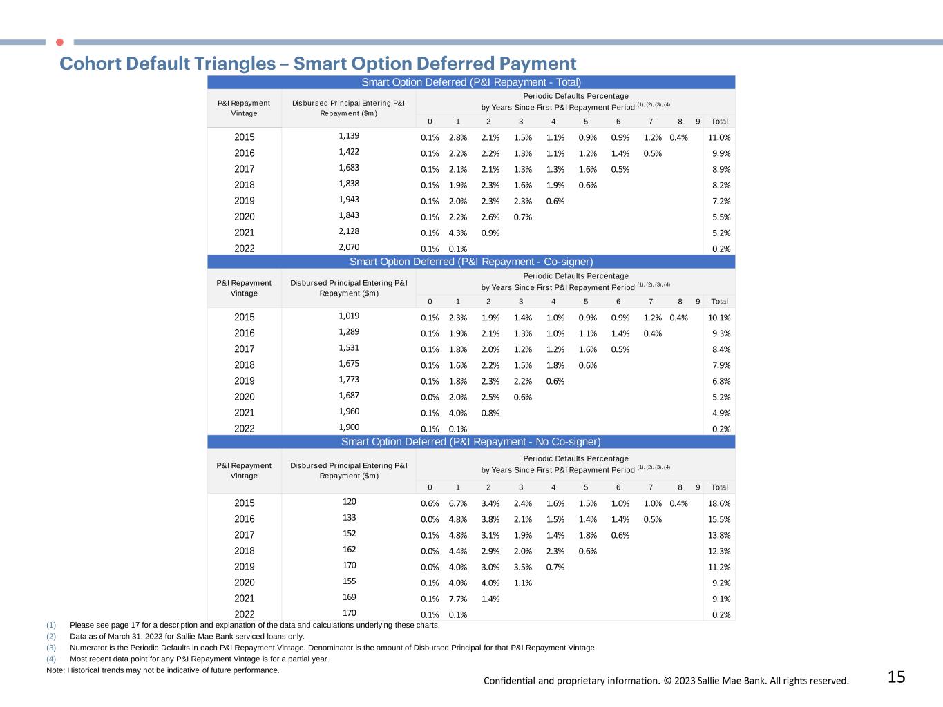 Confidential and proprietary information. © 2023 Sallie Mae Bank. All rights reserved. 14 (1) Please see page 17 for a description and explanation of the data and calculations underlying these charts. (2) Data as of March 31, 2023 for Sallie Mae Bank serviced loans only. (3) Numerator is the Periodic Defaults in each P&I Repayment Vintage. Denominator is the amount of Disbursed Principal for that P&I Repayment Vintage. (4) Most recent data point for any P&I Repayment Vintage is for a partial year. Note: Historical trends may not be indicative of future performance.  0 1 2 3 4 5 6 7 8 9 Total 2015 781 0.4% 1.3% 1.4% 0.9% 0.8% 0.6% 0.6% 0.7% 0.2% 6.8% 2016 1,008 0.4% 1.0% 1.2% 0.9% 0.7% 0.6% 0.8% 0.3% 5.8% 2017 1,168 0.3% 0.9% 1.2% 0.8% 0.7% 0.9% 0.3% 5.1% 2018 1,261 0.3% 0.9% 1.0% 0.8% 0.9% 0.3% 4.2% 2019 1,373 0.3% 0.8% 1.2% 1.2% 0.3% 3.8% 2020 1,379 0.2% 0.9% 1.3% 0.3% 2.7% 2021 1,591 0.2% 1.7% 0.6% 2.5% 2022 1,641 0.6% 0.2% 0.8% 0 1 2 3 4 5 6 7 8 9 Total 2015 704 0.3% 1.1% 1.2% 0.8% 0.7% 0.5% 0.6% 0.7% 0.2% 6.1% 2016 907 0.3% 0.9% 1.1% 0.8% 0.6% 0.6% 0.8% 0.3% 5.4% 2017 1,051 0.3% 0.8% 1.2% 0.7% 0.7% 0.8% 0.3% 4.8% 2018 1,135 0.2% 0.8% 1.0% 0.7% 0.9% 0.3% 3.9% 2019 1,234 0.3% 0.8% 1.1% 1.1% 0.3% 3.5% 2020 1,239 0.2% 0.8% 1.2% 0.3% 2.4% 2021 1,439 0.2% 1.5% 0.5% 2.2% 2022 1,477 0.4% 0.2% 0.6% 0 1 2 3 4 5 6 7 8 9 Total 2015 77 1.5% 2.9% 2.8% 1.8% 1.1% 1.0% 0.9% 0.6% 0.1% 12.7% 2016 102 0.9% 2.3% 2.1% 1.4% 1.2% 0.5% 0.8% 0.2% 9.4% 2017 117 0.8% 2.1% 1.6% 1.3% 0.9% 1.0% 0.4% 8.0% 2018 126 0.7% 2.0% 1.6% 1.1% 1.1% 0.5% 6.9% 2019 139 0.6% 1.6% 1.8% 1.6% 0.5% 6.1% 2020 139 0.3% 1.9% 2.7% 0.5% 5.4% 2021 152 0.7% 3.4% 0.9% 5.0% 2022 164 1.9% 0.7% 2.6% Smart Option Fixed Payment (P&I Repayment - No Co-signer) P&I Repayment  Vintage Disbursed Principal Entering  P&I Repayment ($m) Periodic Defaults Percentage by Years Since First P&I Repayment Period (1), (2), (3), (4) Smart Option Fixed Payment (P&I Repayment - Total) P&I Repayment  Vintage Disbursed Principal Entering  P&I Repayment ($m) Periodic Defaults Percentage by Years Since First P&I Repayment Period (1), (2), (3), (4) Smart Option Fixed Payment (P&I Repayment - Co-signer) P&I Repayment  Vintage Disbursed Principal Entering  P&I Repayment ($m) Periodic Defaults Percentage by Years Since First P&I Repayment Period (1), (2), (3), (4)