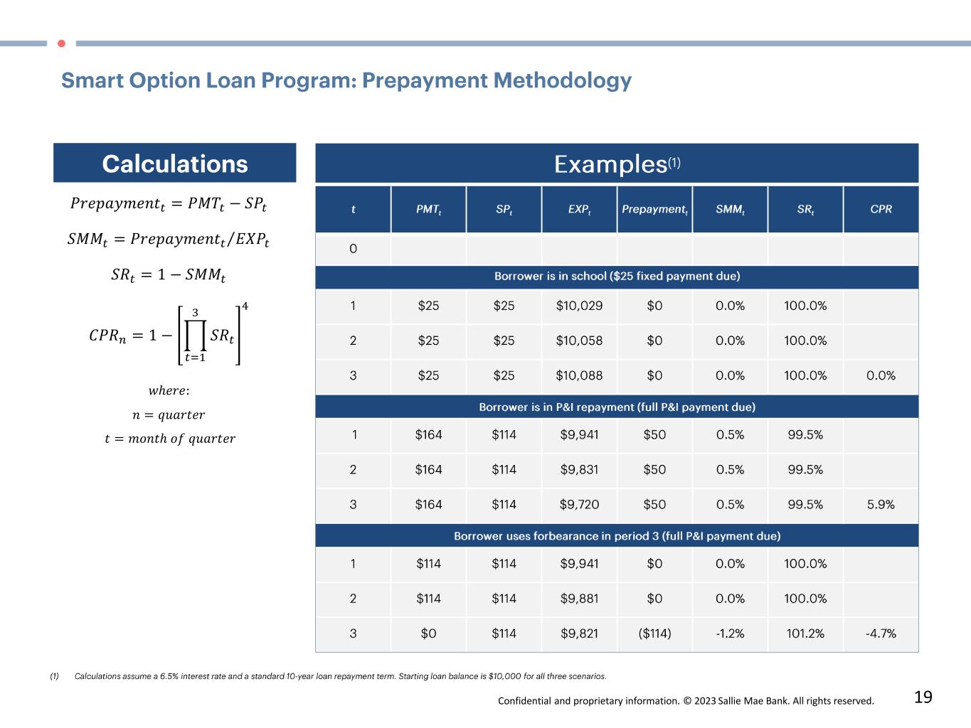 Confidential and proprietary information. © 2023 Sallie Mae Bank. All rights reserved. 19 𝑃𝑟𝑒𝑝𝑎𝑦𝑚𝑒𝑛𝑡𝑡 = 𝑃𝑀𝑇𝑡 − 𝑆𝑃𝑡 𝑆𝑀𝑀𝑡 = Τ𝑃𝑟𝑒𝑝𝑎𝑦𝑚𝑒𝑛𝑡𝑡 𝐸𝑋𝑃𝑡 𝑆𝑅𝑡 = 1 − 𝑆𝑀𝑀𝑡 𝐶𝑃𝑅𝑛 = 1 − ෑ 𝑡=1 3 𝑆𝑅𝑡 4 𝑤ℎ𝑒𝑟𝑒: 𝑛 = 𝑞𝑢𝑎𝑟𝑡𝑒𝑟 𝑡 = 𝑚𝑜𝑛𝑡ℎ 𝑜𝑓 𝑞𝑢𝑎𝑟𝑡𝑒𝑟