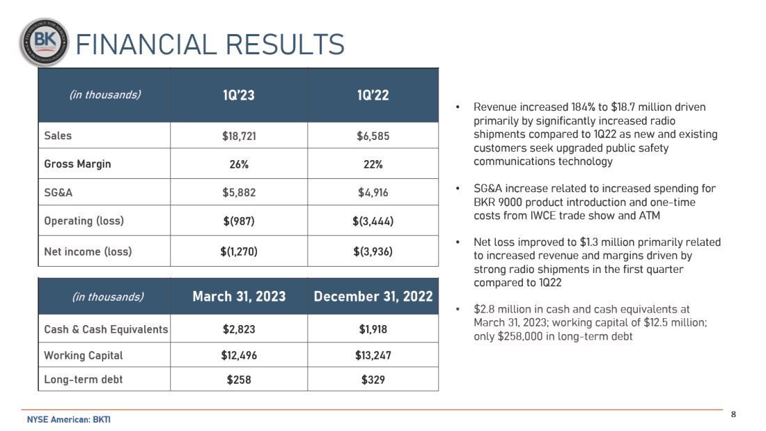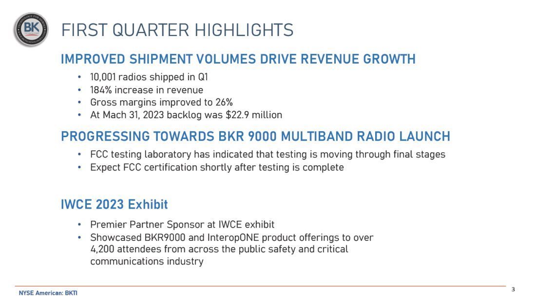 Turning to Slide 4, during the quarter, we saw a strong and steady order activity for our BKR 5000 as new and existing customers expand and upgrade their portable communications technology. Booking activity in the quarter remains strong and we ended the quarter with an order backlog of $22.9 million as of March 31, 2023.