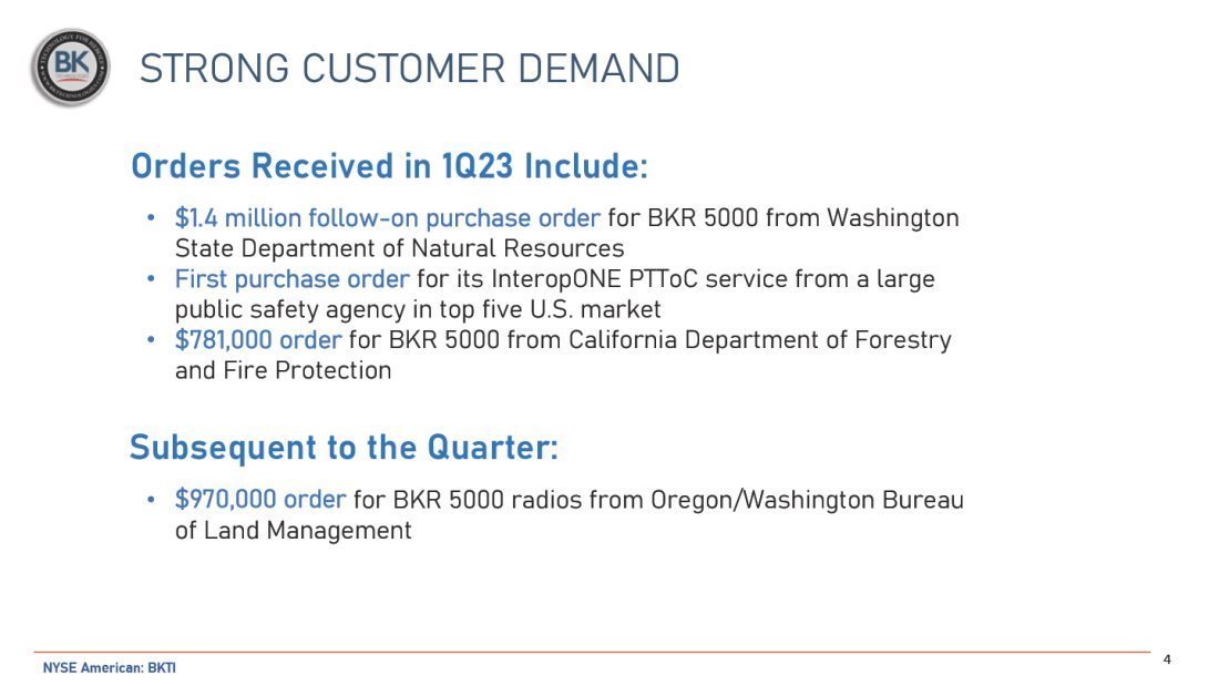 Recent orders include a $1.4 million follow on order from the Washington State Department of Natural Resources and a $781,000 order from the California Department of Forestry and Fire Protection. We have previously supported these two customers providing BK portable communications, equipment and technology, and their continued confidence in and reliance on our offerings is great to see.