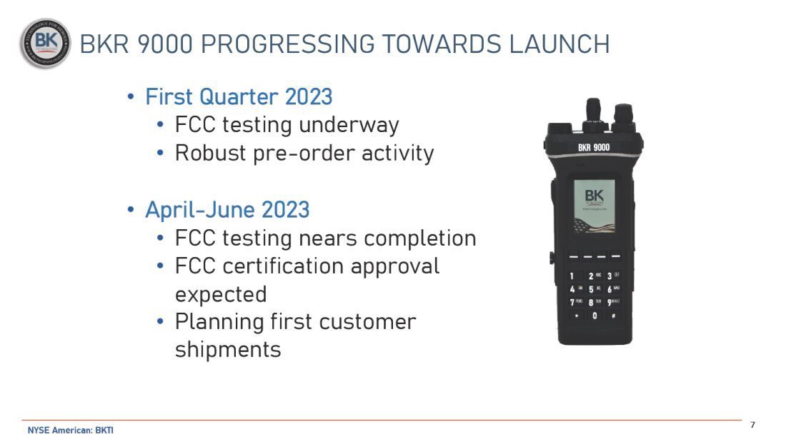 Slide 4, or sorry -- Slide 7. Slide 7 provides an update on the launch of our BKR 9000. During the first quarter, FCC testing was ongoing. Throughout the process, we stayed in close contact with the test lab and our understanding is that the final test phase is nearing completion, so we expect to receive FCC certification shortly. Once we receive certification, we will turn our attention to completing the transition from the development to manufacturing and shipping.