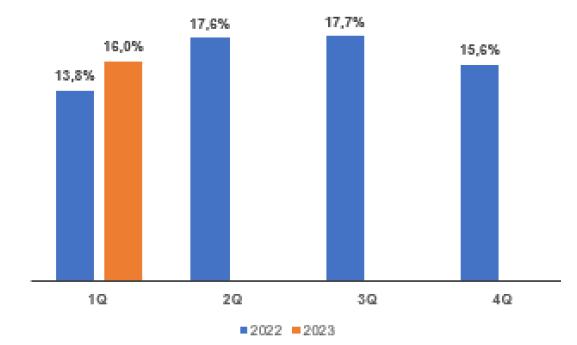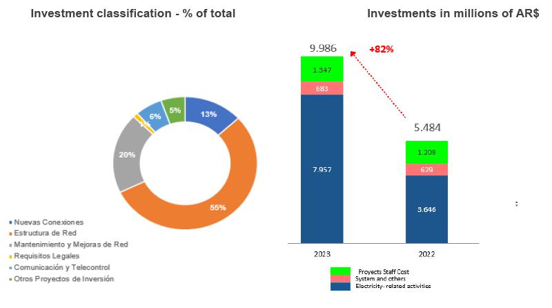 Investments in 1Q23 reached AR$ 9,986 million, which means an increase of 82% compared to the same period of the previous year, aimed at improving our network in accordance with “summer plan”. This reflects the effort made by Edenor despite having reduced the gross margin due to the tariff delay.