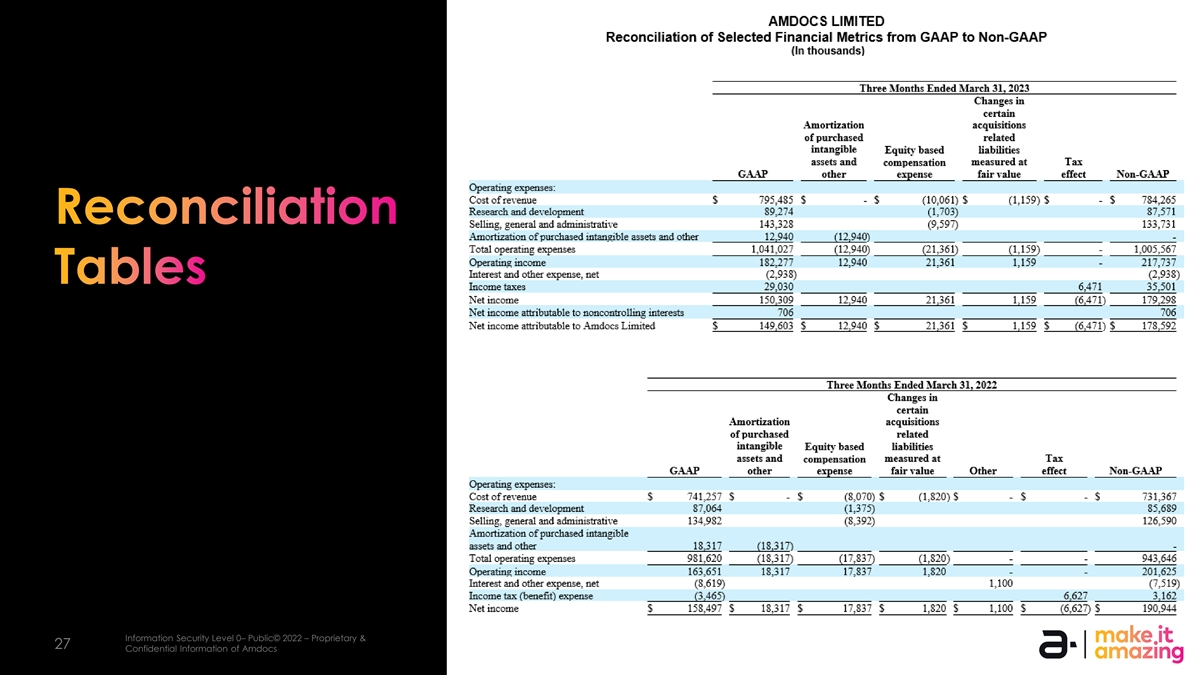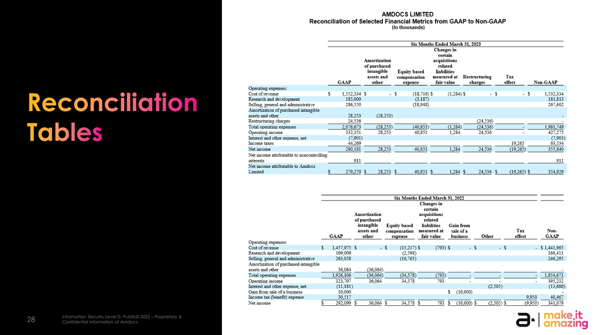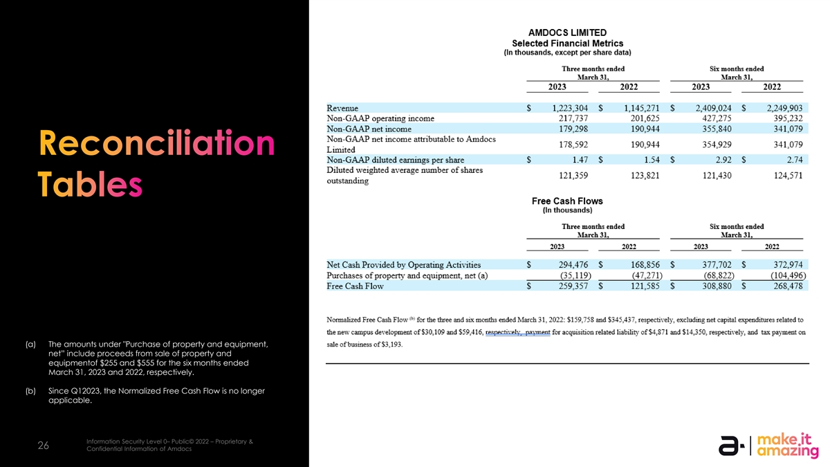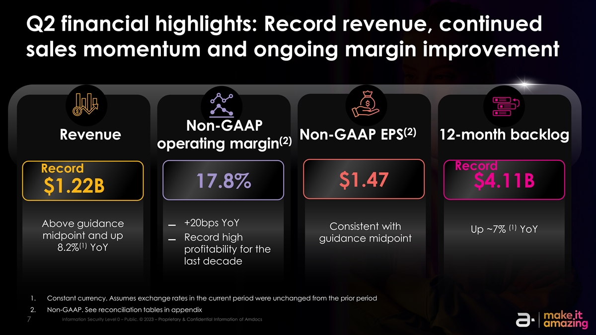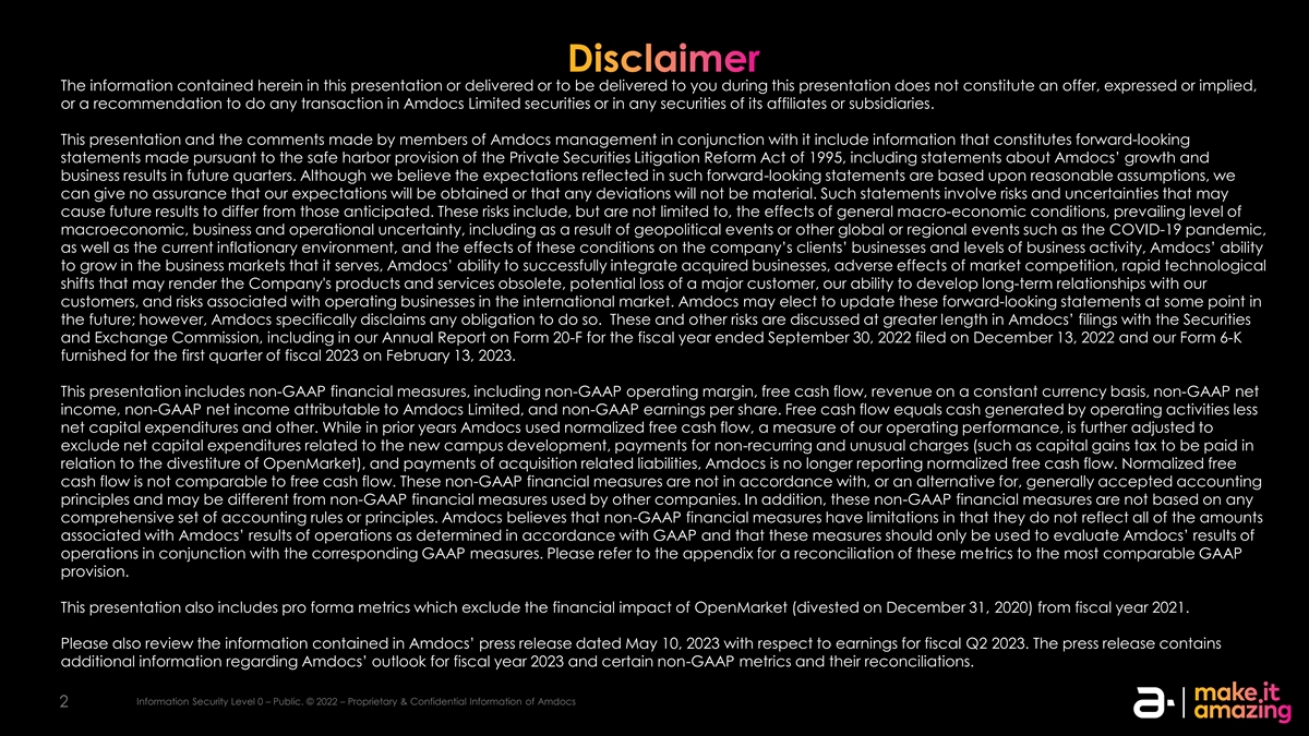On May 10, 2023 Amdocs Limited (Amdocs) issued a press release announcing financial results for the quarter ended March 31, 2023. A copy of the press release and the accompanying presentation are furnished as Exhibits 99.1 and 99.2 to this Report of Foreign Private Issuer on Form 6-K.
