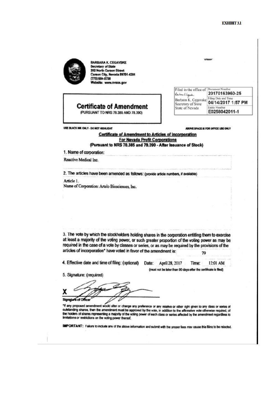 | 1. | I have reviewed this quarterly report on Form 10-Q of Artelo Biosciences, Inc.; |