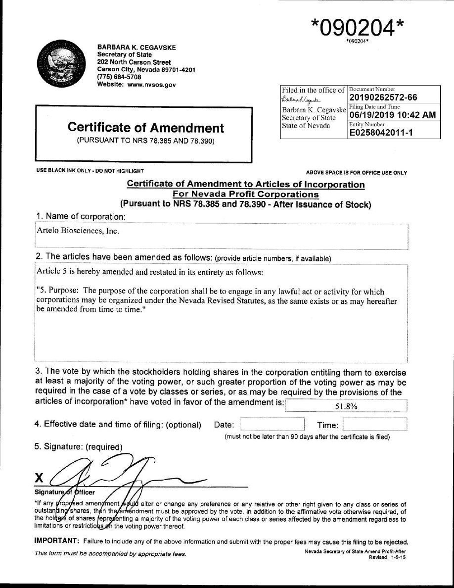 ARTELO BIOSCIENCES, INC.