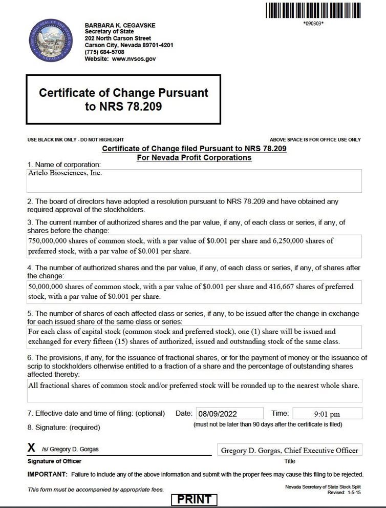 | The certification attached as Exhibits 32.1 that accompanies this Quarterly Report on Form 10-Q, is deemed furnished and not filed with the Securities and Exchange Commission and is not to be incorporated by reference into any filing of Artelo Biosciences, Inc. under the Securities Act of 1933, as amended, or the Securities Exchange Act of 1934, as amended, whether made before or after the date of this Quarterly Report on Form 10-Q, irrespective of any general incorporation language contained in such filing. |