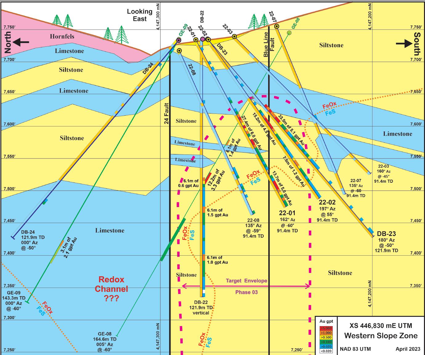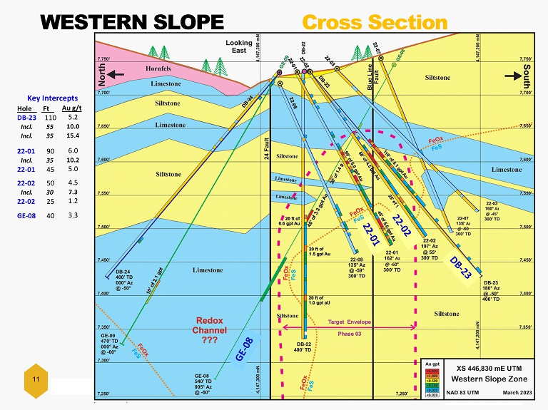11 WESTERN SLOPE Cross Section Hole Ft Au g/t DB-23 110 5.2 Incl. 55 10.0 Incl. 35 15.4 22-01 90 6.0 Incl. 35 10.2 22-01 45 5.0 22-02 50 4.5 Incl. 30 7.3 22-02 25 1.2 GE-08 40 3.3 Key Intercepts