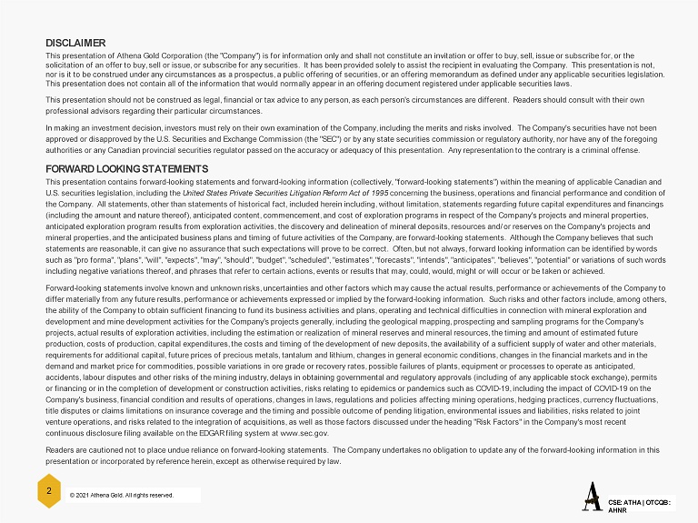 © 2021 Athena Gold. All rights reserved. CSE: ATHA | OTCQB : AHNR 2 DISCLAIMER This presentation of Athena Gold Corporation (the "Company") is for information only and shall not constitute an invitation or o ffer to buy, sell, issue or subscribe for, or the solicitation of an offer to buy, sell or issue, or subscribe for any securities. It has been provided solely to assist the r eci pient in evaluating the Company. This presentation is not, nor is it to be construed under any circumstances as a prospectus, a public offering of securities, or an offering memorandum as defined under any applicable securities legislation. This presentation does not contain all of the information that would normally appear in an offering document registered under ap plicable securities laws. This presentation should not be construed as legal, financial or tax advice to any person, as each person's circumstances are di fferent. Readers should consult with their own professional advisors regarding their particular circumstances. In making an investment decision, investors must rely on their own examination of the Company, including the merits and risks in volved. The Company's securities have not been approved or disapproved by the U.S. Securities and Exchange Commission (the "SEC") or by any state securities commission or regu latory authority, nor have any of the foregoing authorities or any Canadian provincial securities regulator passed on the accuracy or adequacy of this presentation. Any rep res entation to the contrary is a criminal offense. FORWARD LOOKING STATEMENTS This presentation contains forward - looking statements and forward - looking information (collectively, "forward - looking statements ") within the meaning of applicable Canadian and U.S. securities legislation, including the United States Private Securities Litigation Reform Act of 1995 concerning the business, operations and financial performance and condition of the Company. All statements, other than statements of historical fact, included herein including, without limitation, statem ent s regarding future capital expenditures and financings (including the amount and nature thereof), anticipated content, commencement, and cost of exploration programs in respect of the Company's projects and mineral properties, anticipated exploration program results from exploration activities, the discovery and delineation of mineral deposits, resou rce s and/or reserves on the Company's projects and mineral properties, and the anticipated business plans and timing of future activities of the Company, are forward - looking state ments. Although the Company believes that such statements are reasonable, it can give no assurance that such expectations will prove to be correct. Often, but not always, for ward looking information can be identified by words such as "pro forma", "plans", "will", "expects", "may", "should", "budget", "scheduled", "estimates", "forecasts", "intends", "a nticipates", "believes", "potential" or variations of such words including negative variations thereof, and phrases that refer to certain actions, events or results that may, could, would, m igh t or will occur or be taken or achieved. Forward - looking statements involve known and unknown risks, uncertainties and other factors which may cause the actual results, performance or achievements of the Company to differ materially from any future results, performance or achievements expressed or implied by the forward - looking information. Such risks and other factors include, among others, the ability of the Company to obtain sufficient financing to fund its business activities and plans, operating and technical dif ficulties in connection with mineral exploration and development and mine development activities for the Company's projects generally, including the geological mapping, prospecti ng and sampling programs for the Company's projects, actual results of exploration activities, including the estimation or realization of mineral reserves and mineral r eso urces, the timing and amount of estimated future production, costs of production, capital expenditures, the costs and timing of the development of new deposits, the availabil ity of a sufficient supply of water and other materials, requirements for additional capital, future prices of precious metals, tantalum and lithium, changes in general economic cond iti ons, changes in the financial markets and in the demand and market price for commodities, possible variations in ore grade or recovery rates, possible failures of plants, equ ipm ent or processes to operate as anticipated, accidents, labour disputes and other risks of the mining industry, delays in obtaining governmental and regulatory approvals (in cluding of any applicable stock exchange), permits or financing or in the completion of development or construction activities, risks relating to epidemics or pandemics such as CO VID - 19, including the impact of COVID - 19 on the Company's business, financial condition and results of operations, changes in laws, regulations and policies affecting mining op erations, hedging practices, currency fluctuations, title disputes or claims limitations on insurance coverage and the timing and possible outcome of pending litigation, environ men tal issues and liabilities, risks related to joint venture operations, and risks related to the integration of acquisitions, as well as those factors discussed under the headin g " Risk Factors" in the Company's most recent continuous disclosure filing available on the EDGAR filing system at www.sec.gov. Readers are cautioned not to place undue reliance on forward - looking statements. The Company undertakes no obligation to update any of the forward - looking information in this presentation or incorporated by reference herein, except as otherwise required by law.