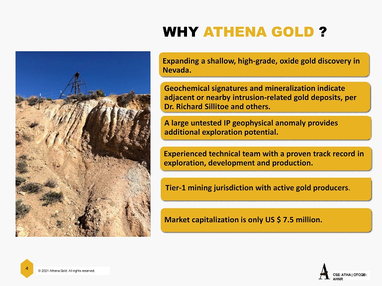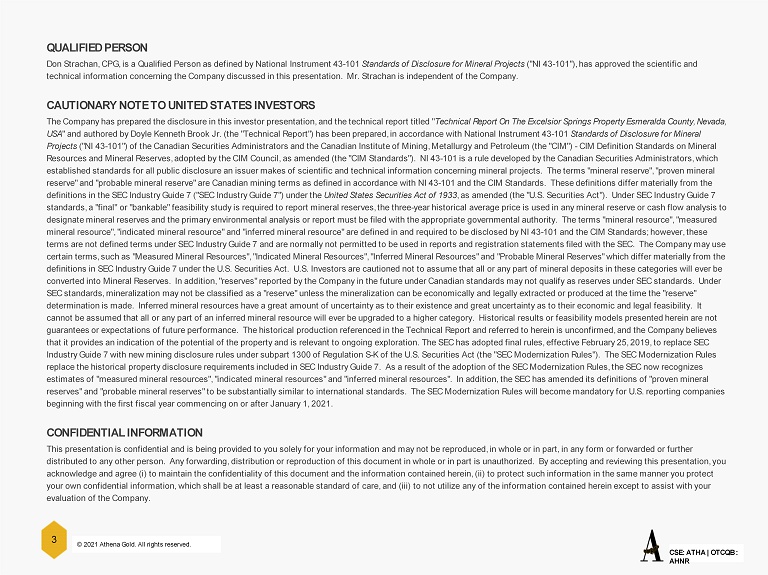 © 2021 Athena Gold. All rights reserved. CSE: ATHA | OTCQB : AHNR 3 QUALIFIED PERSON Don Strachan, CPG, is a Qualified Person as defined by National Instrument 43 - 101 Standards of Disclosure for Mineral Projects ("NI 43 - 101"), has approved the scientific and technical information concerning the Company discussed in this presentation. Mr. Strachan is independent of the Company. CAUTIONARY NOTE TO UNITED STATES INVESTORS The Company has prepared the disclosure in this investor presentation, and the technical report titled " Technical Report On The Excelsior Springs Property Esmeralda County, Nevada, USA " and authored by Doyle Kenneth Brook Jr. (the "Technical Report") has been prepared, in accordance with National Instrument 43 - 101 Standards of Disclosure for Mineral Projects ("NI 43 - 101") of the Canadian Securities Administrators and the Canadian Institute of Mining, Metallurgy and Petroleum (the "CI M") - CIM Definition Standards on Mineral Resources and Mineral Reserves, adopted by the CIM Council, as amended (the "CIM Standards") . NI 43 - 101 is a rule developed by the Canadian Securities Administrators, which established standards for all public disclosure an issuer makes of scientific and technical information concerning mineral pr oje cts. The terms "mineral reserve", "proven mineral reserve" and "probable mineral reserve" are Canadian mining terms as defined in accordance with NI 43 - 101 and the CIM Standards. These definitions differ materially from the definitions in the SEC Industry Guide 7 ("SEC Industry Guide 7") under the United States Securities Act of 1933 , as amended (the "U.S. Securities Act"). Under SEC Industry Guide 7 standards, a "final" or "bankable" feasibility study is required to report mineral reserves, the three - year historical average p rice is used in any mineral reserve or cash flow analysis to designate mineral reserves and the primary environmental analysis or report must be filed with the appropriate governmental a uth ority. The terms "mineral resource", "measured mineral resource", "indicated mineral resource" and "inferred mineral resource" are defined in and required to be disclosed b y N I 43 - 101 and the CIM Standards; however, these terms are not defined terms under SEC Industry Guide 7 and are normally not permitted to be used in reports and registration sta tements filed with the SEC. The Company may use certain terms, such as "Measured Mineral Resources", "Indicated Mineral Resources", "Inferred Mineral Resources" and "Probabl e M ineral Reserves" which differ materially from the definitions in SEC Industry Guide 7 under the U.S. Securities Act. U.S. Investors are cautioned not to assume that all or an y p art of mineral deposits in these categories will ever be converted into Mineral Reserves. In addition, "reserves" reported by the Company in the future under Canadian standards may not qualify as reserves under SEC standards. Under SEC standards, mineralization may not be classified as a "reserve" unless the mineralization can be economically and legally ext racted or produced at the time the "reserve" determination is made. Inferred mineral resources have a great amount of uncertainty as to their existence and great uncerta int y as to their economic and legal feasibility. It cannot be assumed that all or any part of an inferred mineral resource will ever be upgraded to a higher category. Historica l r esults or feasibility models presented herein are not guarantees or expectations of future performance. The historical production referenced in the Technical Report and referred to herein is unconfirmed, and the Company believes that it provides an indication of the potential of the property and is relevant to ongoing exploration. The SEC has adopted f ina l rules, effective February 25, 2019, to replace SEC Industry Guide 7 with new mining disclosure rules under subpart 1300 of Regulation S - K of the U.S. Securities Act (the "SEC Mode rnization Rules"). The SEC Modernization Rules replace the historical property disclosure requirements included in SEC Industry Guide 7. As a result of the adoption of the SE C Modernization Rules, the SEC now recognizes estimates of "measured mineral resources", "indicated mineral resources" and "inferred mineral resources". In addition, the SEC has amended its definitions of "proven mineral reserves" and "probable mineral reserves" to be substantially similar to international standards. The SEC Modernization Rule s w ill become mandatory for U.S. reporting companies beginning with the first fiscal year commencing on or after January 1, 2021. CONFIDENTIAL INFORMATION This presentation is confidential and is being provided to you solely for your information and may not be reproduced, in whol e o r in part, in any form or forwarded or further distributed to any other person. Any forwarding, distribution or reproduction of this document in whole or in part is unauth ori zed. By accepting and reviewing this presentation, you acknowledge and agree (i) to maintain the confidentiality of this document and the information contained herein, (ii) to prot ect such information in the same manner you protect your own confidential information, which shall be at least a reasonable standard of care, and (iii) to not utilize any of the in formation contained herein except to assist with your evaluation of the Company.