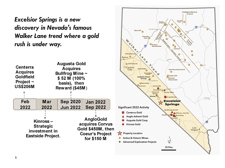 5 Excelsior Springs is a new discovery in Nevada's famous Walker Lane trend where a gold rush is under way. Feb 2022 Centerra Acquires Goldfield Project ~ US$206M Mar 2022 Kinross – Strategic investment in Eastside Project. Sep 2020 Jun 2022 Augusta Gold Acquires Bullfrog Mine ~ $ 52 M (100% basis), then Reward ($45M ) Jan 2022 Sep 2022 AngloGold acquires Corvus Gold $450M, then Coeur’s Project for $150 M